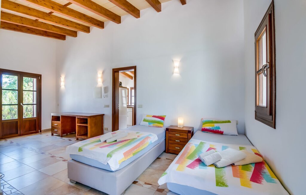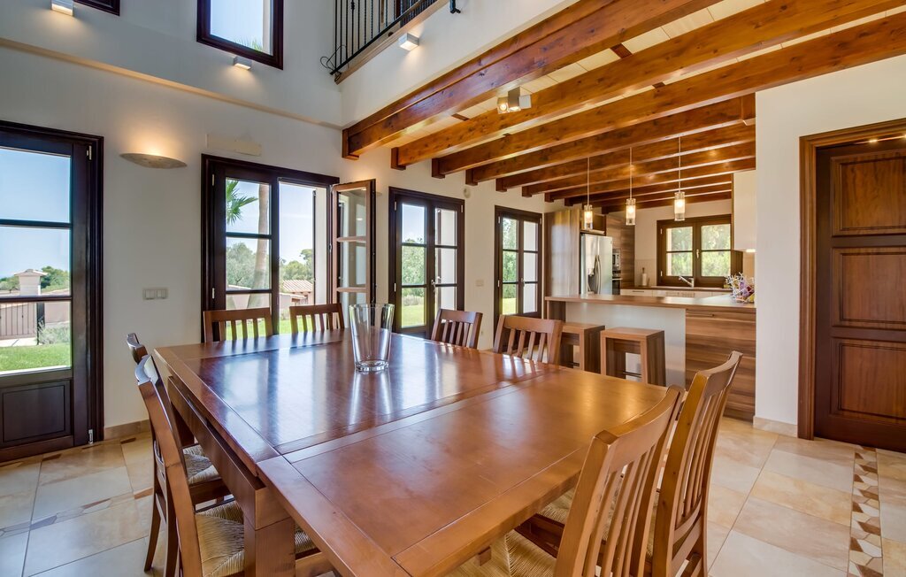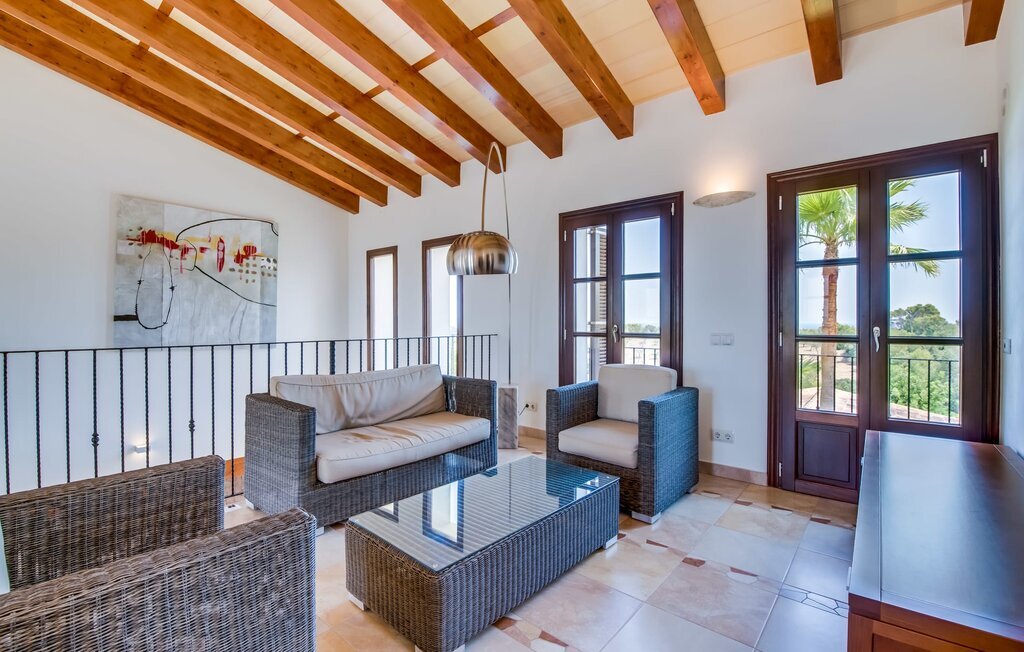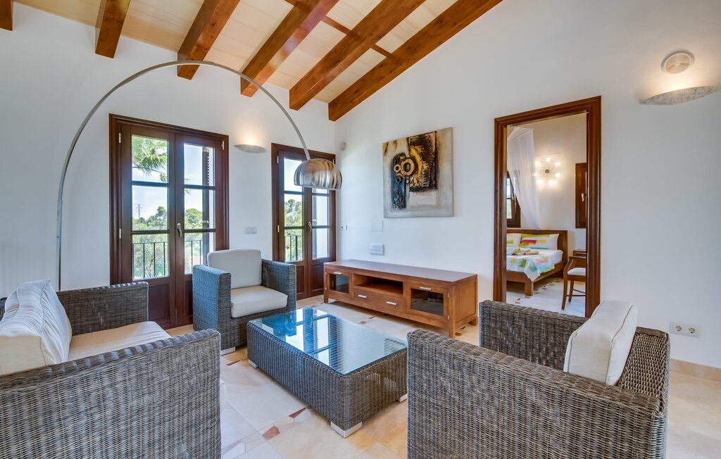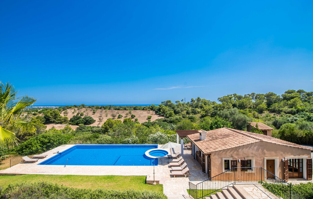 Située sur une colline en pente douce, elle est entourée de palmiers et de pelouses bien entretenues et offre une vue paisible sur le paysage pittoresque de Majorque. L'accès est pratique, des places de parking sont disponibles directement à la finca. Quelques marches mènent à une zone de piscine époustouflante, qui dispose d'une maison d'hôtes avec salle de bain extérieure et cuisine extérieure, et qui complète parfaitement la résidence principale. La vaste piscine, entourée de chaises longues, invite à la détente et au repos.