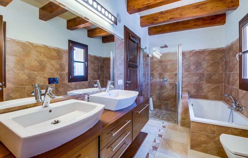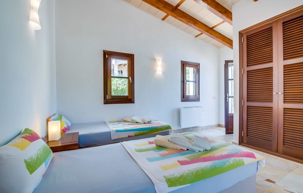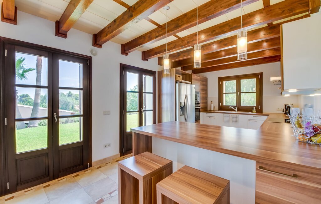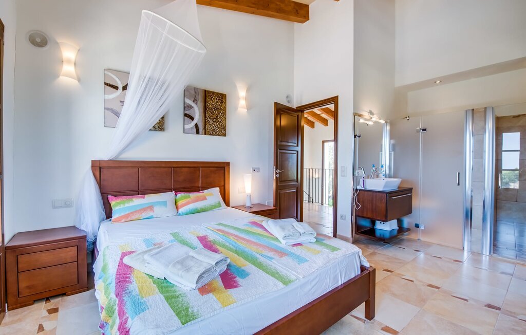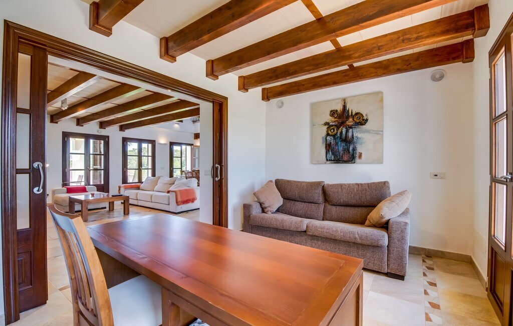 Située sur une colline en pente douce, elle est entourée de palmiers et de pelouses bien entretenues et offre une vue paisible sur le paysage pittoresque de Majorque. L'accès est pratique, des places de parking sont disponibles directement à la finca. Quelques marches mènent à une zone de piscine époustouflante, qui dispose d'une maison d'hôtes avec salle de bain extérieure et cuisine extérieure, et qui complète parfaitement la résidence principale. La vaste piscine, entourée de chaises longues, invite à la détente et au repos.