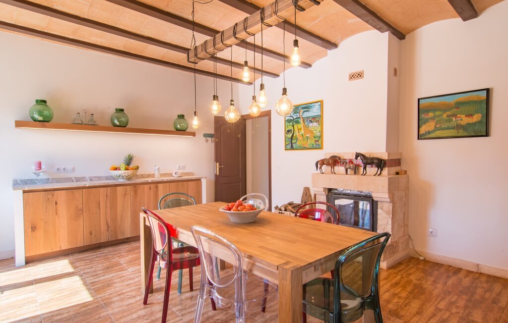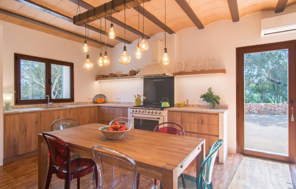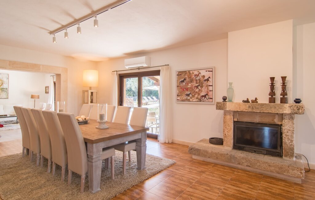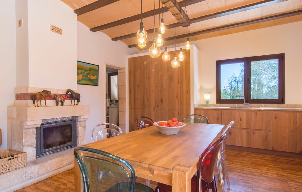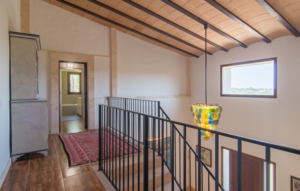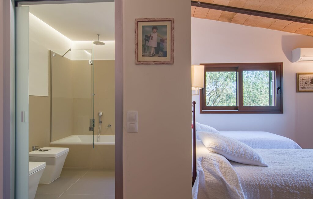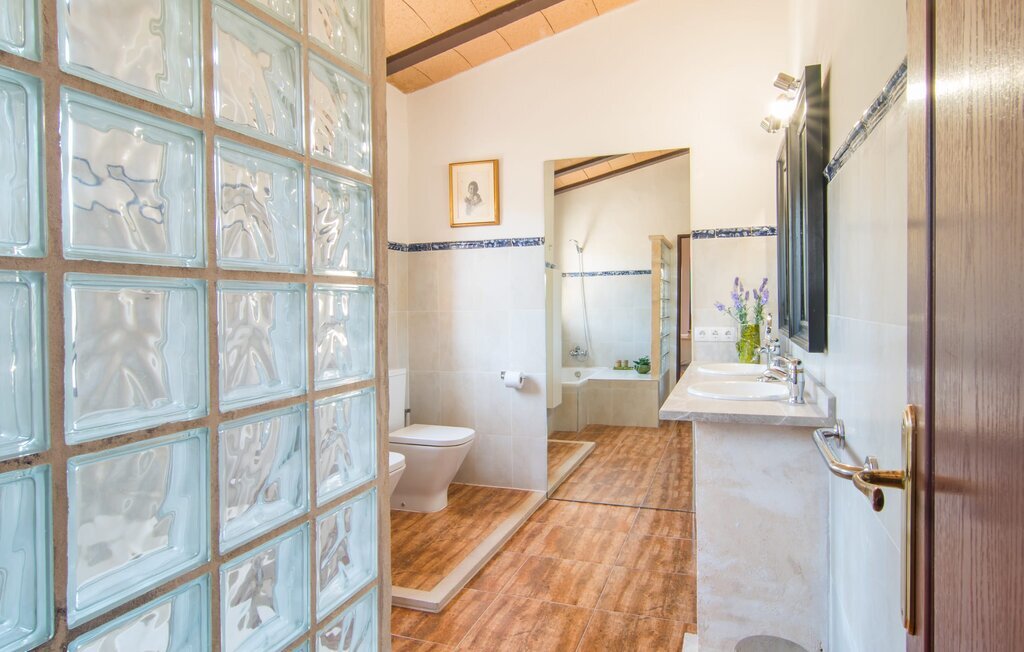 La détente est l'activité principale au programme, de sorte que le design intérieur et extérieur exceptionnellement chic répond toujours à vos besoins. La pièce maîtresse est le salon combiné. Cette pièce à vivre inondée de lumière et dotée de fenêtres allant du sol au plafond se divise en un salon confortable avec un canapé et un coin TV, une salle à manger élégante devant une agréable cheminée et une bibliothèque rustique, également équipée d'une Smart TV. Autant d'endroits préférés à choisir ! La terre cuite, les sols en bois, les plafonds courbés et les jupes soulignent l'atmosphère naturelle de l'intérieur. Vous découvrirez également cette qualité dans la cuisine entièrement équipée avec des meubles en bois de qualité. En même temps, elle ressemble à une ancienne ferme avec sa deuxième cheminée : celle-ci constituait autrefois le centre social, car elle était souvent la seule pièce chauffée. Après de longues journées de liberté, la fatigue se fait sentir à un moment donné Vous pouvez alors vous retirer dans l'une des quatre chambres à coucher climatisées au total, situées pour la plupart à l'étage supérieur (une chambre à coucher avec salle de bain se trouve au rez-de-chaussée). Au premier étage, chacune des chambres chics avec une vue fantastique dispose également d'une salle de bains avec douche ou baignoire de plain-pied. Le grand balcon couvert, qui donne sur le jardin et la piscine, est l'endroit idéal pour se retirer et lire un bon livre. Soyons honnêtes, y a-t-il quelque chose sur lequel vous devriez faire des compromis ? Nous sommes absolument ravis de Can Madis.