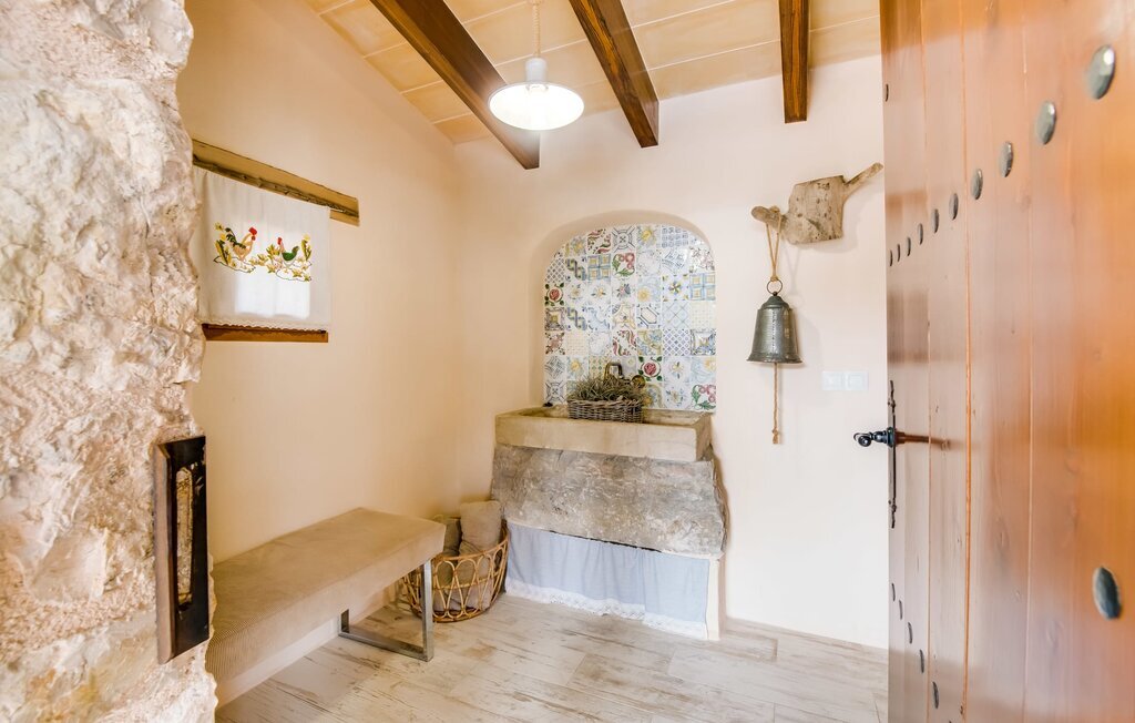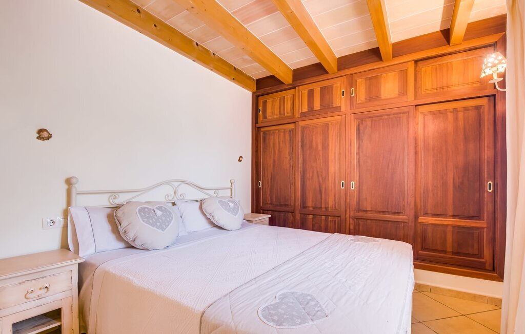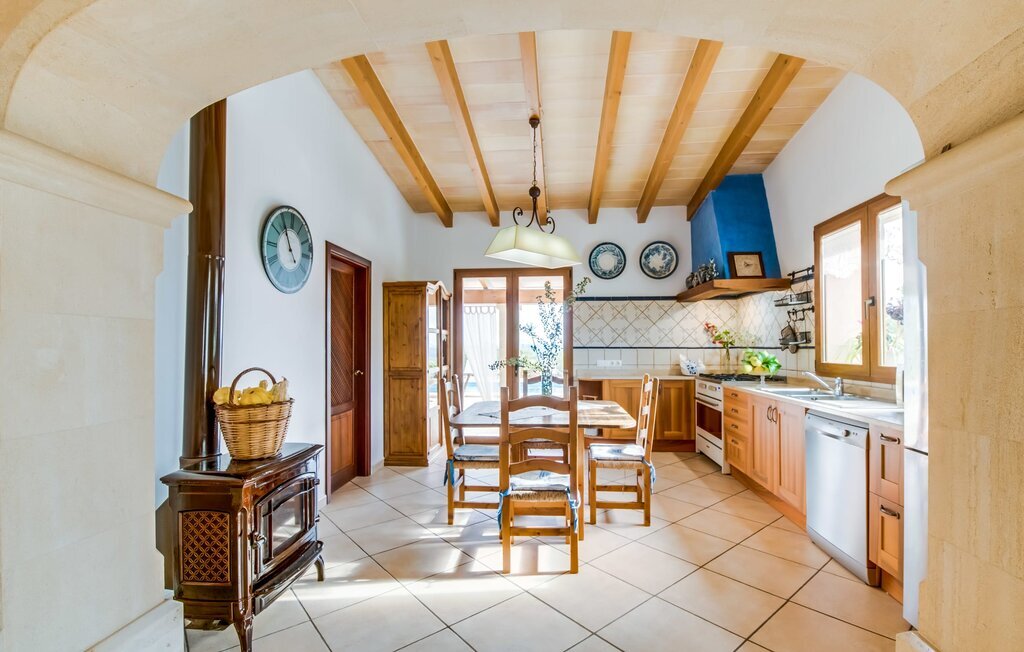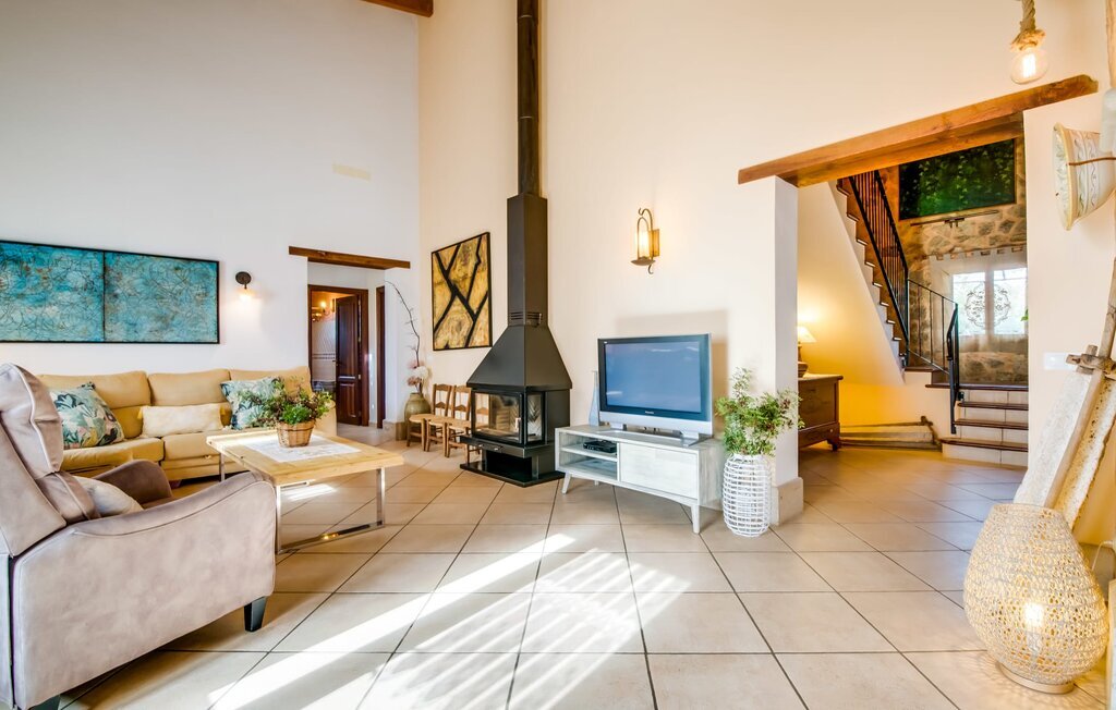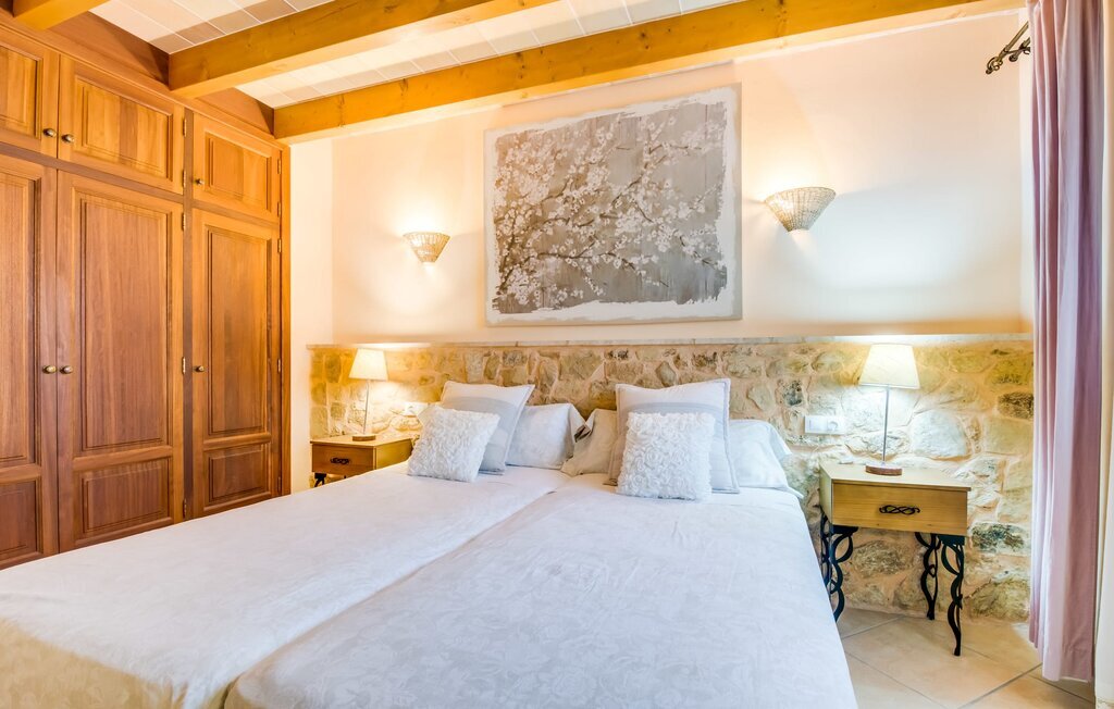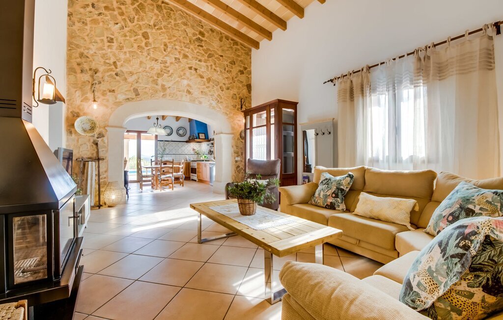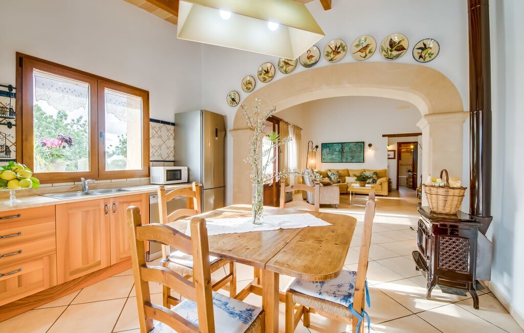 De la terrasse couverte, nous accédons à l'intérieur de la villa ; C'est une agréable surprise que cette maison en pierre de taille à l'apparence si délicate nous accueille avec un intérieur si luxuriant et lumineux. Allons dans le salon ; L'énorme hauteur de plafond donne à l'ensemble du salon une belle atmosphère de liberté de mouvement. Sur la gauche, derrière un paravent, se trouve le confortable coin canapé beige à côté de la cheminée intime et de la télévision LCD moderne. Les tableaux abstraits mais subtils confèrent une atmosphère contemporaine et moderne à cette pièce baignée de lumière. Un grand arc en anse de panier recouvert de grès mène à l'espace cuisine légèrement séparé. Une cuisine de campagne en bois rustique, entièrement équipée, nous accueille ; Exactement ce que vous espériez pour vous permettre de cuisiner vous-même en toute décontraction pendant vos vacances en villa. Cette pièce est équipée, entre autres, d'une grande cuisinière et d'un poêle en faïence antique. Au centre de la pièce se trouve une table à manger en bois. La cuisine dispose en outre d'une porte donnant sur l'espace extérieur particulièrement pratique pour prendre ses repas en plein air. Au total, il y a trois chambres à coucher confortables et spacieuses ; leurs armoires encastrées avec des portes en bois massif offrent suffisamment d'espace de rangement pour toute votre garde-robe de vacances. Les chambres à coucher confortables sont équipées soit de deux lits simples de 1,05 x 2 m ou de 1 x 2 m, soit d'un lit double de 1,80 m de large. La chambre individuelle est particulièrement adaptée aux enfants et deux lits bébé sont également disponibles pour nos plus petits hôtes. Deux élégantes salles de bains sont partagées par tous les hôtes, l'une avec baignoire et l'autre avec douche. En visitant l'intérieur et l'extérieur de la maison, vous découvrirez de nombreux éléments décoratifs qui contribuent à l'ambiance de cette finca. Jusqu'au moindre détail, tout a été arrangé avec tant d'amour pour les hôtes que vous vous sentirez immédiatement comme chez vous en entrant et que vous pourrez profiter de la tranquillité et du charme harmonieux de Bon Any.