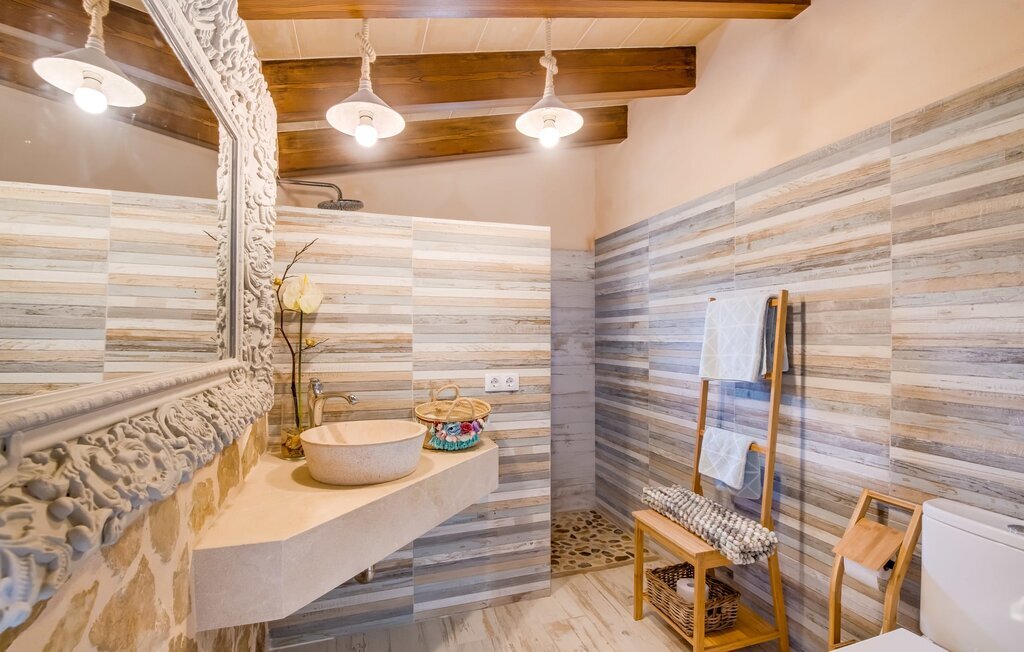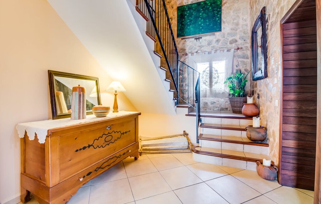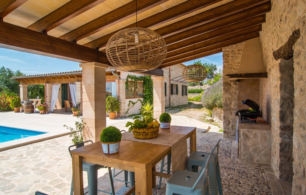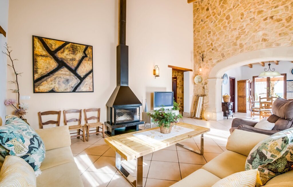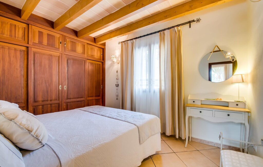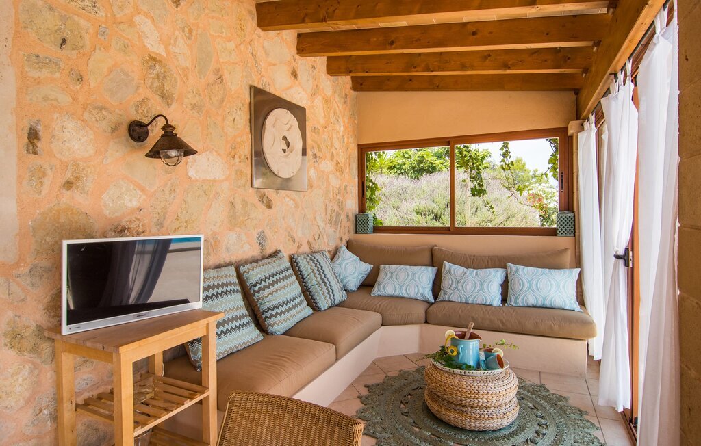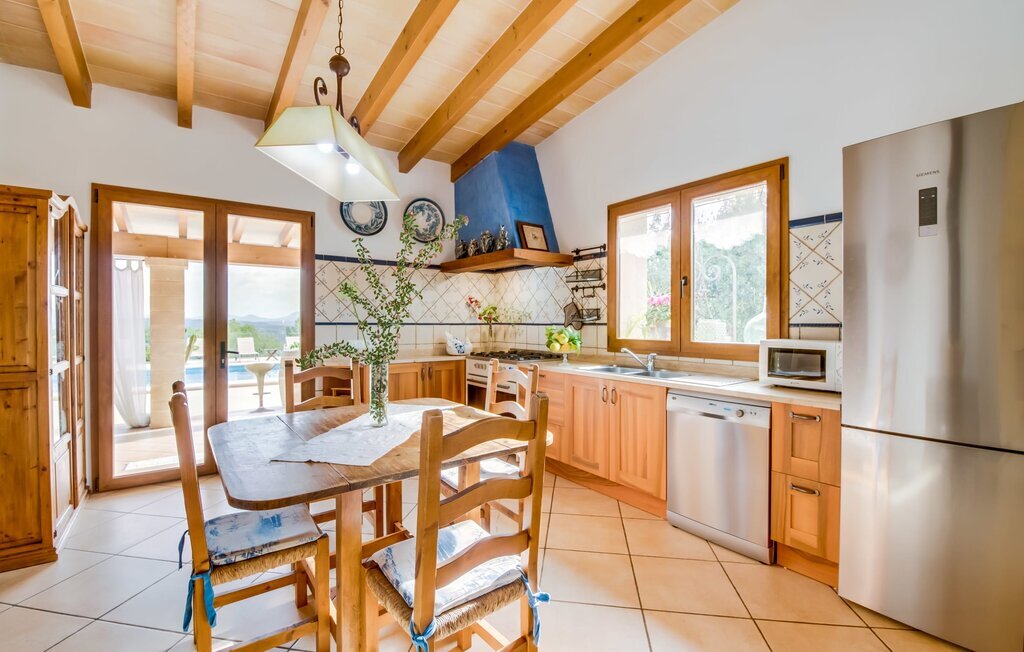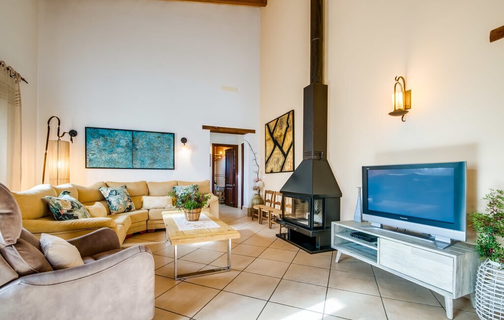 De la terrasse couverte, nous accédons à l'intérieur de la villa ; C'est une agréable surprise que cette maison en pierre de taille à l'apparence si délicate nous accueille avec un intérieur si luxuriant et lumineux. Allons dans le salon ; L'énorme hauteur de plafond donne à l'ensemble du salon une belle atmosphère de liberté de mouvement. Sur la gauche, derrière un paravent, se trouve le confortable coin canapé beige à côté de la cheminée intime et de la télévision LCD moderne. Les tableaux abstraits mais subtils confèrent une atmosphère contemporaine et moderne à cette pièce baignée de lumière. Un grand arc en anse de panier recouvert de grès mène à l'espace cuisine légèrement séparé. Une cuisine de campagne en bois rustique, entièrement équipée, nous accueille ; Exactement ce que vous espériez pour vous permettre de cuisiner vous-même en toute décontraction pendant vos vacances en villa. Cette pièce est équipée, entre autres, d'une grande cuisinière et d'un poêle en faïence antique. Au centre de la pièce se trouve une table à manger en bois. La cuisine dispose en outre d'une porte donnant sur l'espace extérieur particulièrement pratique pour prendre ses repas en plein air. Au total, il y a trois chambres à coucher confortables et spacieuses ; leurs armoires encastrées avec des portes en bois massif offrent suffisamment d'espace de rangement pour toute votre garde-robe de vacances. Les chambres à coucher confortables sont équipées soit de deux lits simples de 1,05 x 2 m ou de 1 x 2 m, soit d'un lit double de 1,80 m de large. La chambre individuelle est particulièrement adaptée aux enfants et deux lits bébé sont également disponibles pour nos plus petits hôtes. Deux élégantes salles de bains sont partagées par tous les hôtes, l'une avec baignoire et l'autre avec douche. En visitant l'intérieur et l'extérieur de la maison, vous découvrirez de nombreux éléments décoratifs qui contribuent à l'ambiance de cette finca. Jusqu'au moindre détail, tout a été arrangé avec tant d'amour pour les hôtes que vous vous sentirez immédiatement comme chez vous en entrant et que vous pourrez profiter de la tranquillité et du charme harmonieux de Bon Any.