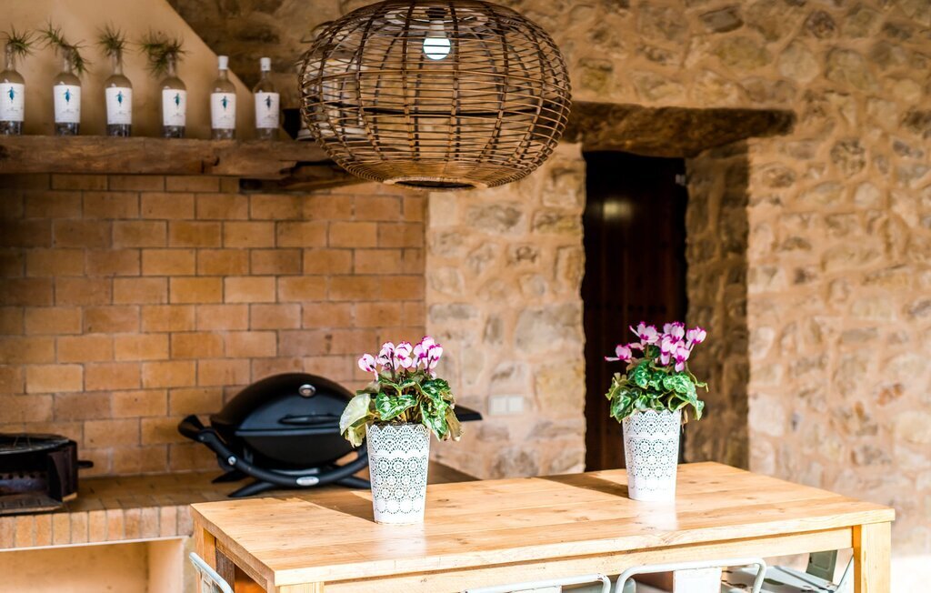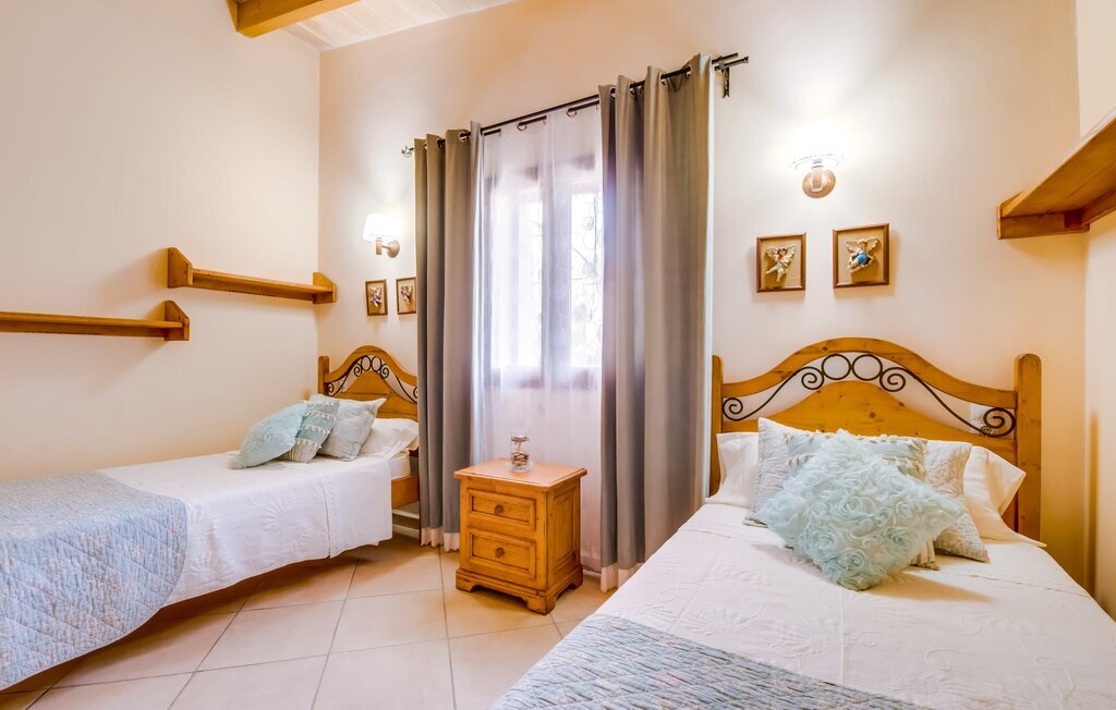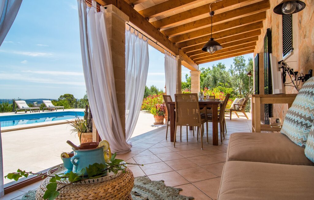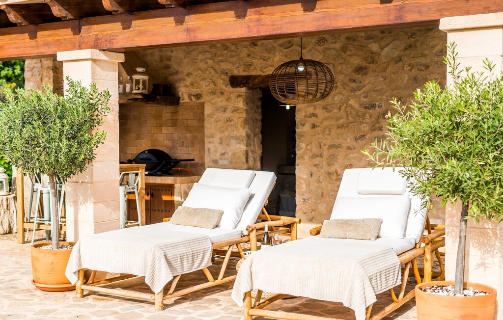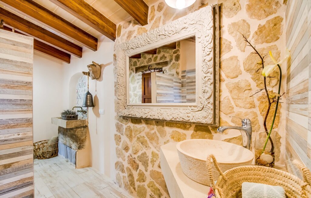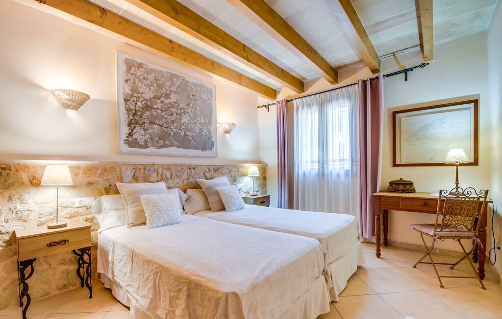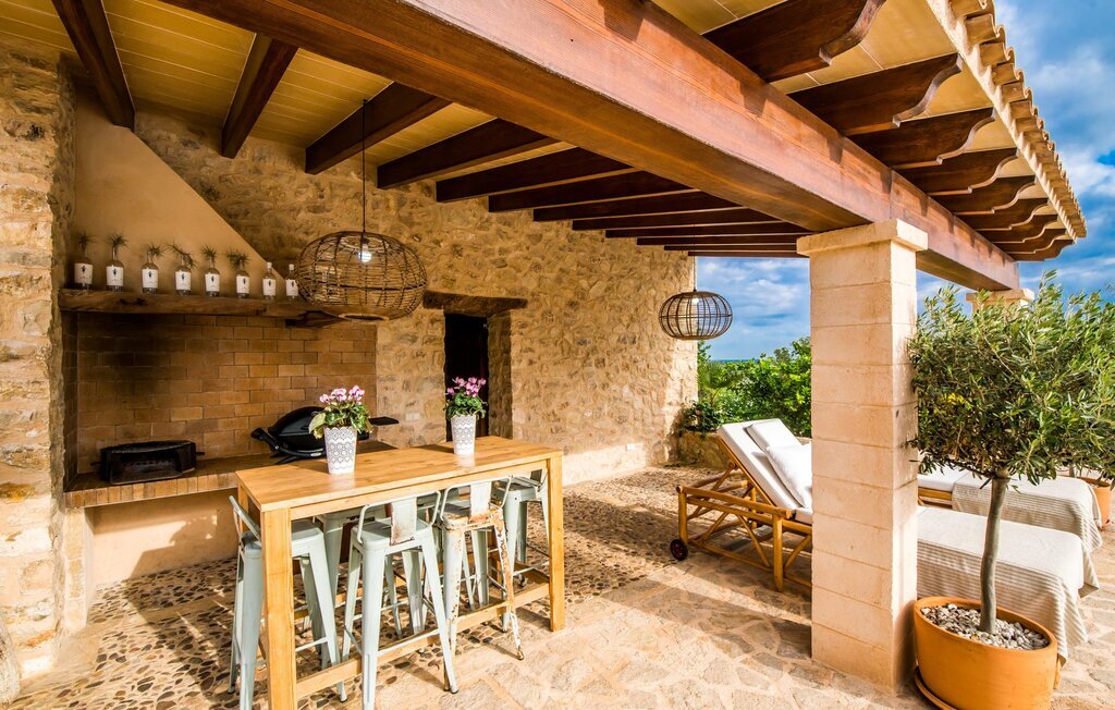 De la terrasse couverte, nous accédons à l'intérieur de la villa ; C'est une agréable surprise que cette maison en pierre de taille à l'apparence si délicate nous accueille avec un intérieur si luxuriant et lumineux. Allons dans le salon ; L'énorme hauteur de plafond donne à l'ensemble du salon une belle atmosphère de liberté de mouvement. Sur la gauche, derrière un paravent, se trouve le confortable coin canapé beige à côté de la cheminée intime et de la télévision LCD moderne. Les tableaux abstraits mais subtils confèrent une atmosphère contemporaine et moderne à cette pièce baignée de lumière. Un grand arc en anse de panier recouvert de grès mène à l'espace cuisine légèrement séparé. Une cuisine de campagne en bois rustique, entièrement équipée, nous accueille ; Exactement ce que vous espériez pour vous permettre de cuisiner vous-même en toute décontraction pendant vos vacances en villa. Cette pièce est équipée, entre autres, d'une grande cuisinière et d'un poêle en faïence antique. Au centre de la pièce se trouve une table à manger en bois. La cuisine dispose en outre d'une porte donnant sur l'espace extérieur particulièrement pratique pour prendre ses repas en plein air. Au total, il y a trois chambres à coucher confortables et spacieuses ; leurs armoires encastrées avec des portes en bois massif offrent suffisamment d'espace de rangement pour toute votre garde-robe de vacances. Les chambres à coucher confortables sont équipées soit de deux lits simples de 1,05 x 2 m ou de 1 x 2 m, soit d'un lit double de 1,80 m de large. La chambre individuelle est particulièrement adaptée aux enfants et deux lits bébé sont également disponibles pour nos plus petits hôtes. Deux élégantes salles de bains sont partagées par tous les hôtes, l'une avec baignoire et l'autre avec douche. En visitant l'intérieur et l'extérieur de la maison, vous découvrirez de nombreux éléments décoratifs qui contribuent à l'ambiance de cette finca. Jusqu'au moindre détail, tout a été arrangé avec tant d'amour pour les hôtes que vous vous sentirez immédiatement comme chez vous en entrant et que vous pourrez profiter de la tranquillité et du charme harmonieux de Bon Any.