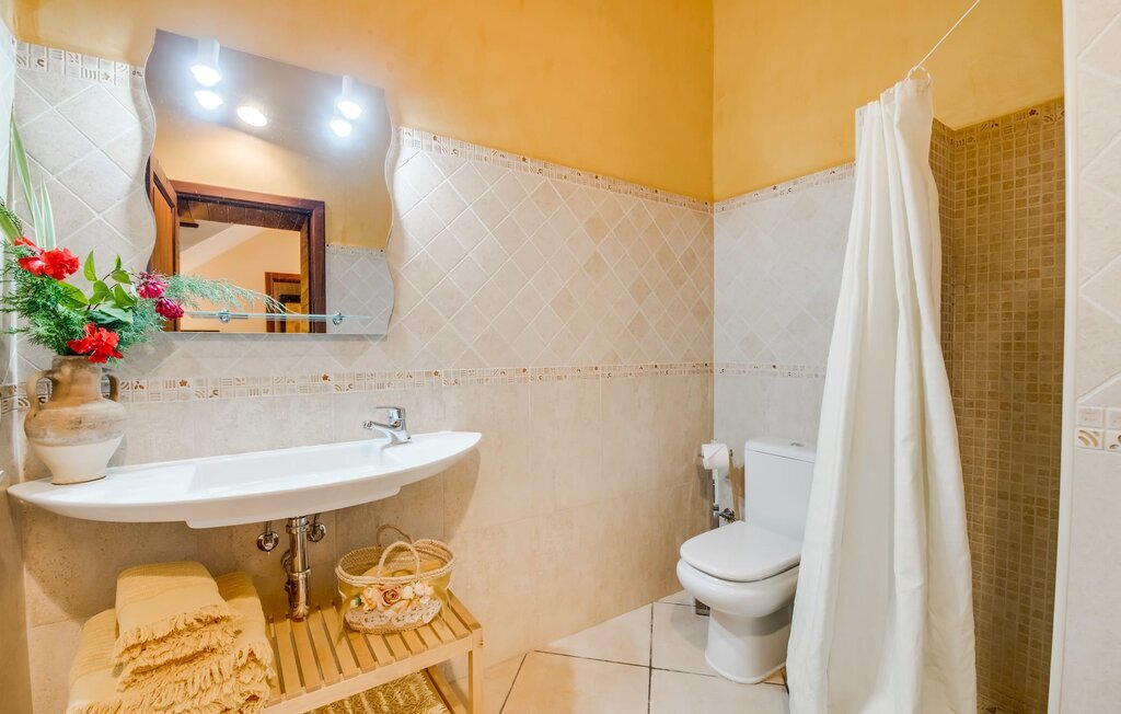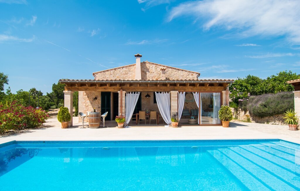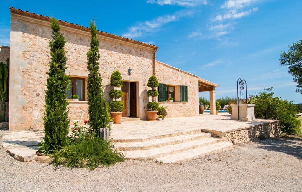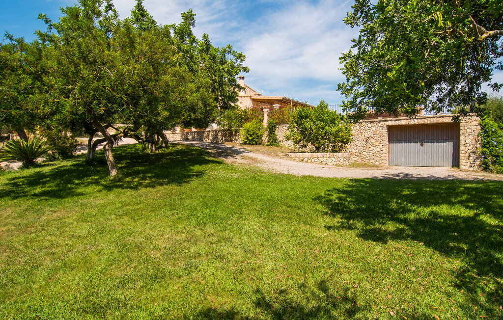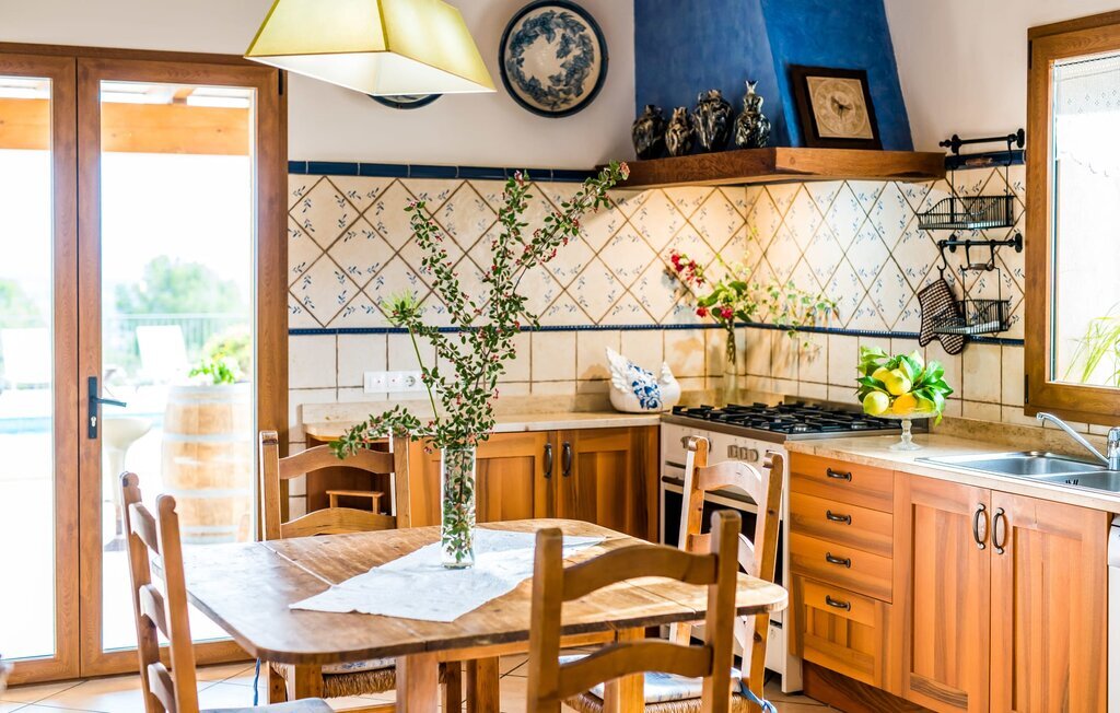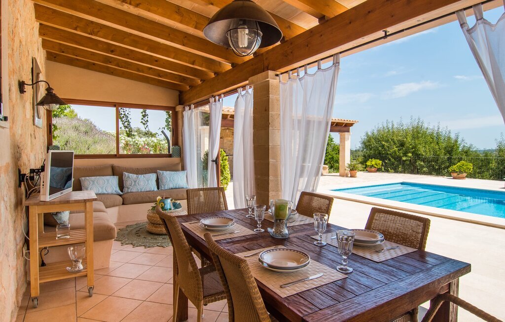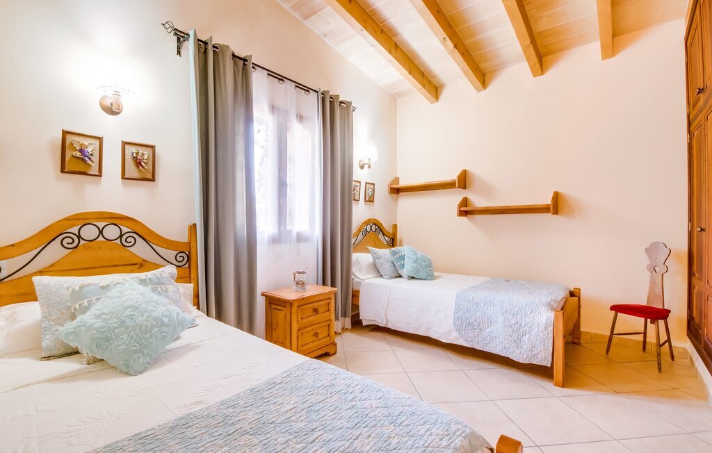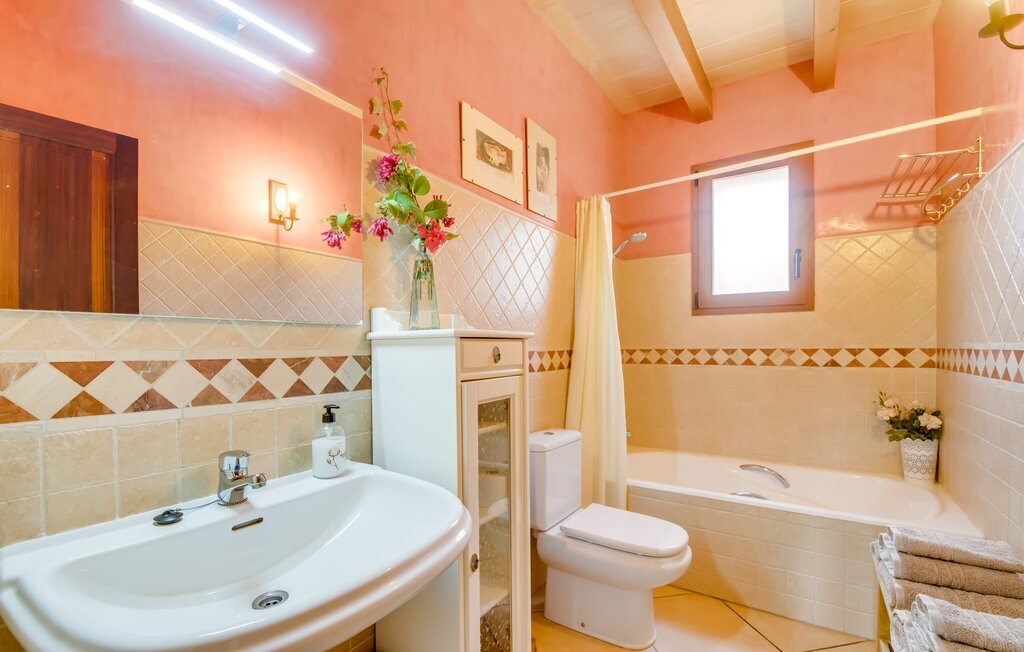 De la terrasse couverte, nous accédons à l'intérieur de la villa ; C'est une agréable surprise que cette maison en pierre de taille à l'apparence si délicate nous accueille avec un intérieur si luxuriant et lumineux. Allons dans le salon ; L'énorme hauteur de plafond donne à l'ensemble du salon une belle atmosphère de liberté de mouvement. Sur la gauche, derrière un paravent, se trouve le confortable coin canapé beige à côté de la cheminée intime et de la télévision LCD moderne. Les tableaux abstraits mais subtils confèrent une atmosphère contemporaine et moderne à cette pièce baignée de lumière. Un grand arc en anse de panier recouvert de grès mène à l'espace cuisine légèrement séparé. Une cuisine de campagne en bois rustique, entièrement équipée, nous accueille ; Exactement ce que vous espériez pour vous permettre de cuisiner vous-même en toute décontraction pendant vos vacances en villa. Cette pièce est équipée, entre autres, d'une grande cuisinière et d'un poêle en faïence antique. Au centre de la pièce se trouve une table à manger en bois. La cuisine dispose en outre d'une porte donnant sur l'espace extérieur particulièrement pratique pour prendre ses repas en plein air. Au total, il y a trois chambres à coucher confortables et spacieuses ; leurs armoires encastrées avec des portes en bois massif offrent suffisamment d'espace de rangement pour toute votre garde-robe de vacances. Les chambres à coucher confortables sont équipées soit de deux lits simples de 1,05 x 2 m ou de 1 x 2 m, soit d'un lit double de 1,80 m de large. La chambre individuelle est particulièrement adaptée aux enfants et deux lits bébé sont également disponibles pour nos plus petits hôtes. Deux élégantes salles de bains sont partagées par tous les hôtes, l'une avec baignoire et l'autre avec douche. En visitant l'intérieur et l'extérieur de la maison, vous découvrirez de nombreux éléments décoratifs qui contribuent à l'ambiance de cette finca. Jusqu'au moindre détail, tout a été arrangé avec tant d'amour pour les hôtes que vous vous sentirez immédiatement comme chez vous en entrant et que vous pourrez profiter de la tranquillité et du charme harmonieux de Bon Any.