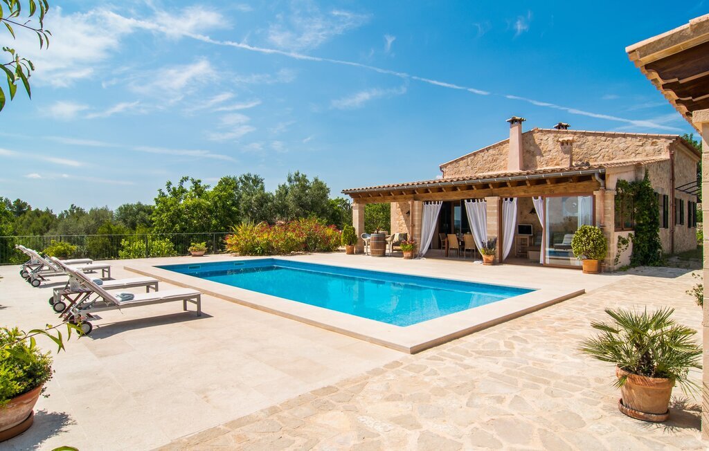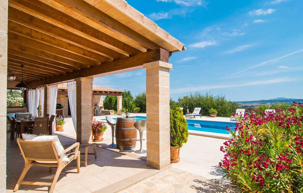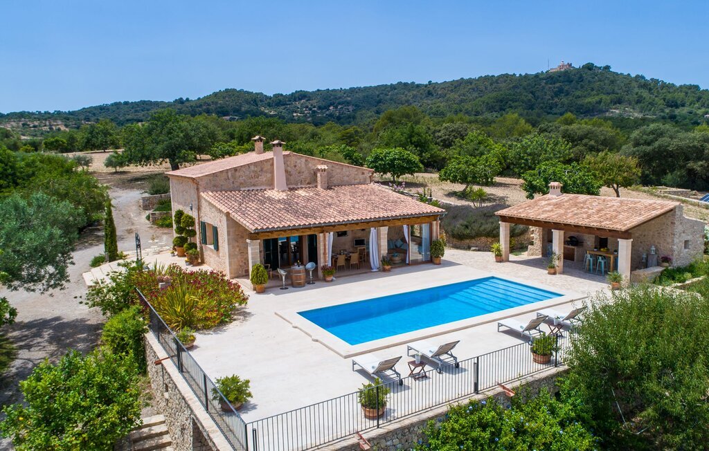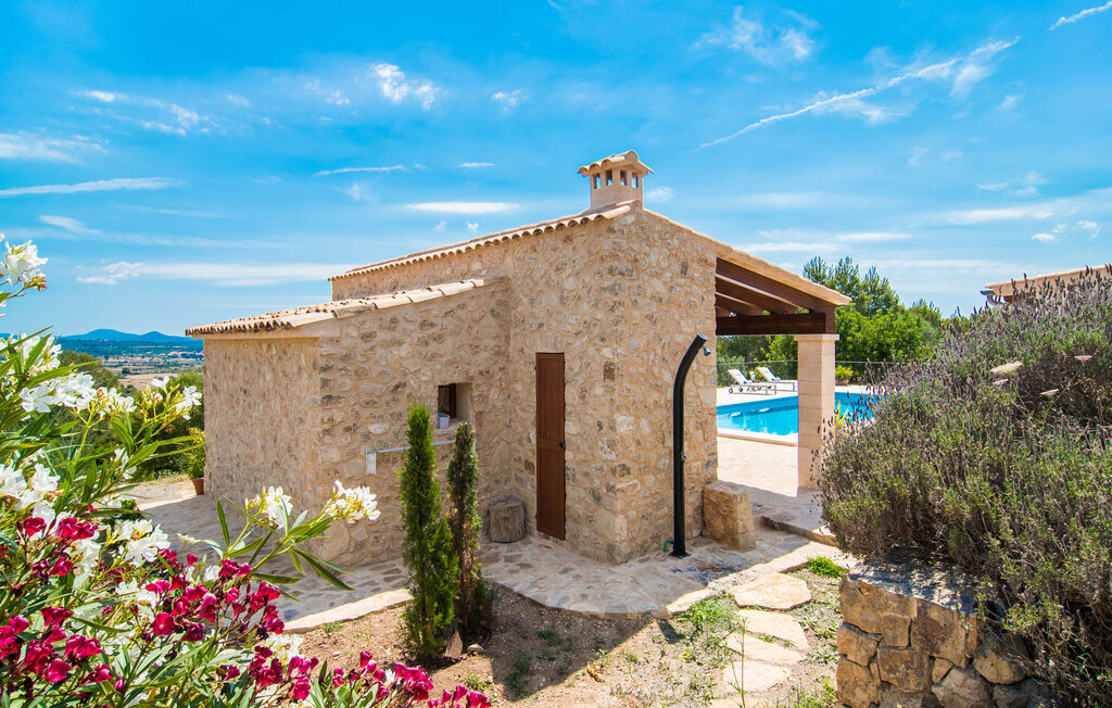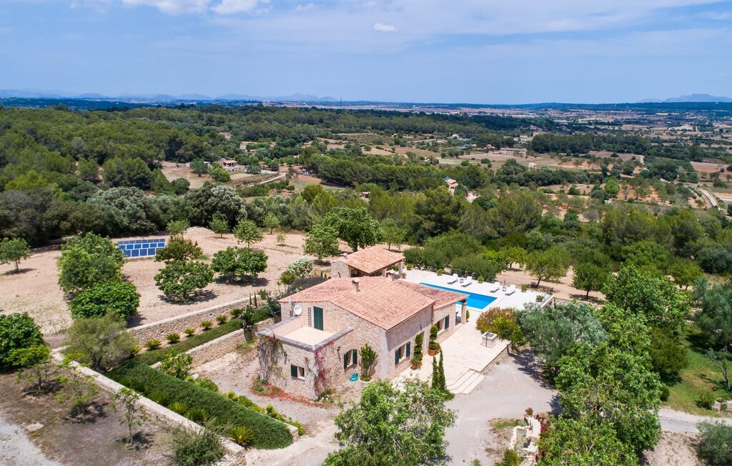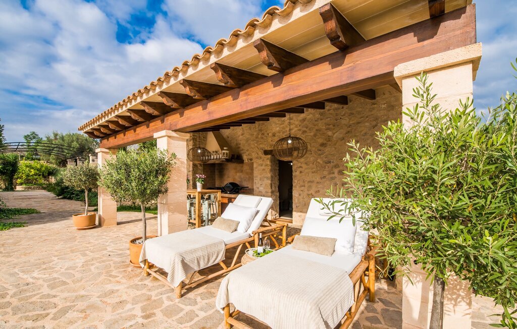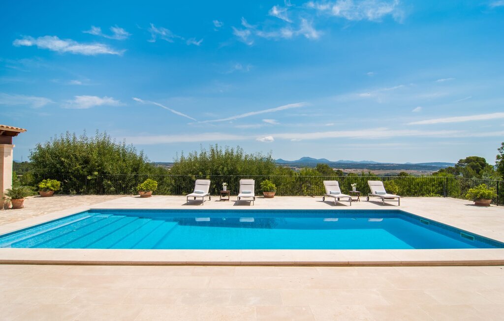 Aujourd'hui, nous rendons visite à la Villa Bon Any en empruntant des routes de villas bien aménagées. Nous vous invitons à vous joindre à nous pour une visite de cette propriété à couper le souffle. Au premier coup d'œil, la construction en pierres de taille semble très traditionnelle ; nous pouvons vous assurer qu'il s'agit d'une villa neuve, très bien située, mais qui respecte fortement le style architectural traditionnel de Majorque. La maison est située sur un grand terrain de 30.000 m², en hauteur sur la montagne. Les maîtres d'ouvrage ont su tirer le meilleur parti de cette situation et positionner aussi bien la zone de la piscine que les terrasses couvertes de manière à ce que vous puissiez profiter de cette vue inoubliable en toute tranquillité, entouré de toute la beauté de la nature méditerranéenne. La grande piscine est située sur une magnifique terrasse lumineuse et est délimitée par une pente menant au terrain environnant planté d'oliviers et de caroubiers. Six chaises longues en aluminium de haute qualité sont à votre disposition pour votre bain de soleil quotidien. Si vous avez trop chaud au soleil, il vous suffit de pousser votre chaise longue sous l'ombre du toldo ou baldaquin recouvert de bambou, qui peut accueillir au moins cinq chaises longues. Si vous avez envie d'une partie de backgammon, il y a une petite table et des chaises de style bistrot à l'autre bout de la piscine. La piscine elle-même, recouverte de mosaïques, offre un accès large, plat et en escalier, adapté aux enfants. Nous quittons maintenant la piscine pour nous rendre sur la terrasse couverte à côté de la maison. Lorsque vous êtes assis à la table à manger avec ses confortables chaises en osier et que vous savourez votre dîner, vous pouvez regarder par-dessus la piscine et profiter de la vue sur la plaine de Pétra - une vue qui s'étend jusqu'à la chaîne de montagnes à l'horizon. À côté de la salle à manger se trouve un espace lounge intégré qui invite à la détente sur ses coussins moelleux. C'est l'endroit idéal pour boire un bon verre de vin avec des amis le soir ou un café le matin, pour commencer la journée dans le calme de la nature.