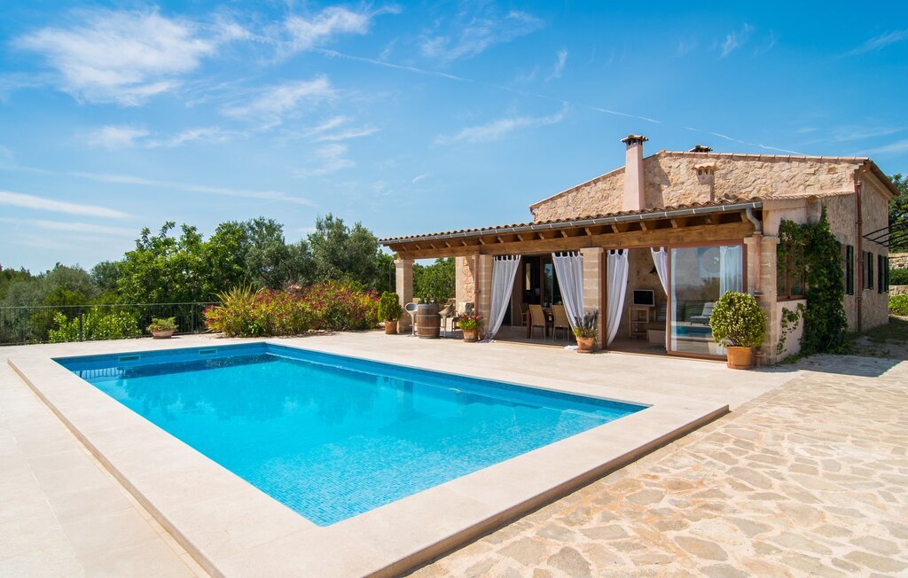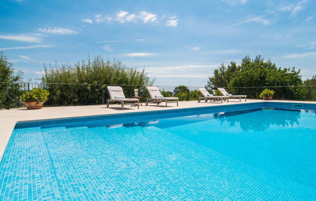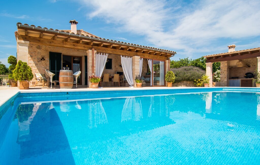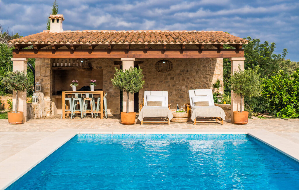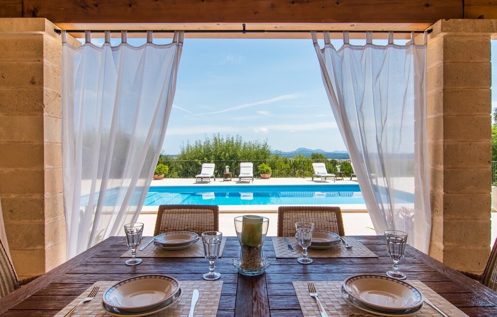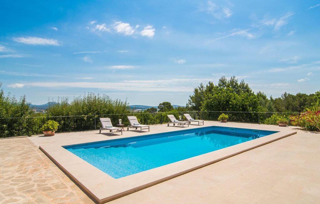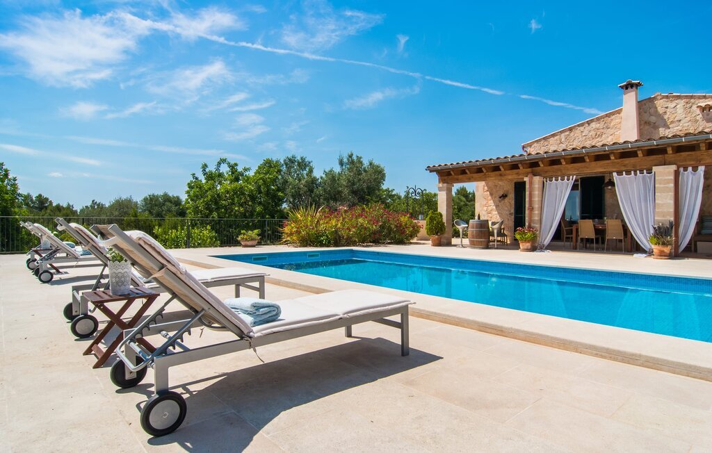 Aujourd'hui, nous rendons visite à la Villa Bon Any en empruntant des routes de villas bien aménagées. Nous vous invitons à vous joindre à nous pour une visite de cette propriété à couper le souffle. Au premier coup d'œil, la construction en pierres de taille semble très traditionnelle ; nous pouvons vous assurer qu'il s'agit d'une villa neuve, très bien située, mais qui respecte fortement le style architectural traditionnel de Majorque. La maison est située sur un grand terrain de 30.000 m², en hauteur sur la montagne. Les maîtres d'ouvrage ont su tirer le meilleur parti de cette situation et positionner aussi bien la zone de la piscine que les terrasses couvertes de manière à ce que vous puissiez profiter de cette vue inoubliable en toute tranquillité, entouré de toute la beauté de la nature méditerranéenne. La grande piscine est située sur une magnifique terrasse lumineuse et est délimitée par une pente menant au terrain environnant planté d'oliviers et de caroubiers. Six chaises longues en aluminium de haute qualité sont à votre disposition pour votre bain de soleil quotidien. Si vous avez trop chaud au soleil, il vous suffit de pousser votre chaise longue sous l'ombre du toldo ou baldaquin recouvert de bambou, qui peut accueillir au moins cinq chaises longues. Si vous avez envie d'une partie de backgammon, il y a une petite table et des chaises de style bistrot à l'autre bout de la piscine. La piscine elle-même, recouverte de mosaïques, offre un accès large, plat et en escalier, adapté aux enfants. Nous quittons maintenant la piscine pour nous rendre sur la terrasse couverte à côté de la maison. Lorsque vous êtes assis à la table à manger avec ses confortables chaises en osier et que vous savourez votre dîner, vous pouvez regarder par-dessus la piscine et profiter de la vue sur la plaine de Pétra - une vue qui s'étend jusqu'à la chaîne de montagnes à l'horizon. À côté de la salle à manger se trouve un espace lounge intégré qui invite à la détente sur ses coussins moelleux. C'est l'endroit idéal pour boire un bon verre de vin avec des amis le soir ou un café le matin, pour commencer la journée dans le calme de la nature.