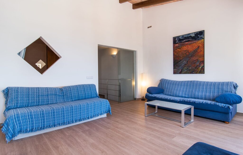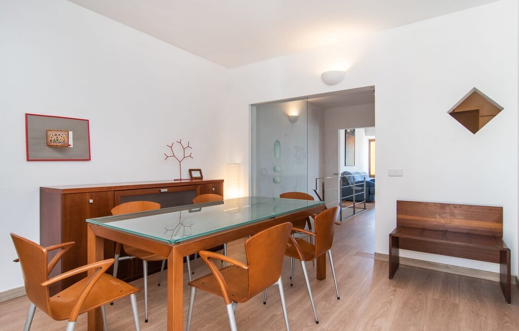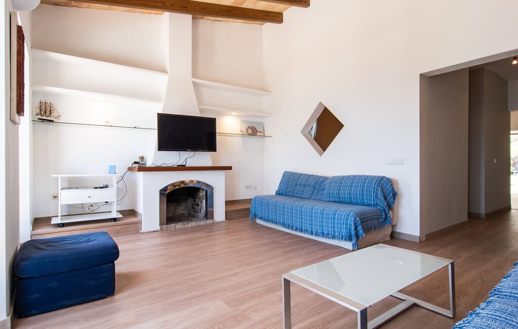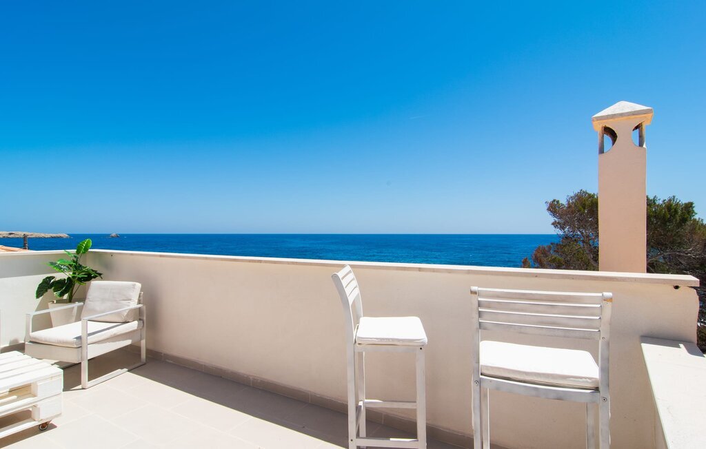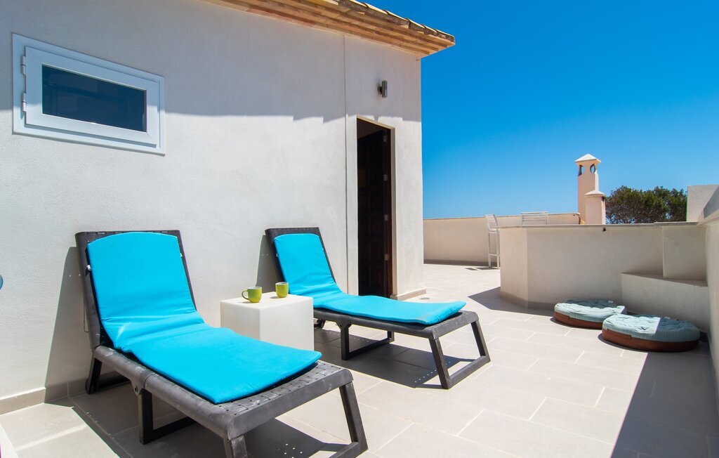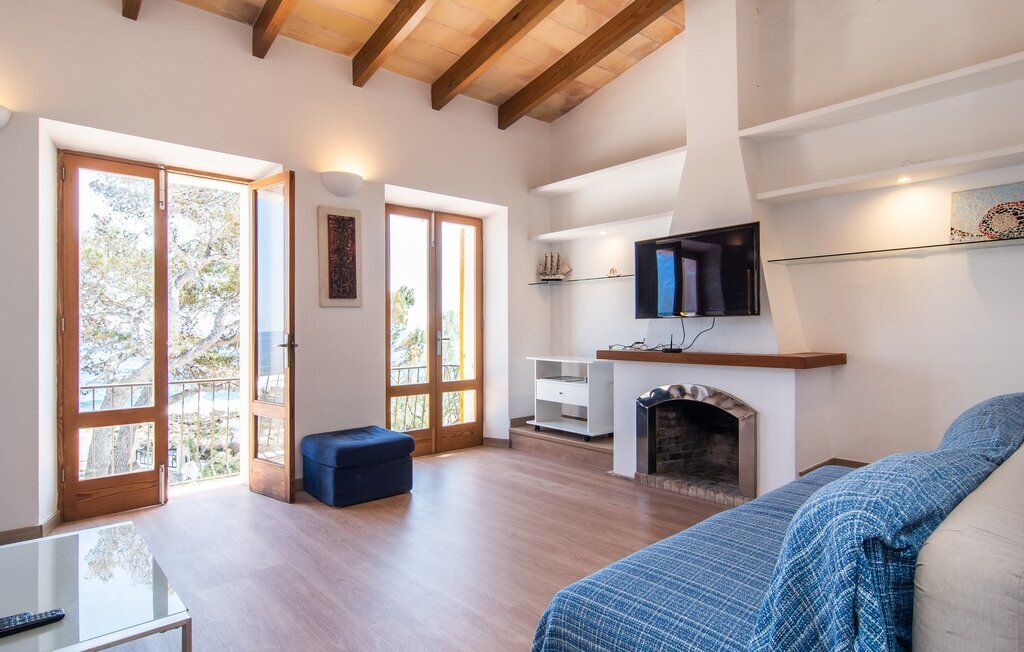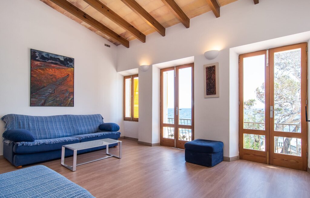 L'intérieur de "Sa Punta Dúplex" s'étend sur deux niveaux. Le salon confortable avec cheminée est parfait pour les soirées plus fraîches et s'ouvre sur un petit balcon avec vue sur la promenade. La salle à manger et une cuisine bien équipée se trouvent également à cet étage. La salle de bain principale se trouve à côté de la cuisine et est facilement accessible depuis toutes les terrasses. À l'étage supérieur, la chambre principale avec sa propre salle de douche offre un lieu de retraite paisible. Cette villa est parfaite pour une ou deux familles ou amis qui cherchent des vacances au bord de la mer avec un accès facile à la ville.