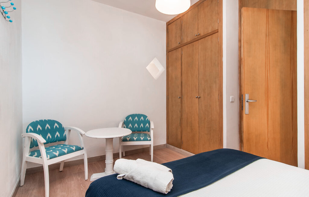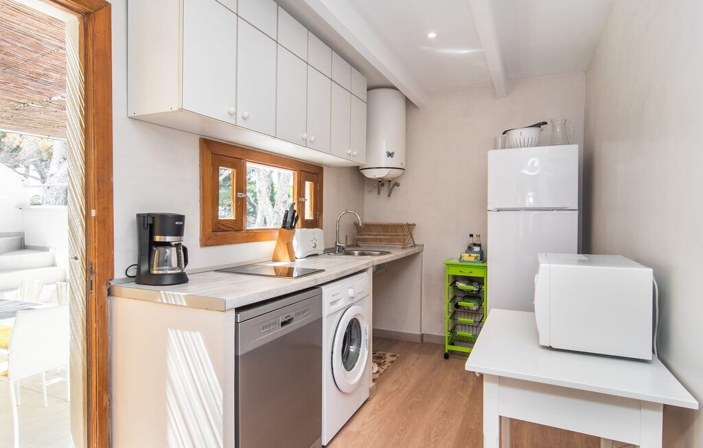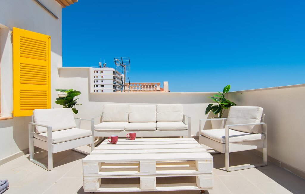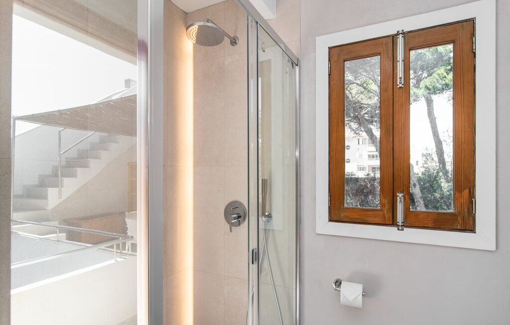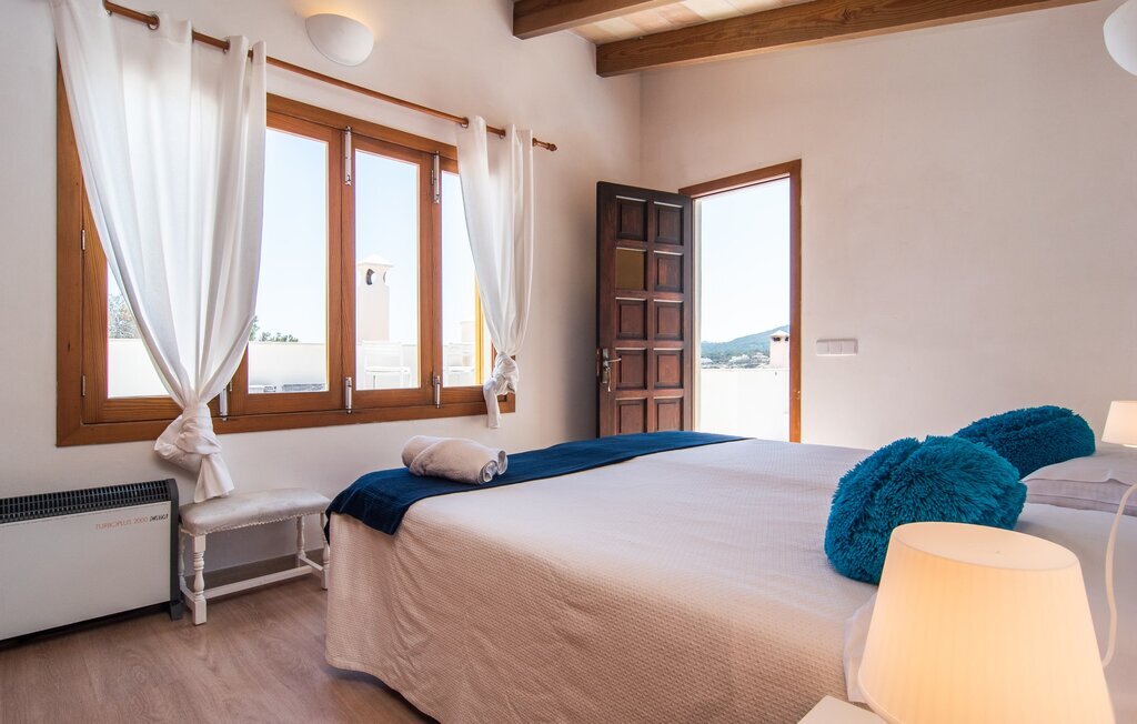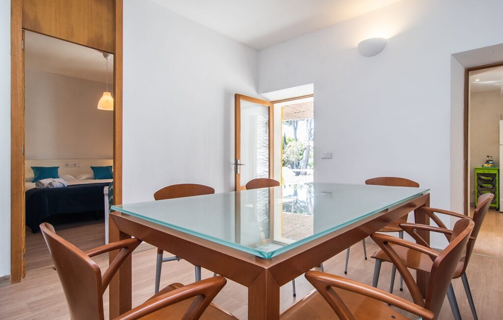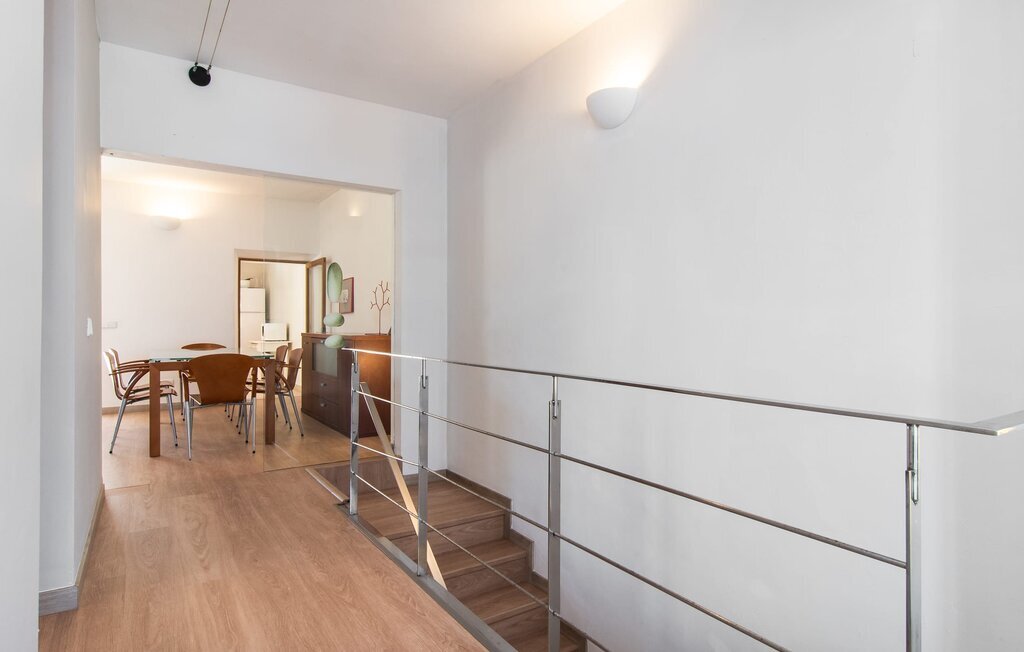 L'intérieur de "Sa Punta Dúplex" s'étend sur deux niveaux. Le salon confortable avec cheminée est parfait pour les soirées plus fraîches et s'ouvre sur un petit balcon avec vue sur la promenade. La salle à manger et une cuisine bien équipée se trouvent également à cet étage. La salle de bain principale se trouve à côté de la cuisine et est facilement accessible depuis toutes les terrasses. À l'étage supérieur, la chambre principale avec sa propre salle de douche offre un lieu de retraite paisible. Cette villa est parfaite pour une ou deux familles ou amis qui cherchent des vacances au bord de la mer avec un accès facile à la ville.
