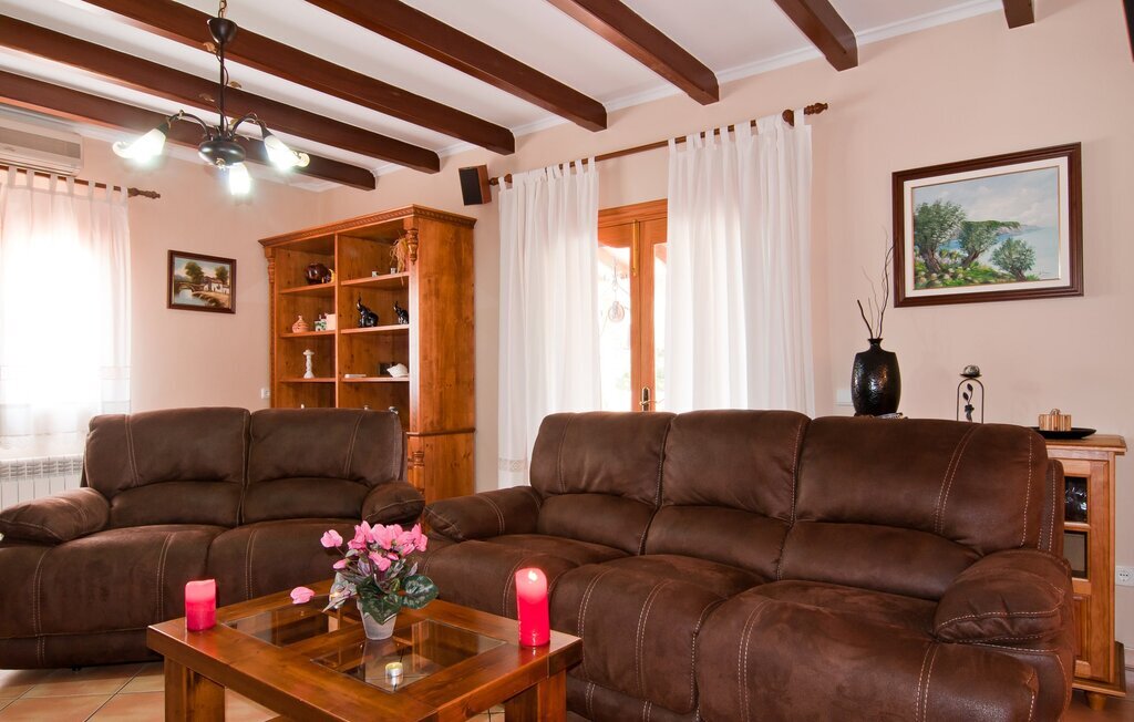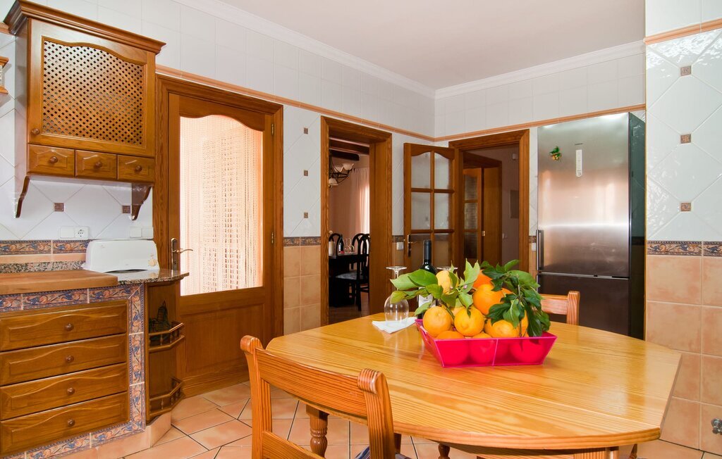 Une allée luxuriante, bordée d'un mur en pierre naturelle et de grands palmiers, nous mène à la maison et nous donne un premier avant-goût de l'exclusivité de cette propriété. Il devient rapidement évident que dans l'espace extérieur de cette villa, l'accent a été mis sur la présentation des différents éléments de manière variée et dans des dimensions plus importantes. Le nombre extraordinairement élevé d'arbres sur le terrain est particulièrement impressionnant. Dans la zone de la piscine, on a l'impression d'être au milieu d'un jardin de palmiers. Les éléments de décoration les plus divers et d'autres pièces et installations uniques invitent à la découverte et à l'étonnement sur la propriété et lui confèrent un flair tout à fait individuel. Sur les vastes surfaces de terrasses, vous pouvez chercher chaque jour un nouveau lieu de prédilection exclusif et trouver aussi bien des endroits ensoleillés que des zones d'ombre naturelles aérées pour vous détendre. Les arbres fruitiers, les légumes, les poules et les oiseaux font également partie de la vie à la campagne. La piscine, située à l'abri devant la maison, constitue le point central du jardin. Le bassin est accessible par une échelle et présente au fond une jolie mosaïque de dauphins. Avec ses 10 mètres de long, elle est de taille respectable. Les chaises longues et les parasols s'harmonisent avec la couleur bleue de la piscine et créent un tableau pittoresque. Vous pouvez vous allonger à volonté sous le ciel méditerranéen et profiter du plus beau moment de l'année. Vous pouvez le faire avec le même goût dans les différents coins salon répartis autour de la maison, qui comprennent des chaises confortables en osier, des tables à manger, des chaises et un banc. La propriété offre un total de 20 places assises extérieures. Un espace couvert fait également partie de l'offre extérieure généreuse. Près de la terrasse de la piscine se trouve l'espace barbecue, où vous pourrez vous asseoir lors des chaudes soirées et vous régaler de délices culinaires frais et régionaux.