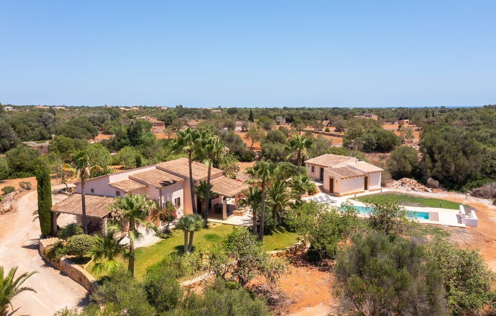 L'intérieur de la finca est moderne et aménagé avec goût. L'utilisation délibérée du bois, combinée à des tons de crème et de blanc et complétée par des objets d'ameublement et de la vaisselle de la région de Santanyi, crée une atmosphère de bien-être moderne. La maison dispose de deux chambres à coucher doubles climatisées, entièrement réaménagées en 2023, avec salle de douche (dont une en suite), d'une cuisine spacieuse et très bien équipée et d'un salon/salle à manger ouvert adjacent (également climatisé). Un coin salon moderne et accueillant constitue le centre du salon. Les salles de bains bénéficient de beaucoup de lumière naturelle et sont également équipées avec goût. La finca est adaptée au home-office et dispose d'un espace de travail lumineux et moderne avec vue sur le jardin de palmiers.