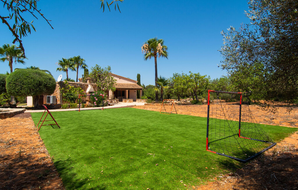 La finca dispose d'une piscine de 10 mètres de long sans chlore, dans laquelle il est agréable de nager. La terrasse de la piscine, pavée de pierres de Santanyi, invite à prendre ensuite un bain de soleil. Le jardin de palmiers bien entretenu et les trois grandes terrasses couvertes sont adjacents à la terrasse. Une terrasse confortable pour le petit-déjeuner avec un coin salon, une terrasse orientée au sud pour prendre des bains de soleil toute la journée et manger ensemble ainsi qu'une terrasse à l'ouest où vous pouvez profiter du soleil du soir avec un Sundowner. Un barbecue maçonné jouxte les terrasses. Le terrain en gazon synthétique de 8 x 12 m permet à toute la famille de jouer au football, de se défouler ou de se détendre avec une séance de yoga. Un panier de basket-ball, un terrain de pétanque et une table de ping-pong vous invitent également à faire un match.