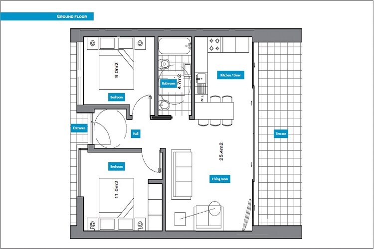 Rez-de-chaussée: (hall d'entrée, Salle de séjour(TV(digital)), cuisine ouverte(cuisinière(vitrocéramique), four, micro ondes, lave-vaisselle , combinaison réfrigérateur/congélateur), chambre(Lit double ou 2 x lit simple), chambre(2x lit simple), salle de bains(baignoire-douche, lavabo, WC)) lave-linge (partagé avec d'autres clients), chauffage(central, chauffage par le sol), terrasse, mobilier de jardin, mobilier de jardin, parking, piscine(partagé avec d'autres clients)