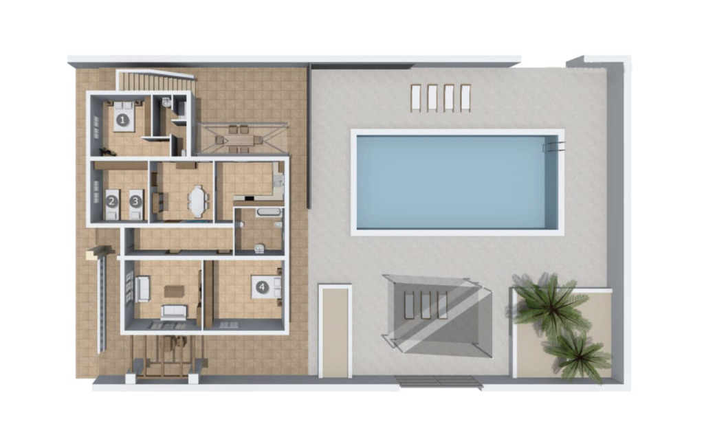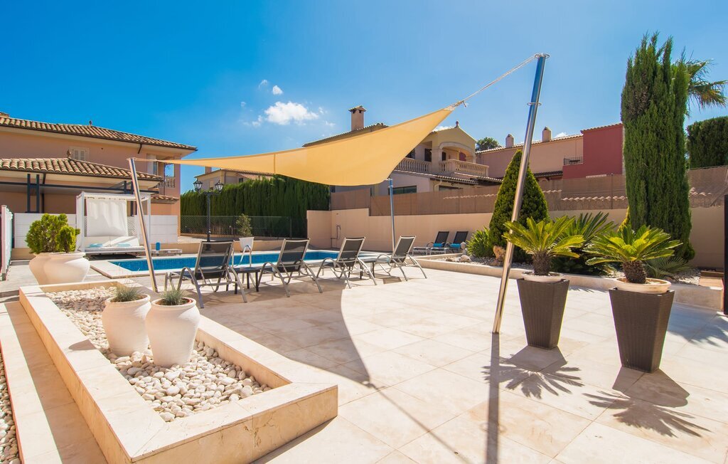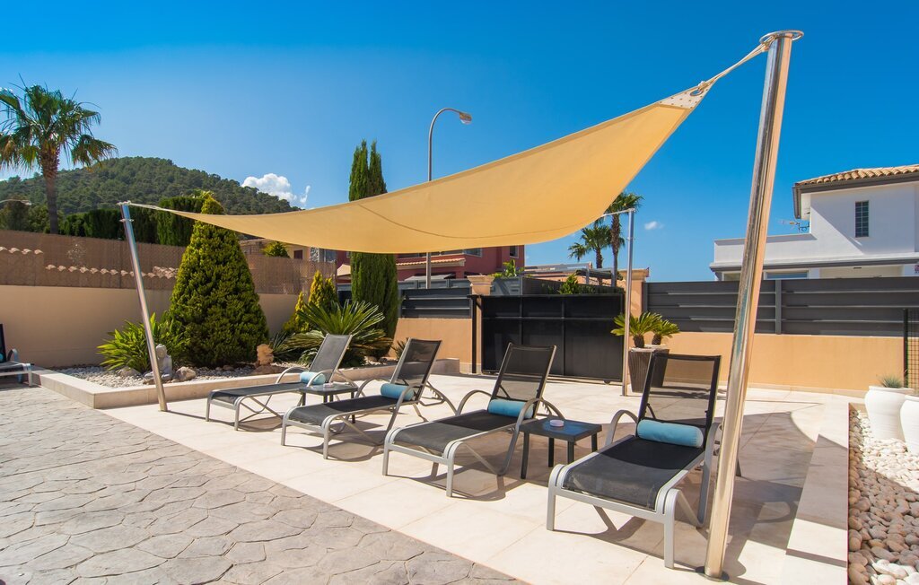 La terrasse et le balcon spacieux sont accessibles depuis le salon. Ceux-ci sont partiellement couverts et peuvent, si vous le souhaitez, être partiellement ombragés par un store. Vous y trouverez plusieurs sièges de différentes tailles et bien sûr quelques chaises longues. Profitez à tout moment de la journée de la vue dégagée sur le ciel bleu azur et la mer toute proche en buvant une tasse de café le matin, en faisant la sieste à midi ou en dégustant un excellent verre de vin rouge majorquin par une nuit étoilée. La piscine privée est entourée d'une terrasse bien entretenue avec des parterres de fleurs cultivés par des professionnels. La terrasse de la piscine proprement dite, équipée de chaises longues confortables pour tous les hôtes, est couverte par deux stores et offre ombre et intimité. La douche extérieure puissante rend la natation ou le barbotage dans l'eau particulièrement attractifs Vous n'avez pas besoin d'entrer dans la maison pour prendre une douche après avoir nagé, il vous suffit de vous doucher à l'extérieur.