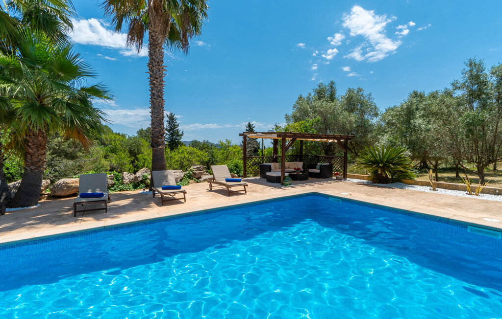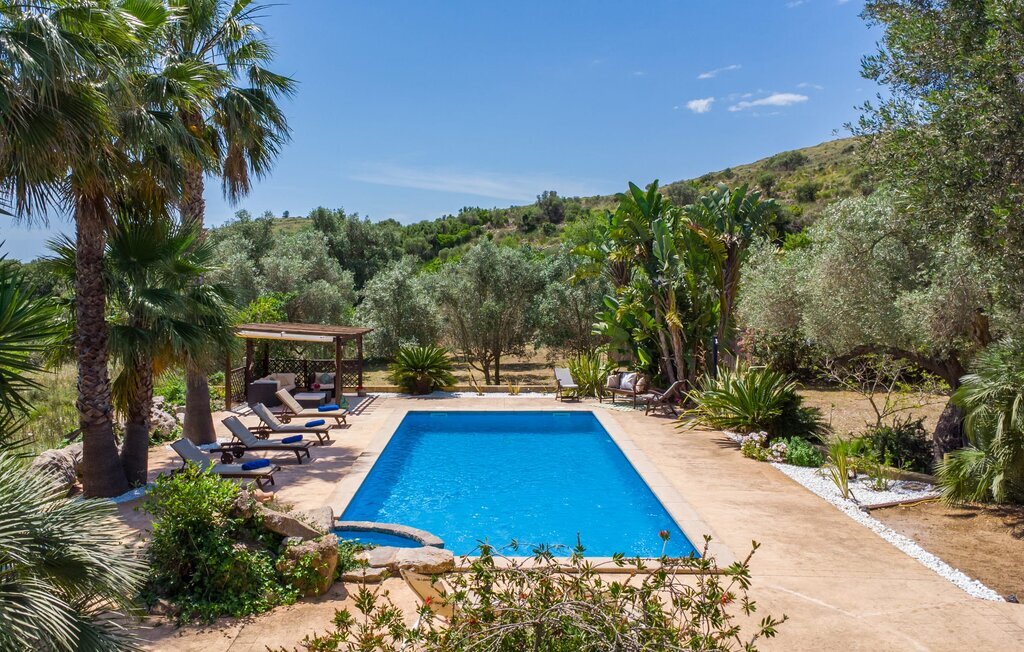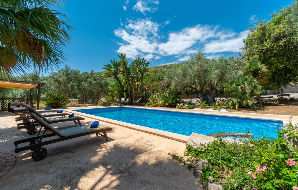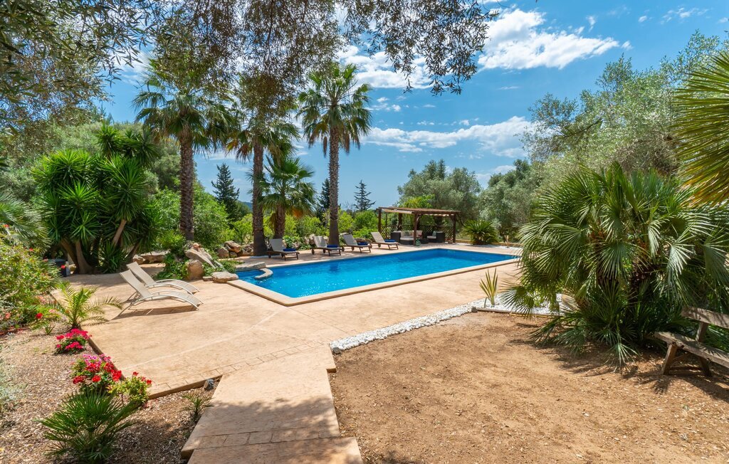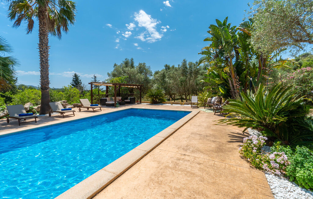 La villa Can Colau est une propriété spectaculaire, située sur sa propre petite colline, entourée d'un immense jardin à la végétation méditerranéenne luxuriante et richement arborée. L'extérieur dégage une agréable atmosphère d'opulence et d'espace, et l'œil se réjouira du panorama dont on peut profiter depuis ici. En fait, c'est l'endroit parfait pour simplement se détendre, car le calme absolu y règne. Protégée par de magnifiques rangées de palmiers et offrant en même temps une vue de rêve, se trouve la piscine de 60 m². Elle n'est qu'à quelques pas de la maison. La terrasse ensoleillée adjacente est aménagée avec beaucoup de goût et offre une ombre naturelle agréable à toute heure de la journée. De plus, il y a ici un fantastique coin salon couvert où vous pourrez profiter de l'ombre aérée. Juste à côté de la maison, d'autres vastes espaces invitent à la détente, comme les terrasses recouvertes de différentes pierres naturelles. Le jardin paradisiaque qui l'entoure, associé à la vue magnifique, crée une atmosphère à couper le souffle. Un choix de sièges vous permet de profiter de vos repas en plein air et d'apprécier le luxe de ce lieu unique.