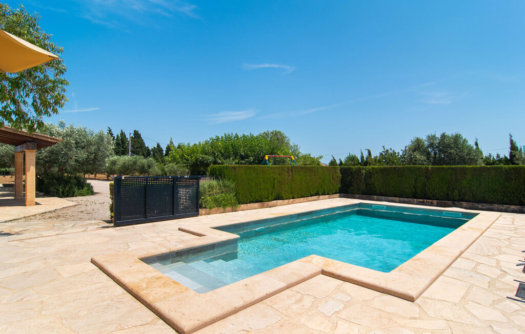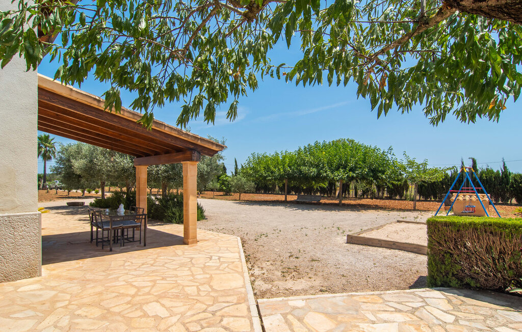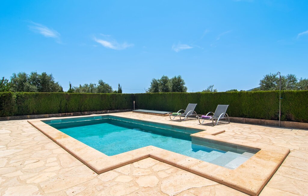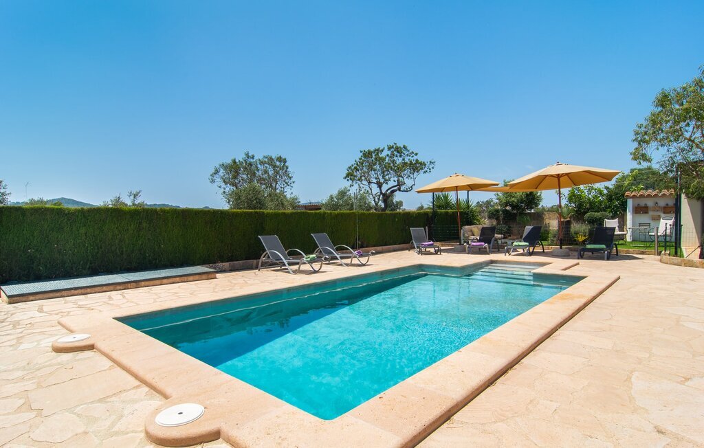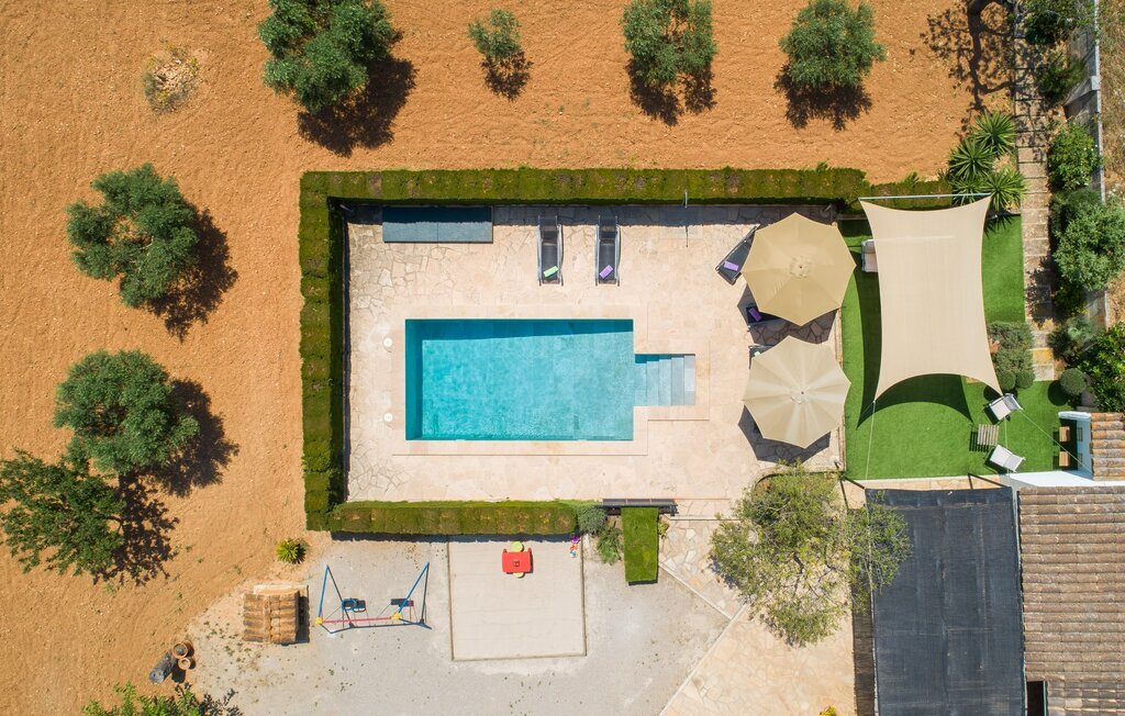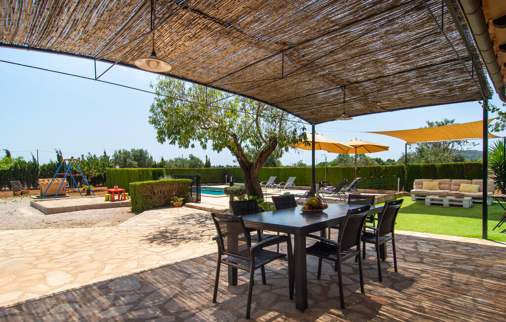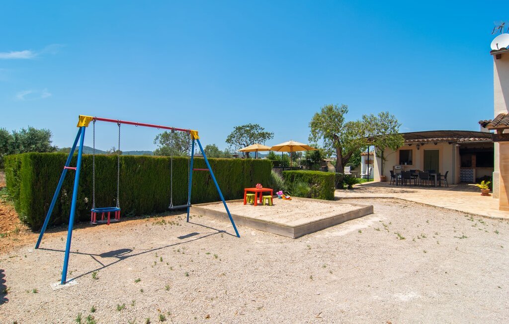 La villa Es Cipres, idéale pour les familles, vous séduira par sa jolie situation isolée sur un terrain de 9.000 m² et sa végétation luxuriante selon la saison. Une multitude de plantes, de vastes surfaces de gravier et de terrasses ainsi que des niches accueillantes pour se reposer confèrent à cette propriété un charme individuel. La sensation d'espace est ici impressionnante et directement perceptible. Grâce au toit de la maison, vous avez la possibilité de vous réjouir, selon vos préférences, au soleil ou à l'ombre aérée, d'une multitude d'endroits merveilleux pour vous détendre. Des chaises longues confortables vous invitent à vous détendre et à vous reposer, tout comme les coins salon de bon goût où vous pouvez prendre vos repas ensemble. Vous pourrez y prendre votre petit déjeuner en profitant de la vue dégagée sur le ciel bleu profond du matin ou terminer agréablement une autre journée de vacances bien remplie dans l'atmosphère du soir. La piscine, perpendiculaire à la villa, est sécurisée par une clôture pour les enfants. La piscine est carrelée avec de jolies mosaïques et sa profondeur varie entre 1 m et 1,90 m. Six chaises longues confortables sont à la disposition de tous les amateurs de soleil et deux parasols protègent des rayons UV éblouissants. Un autre magnifique espace de détente extérieur se trouve à l'étage supérieur, où un balcon spacieux offre une vue idyllique. Différents jeux pour enfants rendent le séjour à l'extérieur encore plus attrayant pour nos petits hôtes.