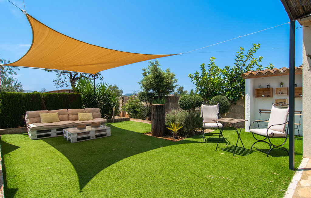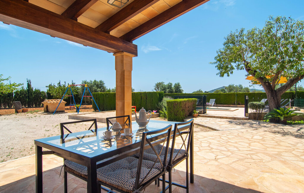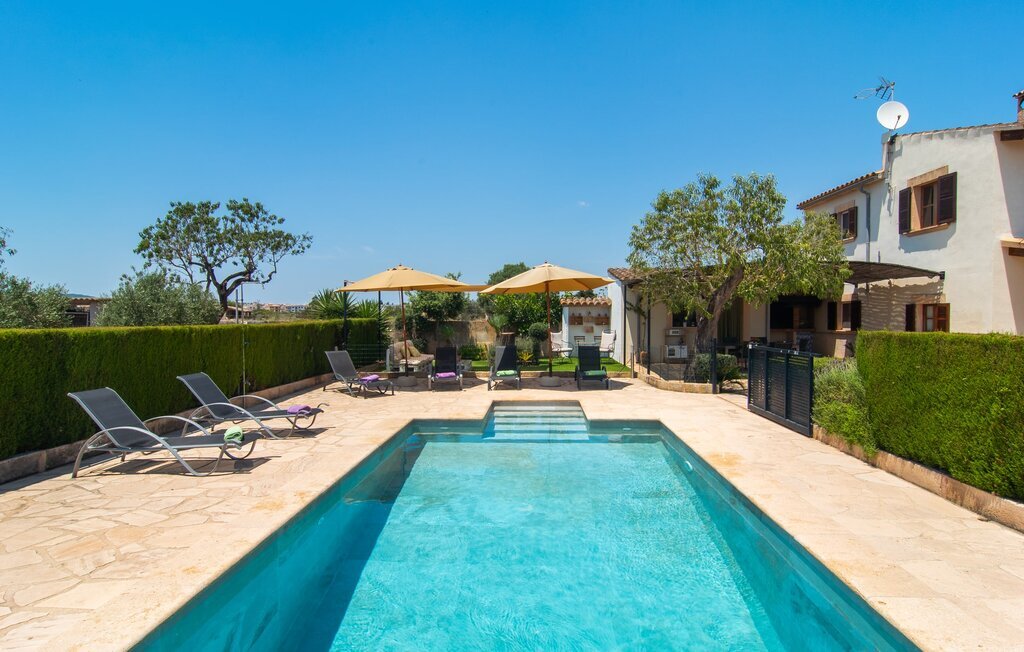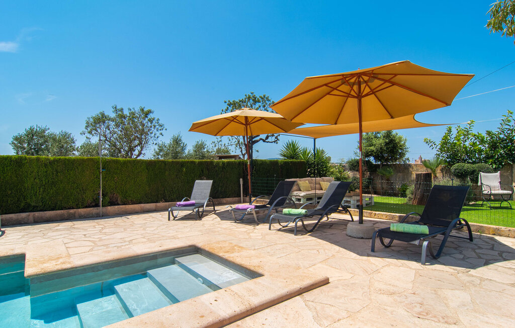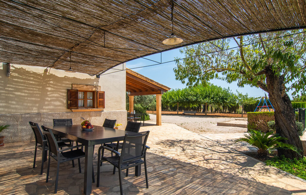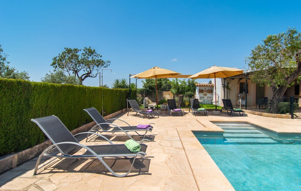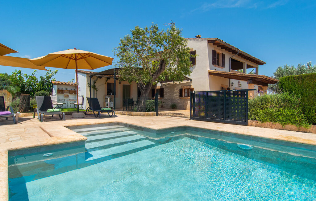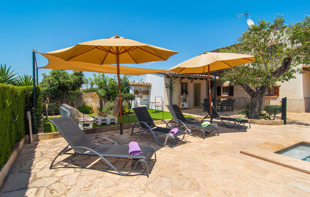 La villa Es Cipres, idéale pour les familles, vous séduira par sa jolie situation isolée sur un terrain de 9.000 m² et sa végétation luxuriante selon la saison. Une multitude de plantes, de vastes surfaces de gravier et de terrasses ainsi que des niches accueillantes pour se reposer confèrent à cette propriété un charme individuel. La sensation d'espace est ici impressionnante et directement perceptible. Grâce au toit de la maison, vous avez la possibilité de vous réjouir, selon vos préférences, au soleil ou à l'ombre aérée, d'une multitude d'endroits merveilleux pour vous détendre. Des chaises longues confortables vous invitent à vous détendre et à vous reposer, tout comme les coins salon de bon goût où vous pouvez prendre vos repas ensemble. Vous pourrez y prendre votre petit déjeuner en profitant de la vue dégagée sur le ciel bleu profond du matin ou terminer agréablement une autre journée de vacances bien remplie dans l'atmosphère du soir. La piscine, perpendiculaire à la villa, est sécurisée par une clôture pour les enfants. La piscine est carrelée avec de jolies mosaïques et sa profondeur varie entre 1 m et 1,90 m. Six chaises longues confortables sont à la disposition de tous les amateurs de soleil et deux parasols protègent des rayons UV éblouissants. Un autre magnifique espace de détente extérieur se trouve à l'étage supérieur, où un balcon spacieux offre une vue idyllique. Différents jeux pour enfants rendent le séjour à l'extérieur encore plus attrayant pour nos petits hôtes.