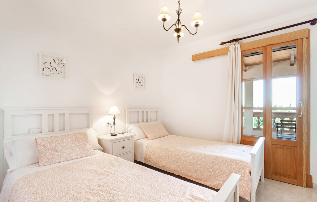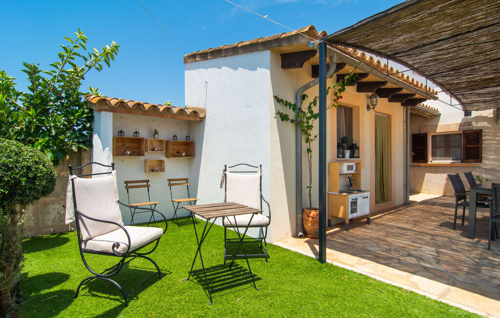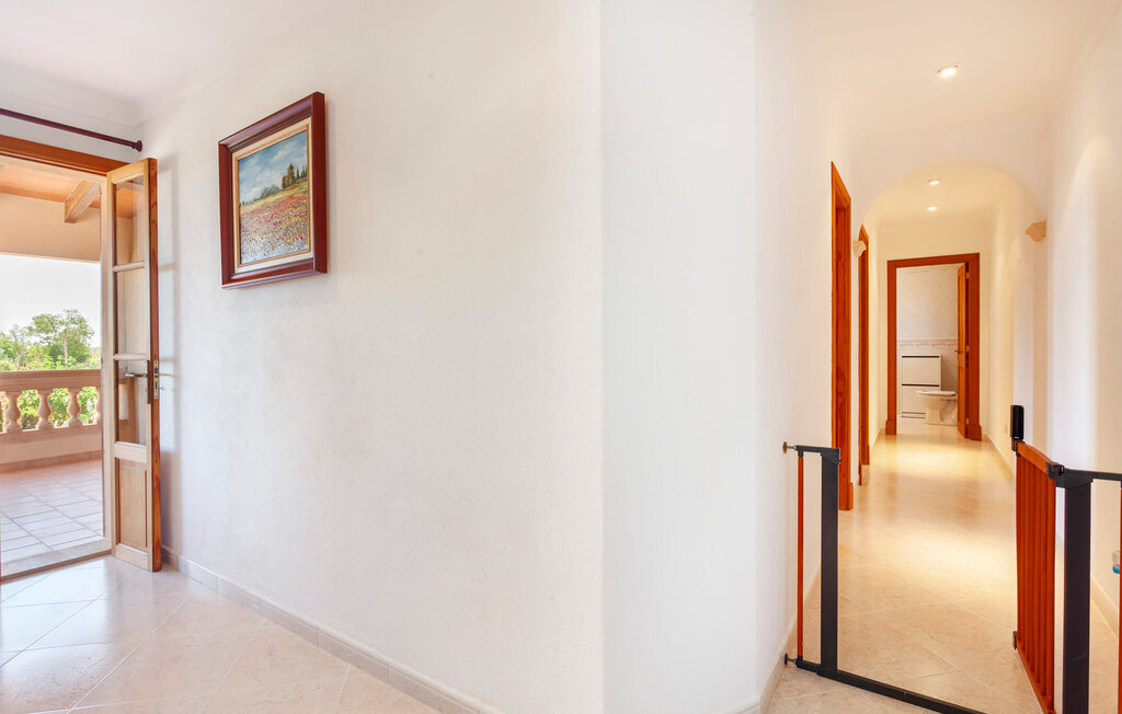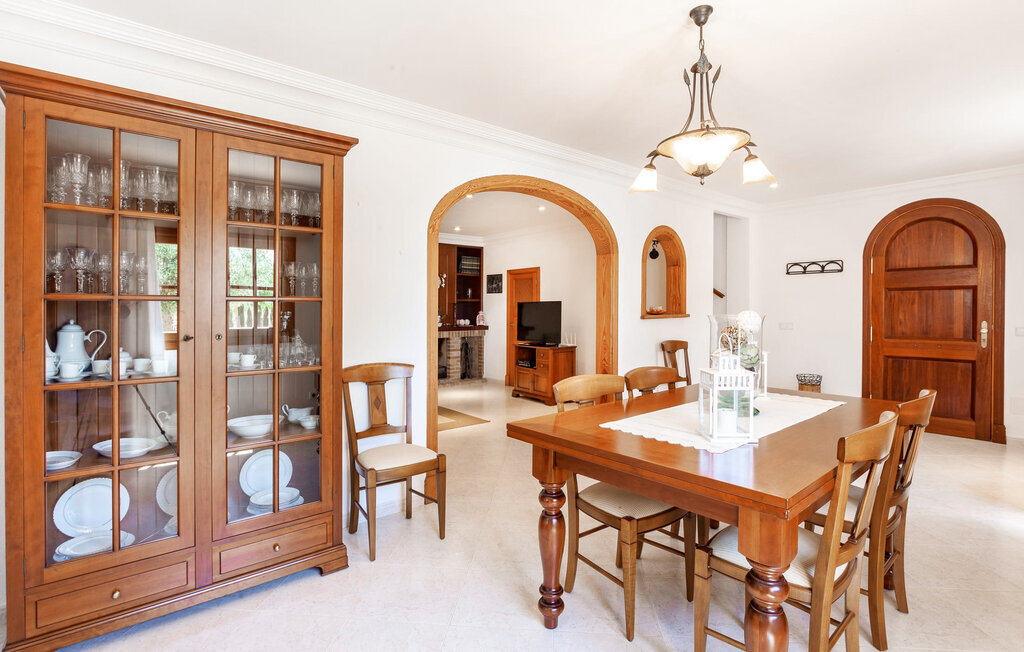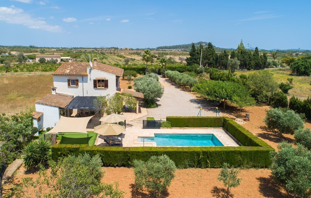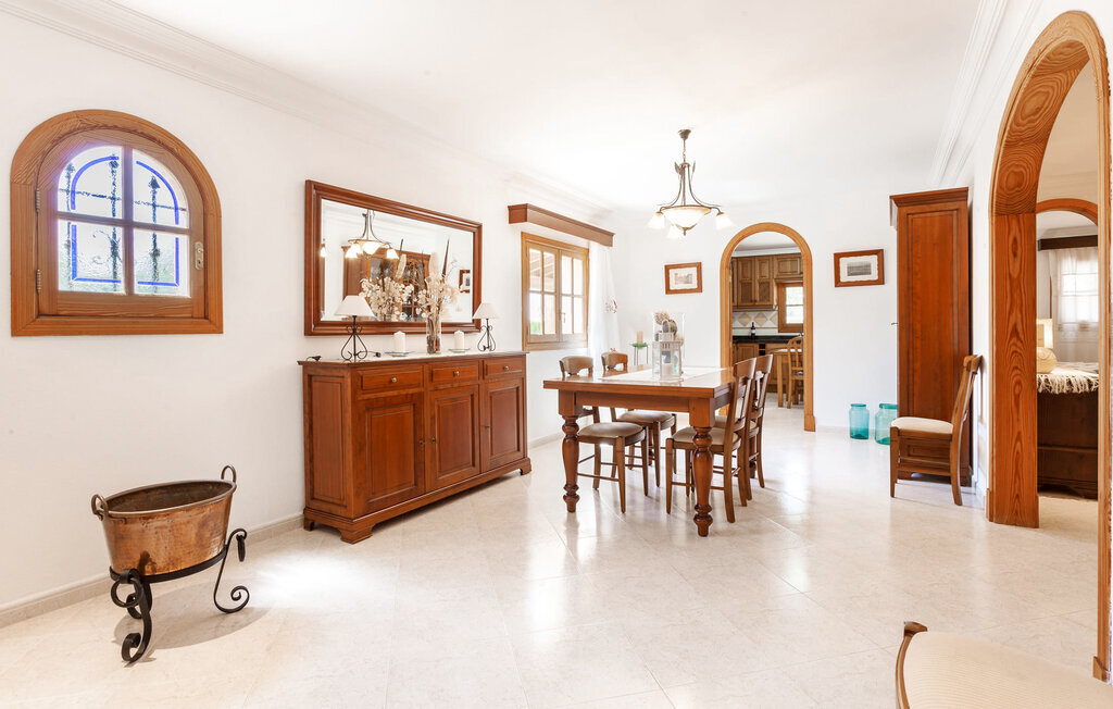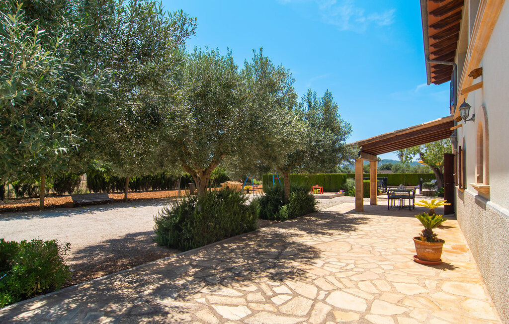 La villa Es Cipres, idéale pour les familles, vous séduira par sa jolie situation isolée sur un terrain de 9.000 m² et sa végétation luxuriante selon la saison. Une multitude de plantes, de vastes surfaces de gravier et de terrasses ainsi que des niches accueillantes pour se reposer confèrent à cette propriété un charme individuel. La sensation d'espace est ici impressionnante et directement perceptible. Grâce au toit de la maison, vous avez la possibilité de vous réjouir, selon vos préférences, au soleil ou à l'ombre aérée, d'une multitude d'endroits merveilleux pour vous détendre. Des chaises longues confortables vous invitent à vous détendre et à vous reposer, tout comme les coins salon de bon goût où vous pouvez prendre vos repas ensemble. Vous pourrez y prendre votre petit déjeuner en profitant de la vue dégagée sur le ciel bleu profond du matin ou terminer agréablement une autre journée de vacances bien remplie dans l'atmosphère du soir. La piscine, perpendiculaire à la villa, est sécurisée par une clôture pour les enfants. La piscine est carrelée avec de jolies mosaïques et sa profondeur varie entre 1 m et 1,90 m. Six chaises longues confortables sont à la disposition de tous les amateurs de soleil et deux parasols protègent des rayons UV éblouissants. Un autre magnifique espace de détente extérieur se trouve à l'étage supérieur, où un balcon spacieux offre une vue idyllique. Différents jeux pour enfants rendent le séjour à l'extérieur encore plus attrayant pour nos petits hôtes.