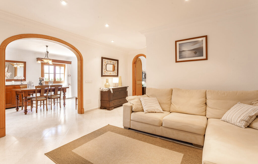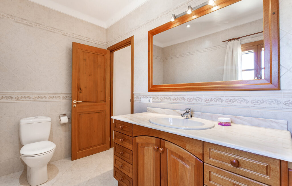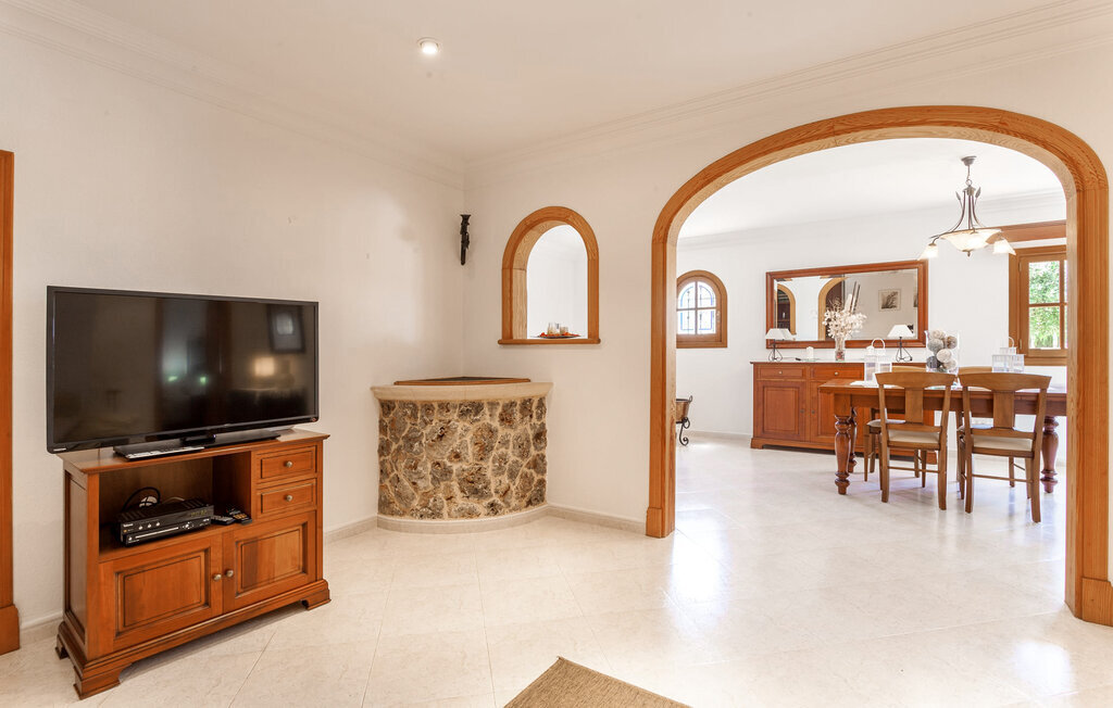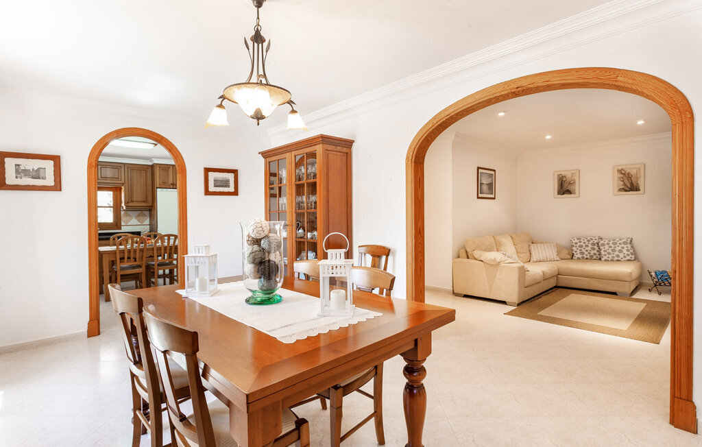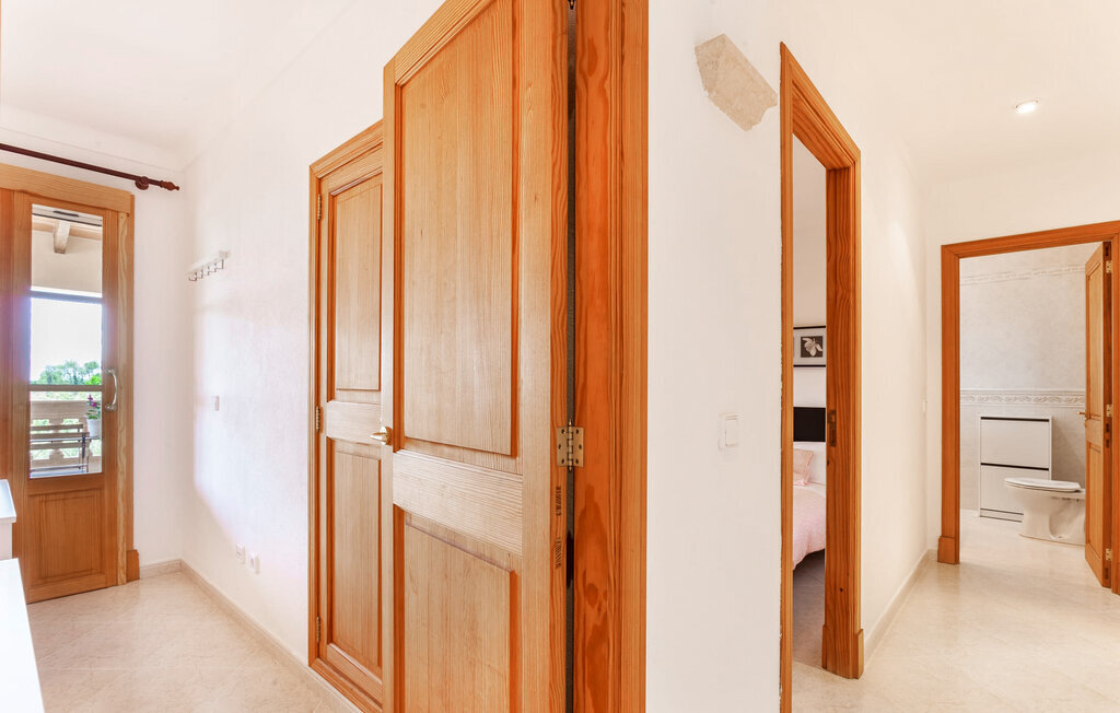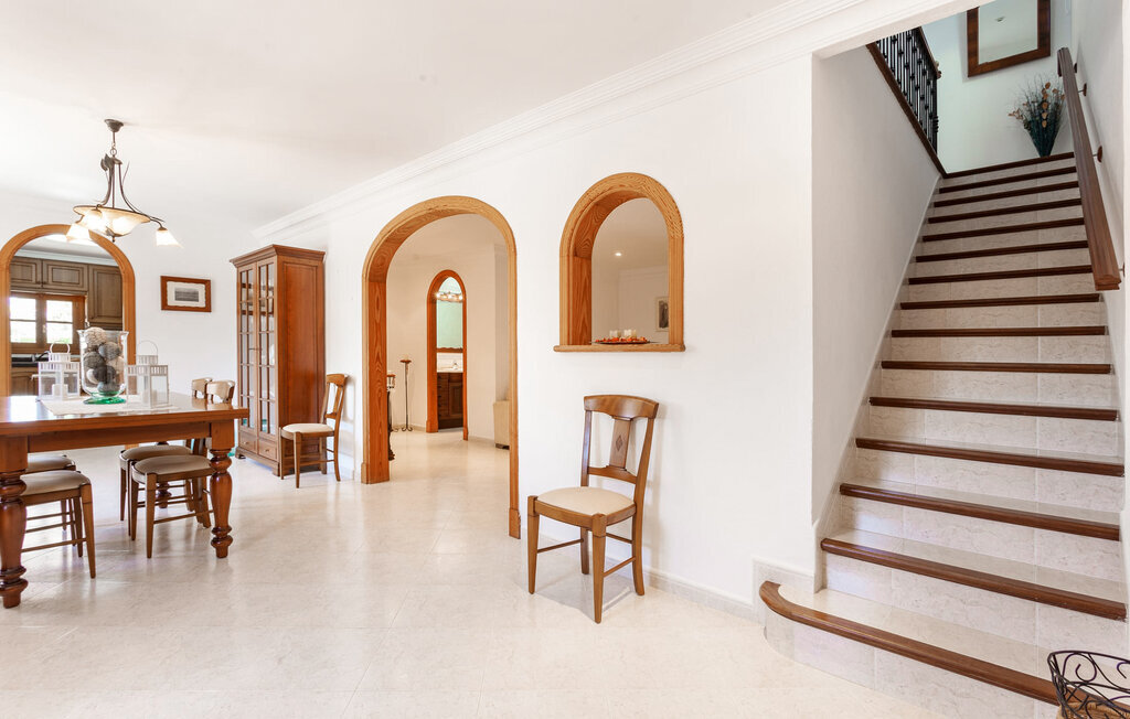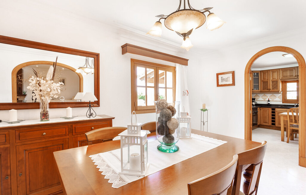 La villa Es Cipres, idéale pour les familles, vous séduira par sa jolie situation isolée sur un terrain de 9.000 m² et sa végétation luxuriante selon la saison. Une multitude de plantes, de vastes surfaces de gravier et de terrasses ainsi que des niches accueillantes pour se reposer confèrent à cette propriété un charme individuel. La sensation d'espace est ici impressionnante et directement perceptible. Grâce au toit de la maison, vous avez la possibilité de vous réjouir, selon vos préférences, au soleil ou à l'ombre aérée, d'une multitude d'endroits merveilleux pour vous détendre. Des chaises longues confortables vous invitent à vous détendre et à vous reposer, tout comme les coins salon de bon goût où vous pouvez prendre vos repas ensemble. Vous pourrez y prendre votre petit déjeuner en profitant de la vue dégagée sur le ciel bleu profond du matin ou terminer agréablement une autre journée de vacances bien remplie dans l'atmosphère du soir. La piscine, perpendiculaire à la villa, est sécurisée par une clôture pour les enfants. La piscine est carrelée avec de jolies mosaïques et sa profondeur varie entre 1 m et 1,90 m. Six chaises longues confortables sont à la disposition de tous les amateurs de soleil et deux parasols protègent des rayons UV éblouissants. Un autre magnifique espace de détente extérieur se trouve à l'étage supérieur, où un balcon spacieux offre une vue idyllique. Différents jeux pour enfants rendent le séjour à l'extérieur encore plus attrayant pour nos petits hôtes.