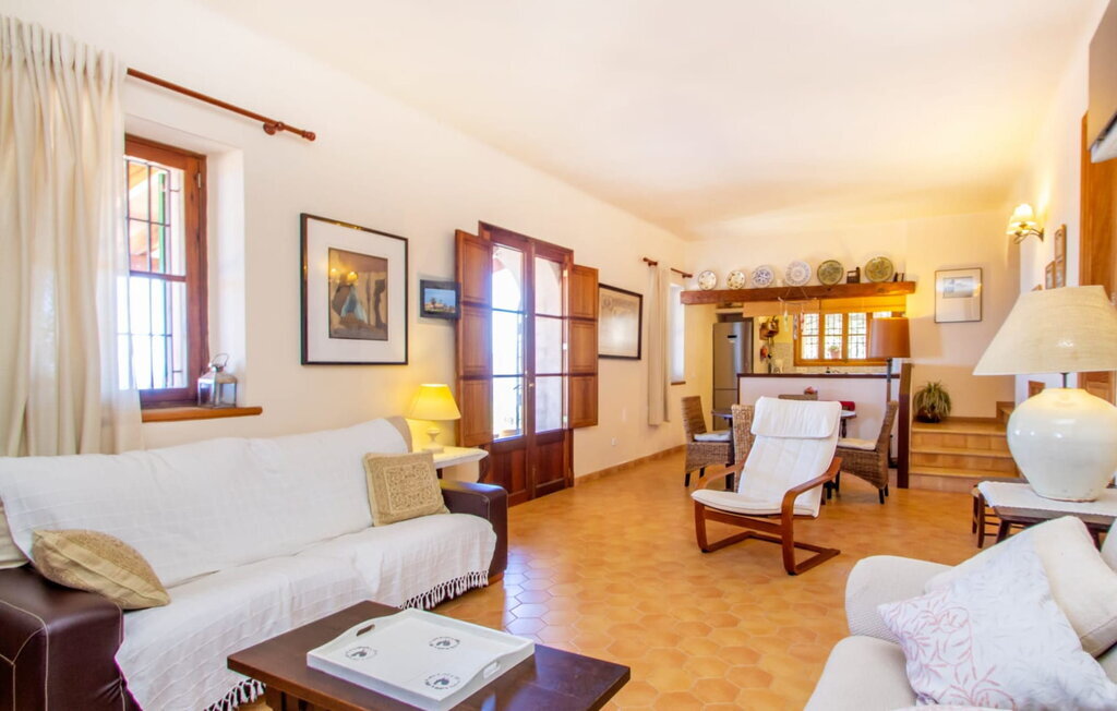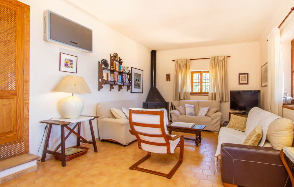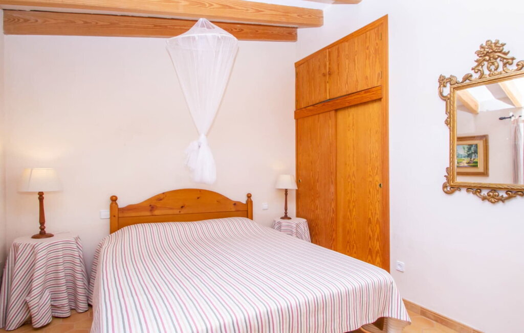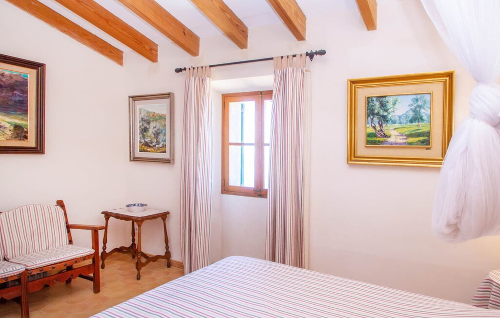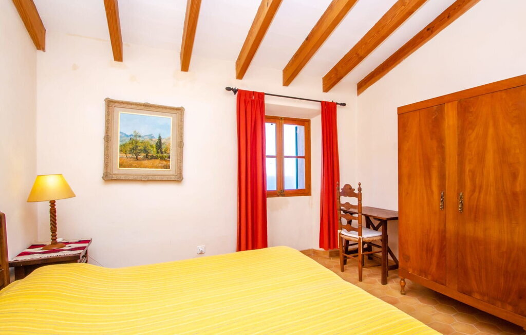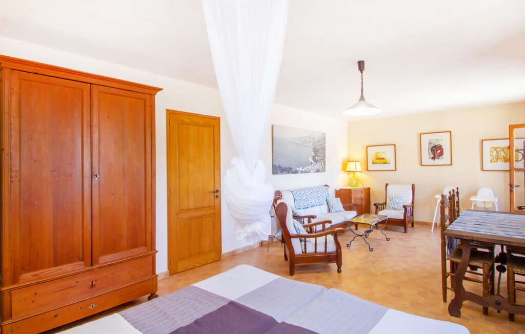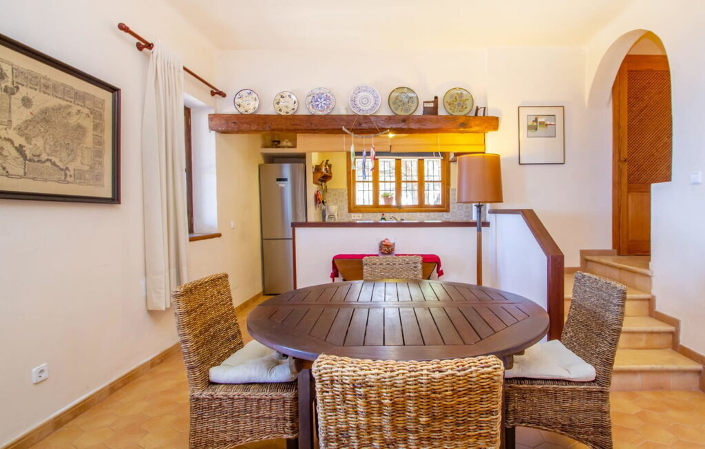 La maison principale s'étend sur deux étages et dispose de deux chambres doubles confortables, d'une salle de bains avec douche et d'un WC supplémentaire. La cuisine ouverte est entièrement équipée et le salon/salle à manger est l'endroit idéal pour se détendre. Une annexe avec entrée séparée offre un espace de vie supplémentaire, une chambre double spacieuse avec salle de bain privée et est donc idéale pour les groupes à la recherche d'intimité. La climatisation assure le confort pendant les chaudes nuits d'été, tandis que le mobilier reflète le style authentique de Majorque, parfait pour s'immerger dans la culture locale.