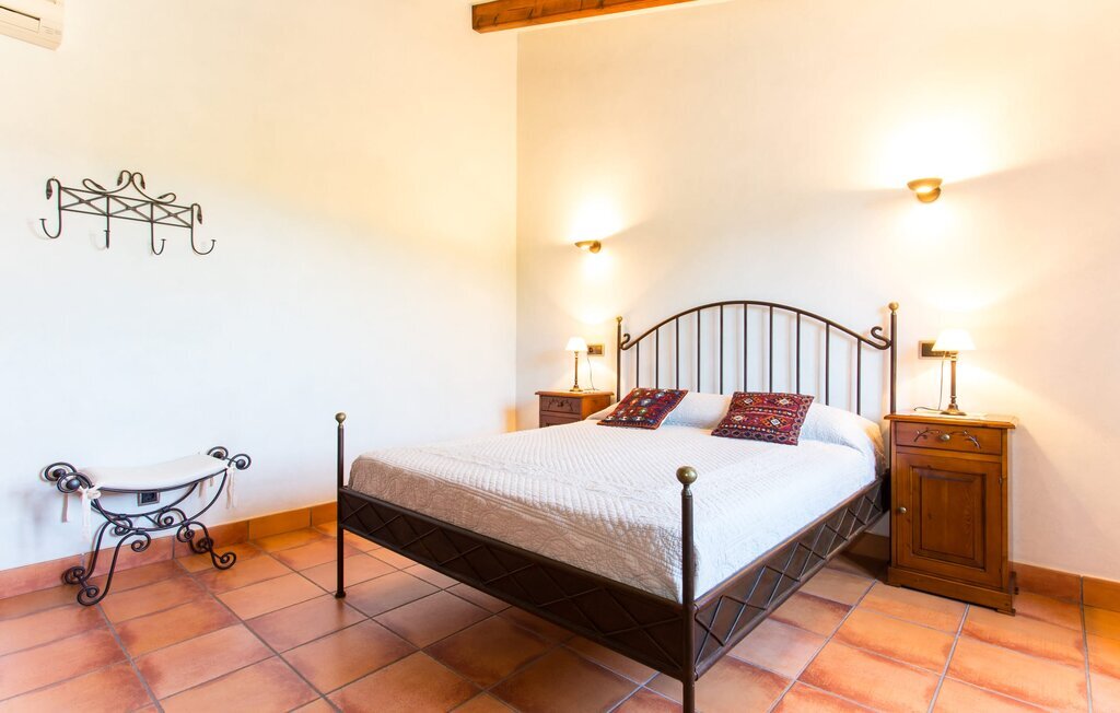 La villa Can Salat de Tiraset est exactement ce qu'il faut pour tous ceux qui souhaitent passer de bons moments dans une ambiance élégante. Dès que l'on entre dans la propriété, la puissante porte d'entrée en bois teinté foncé révèle que cette maison a beaucoup de charisme. Si vous continuez sur la place couverte de vignes devant la maison et que vous tournez dans le jardin, vous aurez une vue que vous n'oublierez pas de sitôt : Des cyprès ont été plantés autour de la piscine turquoise, ce qui souligne la touche méditerranéenne du sol en pierre naturelle de la piscine. Pour les journées d'été particulièrement chaudes, un pavillon aux colonnes élégantes offre de l'ombre à vous et à vos proches. L'espace extérieur se prête particulièrement bien aux festivités : Les deux terrasses couvertes offrent suffisamment de place pour déguster dans un environnement parfait vos délices préparés sur le barbecue fixe, tout en savourant l'un ou l'autre verre de vin. La table décorative en mosaïque, qui s'accorde avec les accents orientaux de l'intérieur, attire particulièrement l'attention. La piscine est le point fort du jardin : vous pouvez profiter de l'eau tout en faisant quelques brasses le matin au réveil, puis vous laver dans le bain extérieur. Ensuite, vous pouvez rendre visite à vos amis à plumes et à poils Les poules, les moutons et les chats vivent sur la propriété dans un espace séparé.