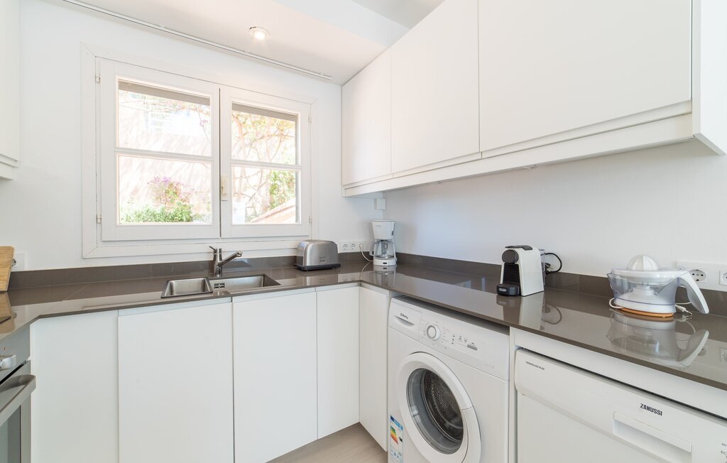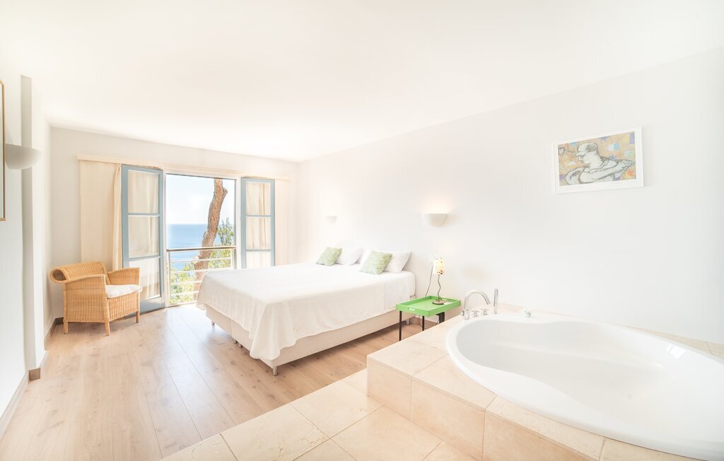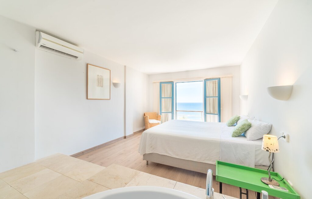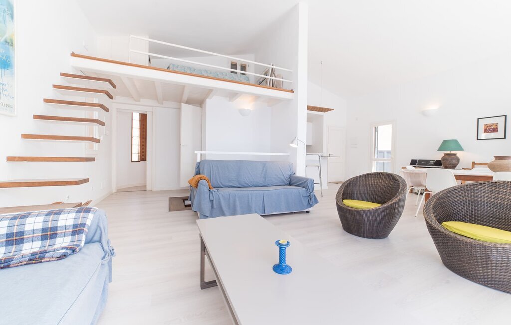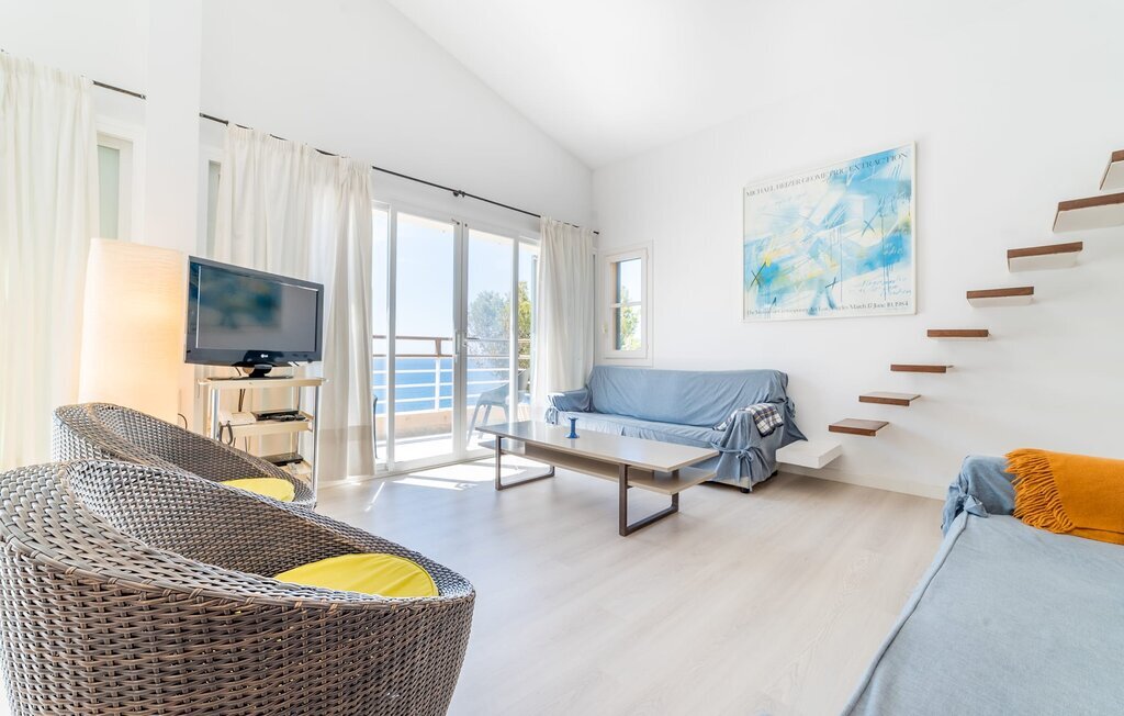 La villa Marblau de couleur crème offre une vue panoramique sur la mer, presque à portée de main. À droite, vous voyez la baie et le village de Canyamel. Vers la gauche, vous profitez d'une vue dégagée au loin, car la maison merveilleusement détendue se trouve sur le dernier rocher du lotissement construit. Vous pouvez ainsi découvrir la nature presque intacte des falaises couvertes de pins et profiter du spectacle inoubliable des vagues qui se brisent sur les falaises parfois assez abruptes. En raison de la pente, vous ne disposez que d'un espace extérieur limité, mais la petite pelouse devant les deux chambres à coucher du rez-de-chaussée offre un coin salon confortable avec une table et un espace chill pour les chaises longues à l'ombre des arbres. L'étage supérieur est également doté d'un balcon avec vue sur la mer, où vous pourrez savourer votre café matinal en contemplant la mer turquoise. Le bleu vif des volets et des cadres extérieurs prolonge cette coloration de manière appropriée. En raison de la proximité de la mer, il n'est pas nécessaire d'avoir un endroit artificiel pour se baigner ; il y a cependant une piscine commune assez grande et très bien entretenue qui peut être utilisée par tous les hôtes.