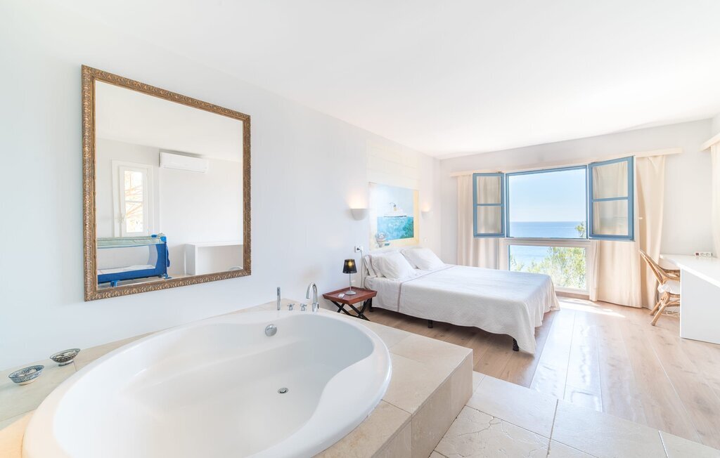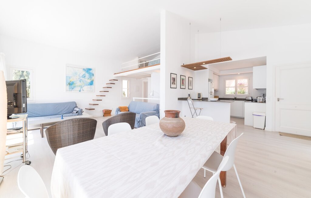 L'intérieur de cette charmante villa simple brille d'un blanc très tendance. Au niveau du balcon, on accède à une grande pièce qui réunit le salon, la salle à manger et la cuisine dans un style moderne. Les canapés clairs et les fauteuils ronds en osier invitent à une agréable soirée télé. La table à manger se trouve directement devant la cheminée - un détail intéressant dans cette maison qui peut être réservée toute l'année et qui assure une chaleur agréable en plus du chauffage central. La cuisine intégrée blanche et entièrement équipée est cachée dans une niche et séparée visuellement du salon par un comptoir. Même si vous ne rangez pas tout de suite après le dîner, cela ne dérangera personne et l'atmosphère détendue sera préservée. Le bar de style américain n'est pas seulement un endroit cool pour s'asseoir, il peut aussi aider à la préparation des repas. Un escalier en bois semble flotter dans la pièce. Il mène à une galerie ouverte, c'est pourquoi il y a un plafond merveilleusement haut. Au total, deux chambres à coucher (toutes climatisées) sont prêtes à accueillir un petit groupe de voyageurs. Les deux chambres premium situées au niveau inférieur sont chacune équipées d'une salle de douche en-suite très tendance. La particularité de ces deux suites est toutefois la luxueuse baignoire qui se trouve entre le lit et la salle de bains. La villa est donc idéale pour deux couples (si nécessaire, un lit bébé supplémentaire peut être réservé). En dehors de la haute saison, les prix sont toutefois si attractifs que cette somptueuse maison de plage peut également être utilisée par un couple de célibataires pour une escapade romantique.