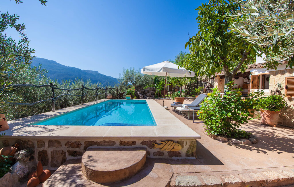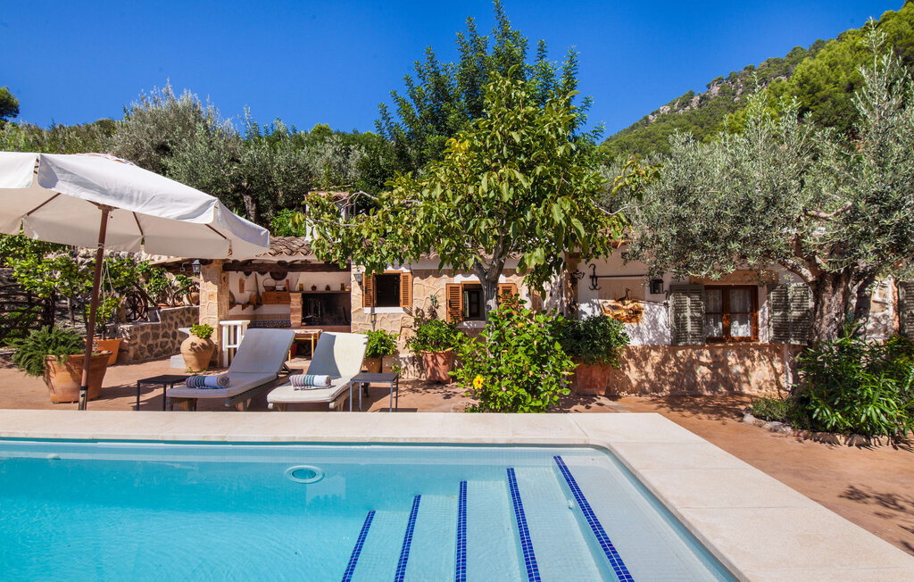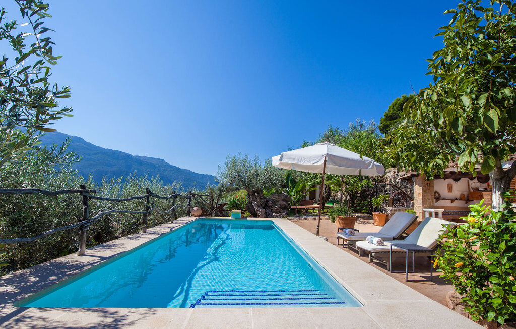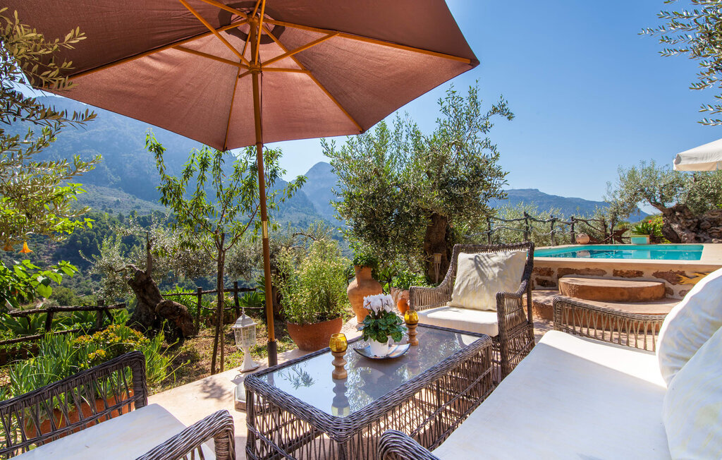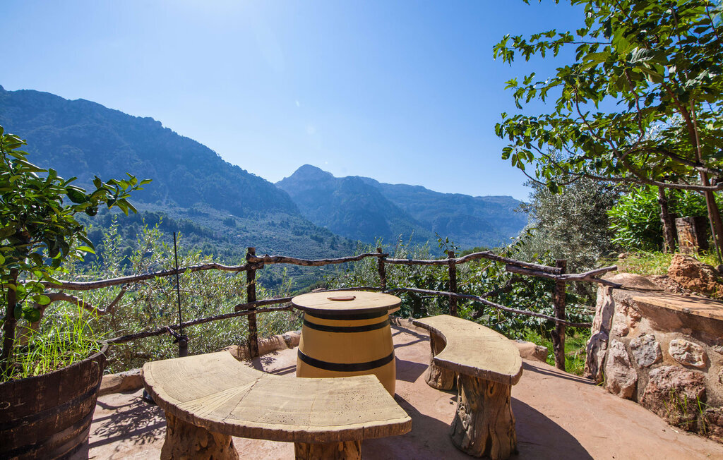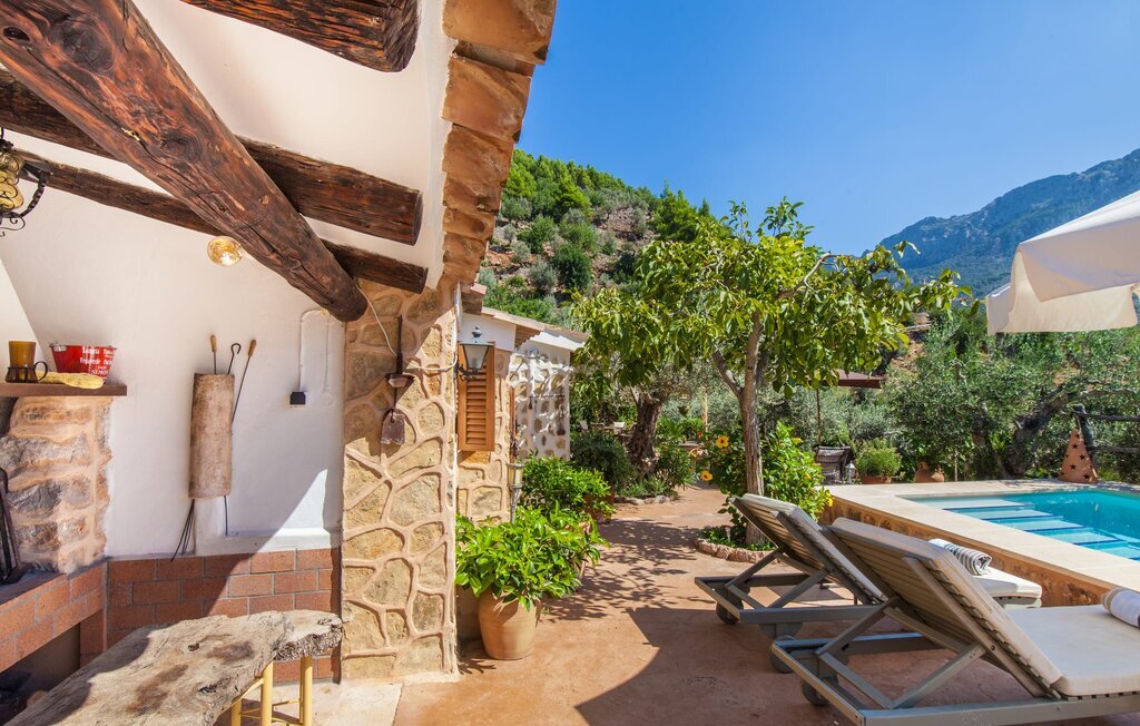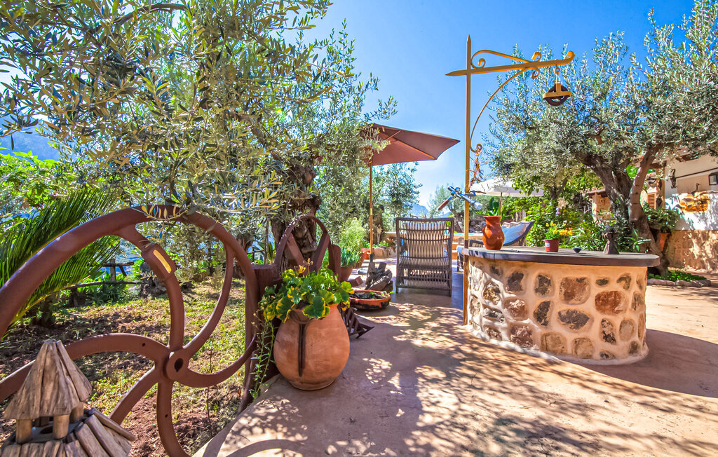 Cette retraite privée est idéale pour des vacances en solitaire ou une escapade romantique et offre des possibilités de promenades agréables et de détente au bord de la petite piscine. La villa offre une vue imprenable sur les montagnes de Tramuntana et le village pittoresque de Fornalutx, ainsi qu'un beau jardin qui s'étend jusqu'à l'horizon. L'espace extérieur dispose de plusieurs zones de détente, dont des meubles en osier confortables près de la fontaine et un coin repas à l'ombre d'un parasol, complétés par un barbecue en pierre massif qui souligne l'atmosphère.