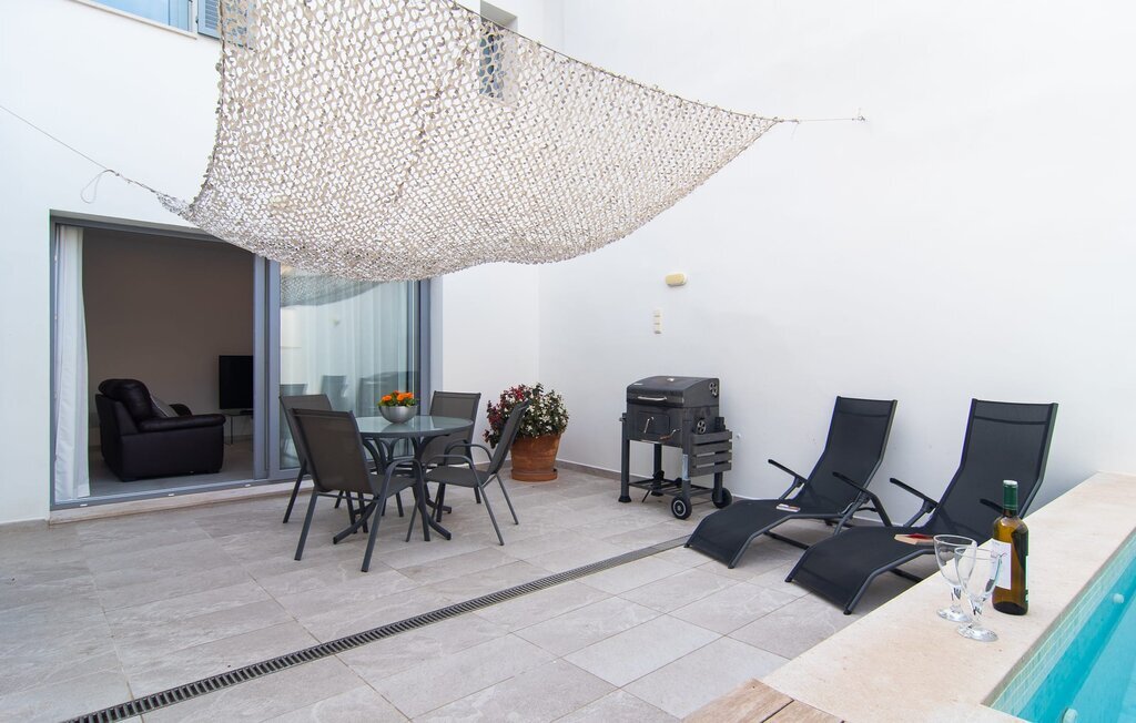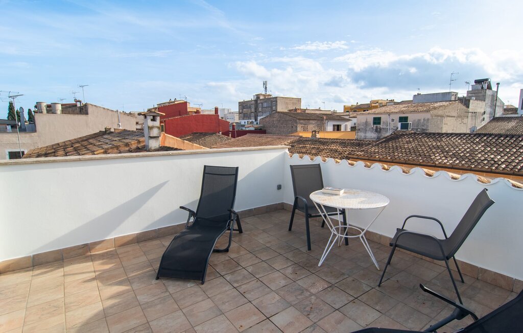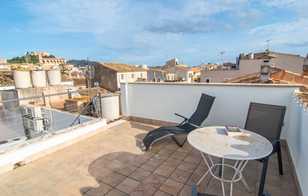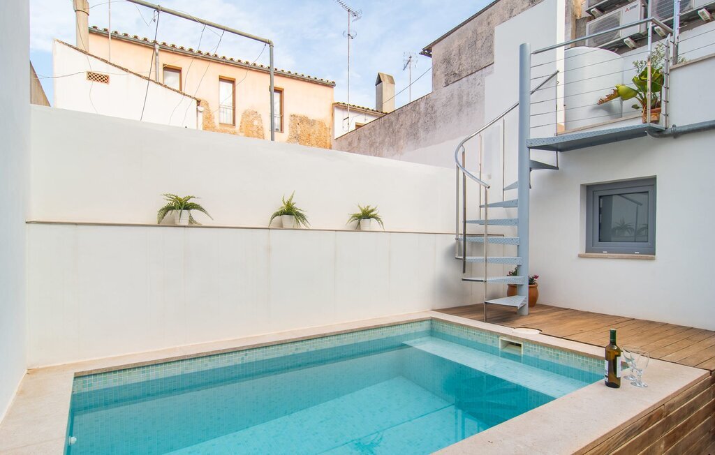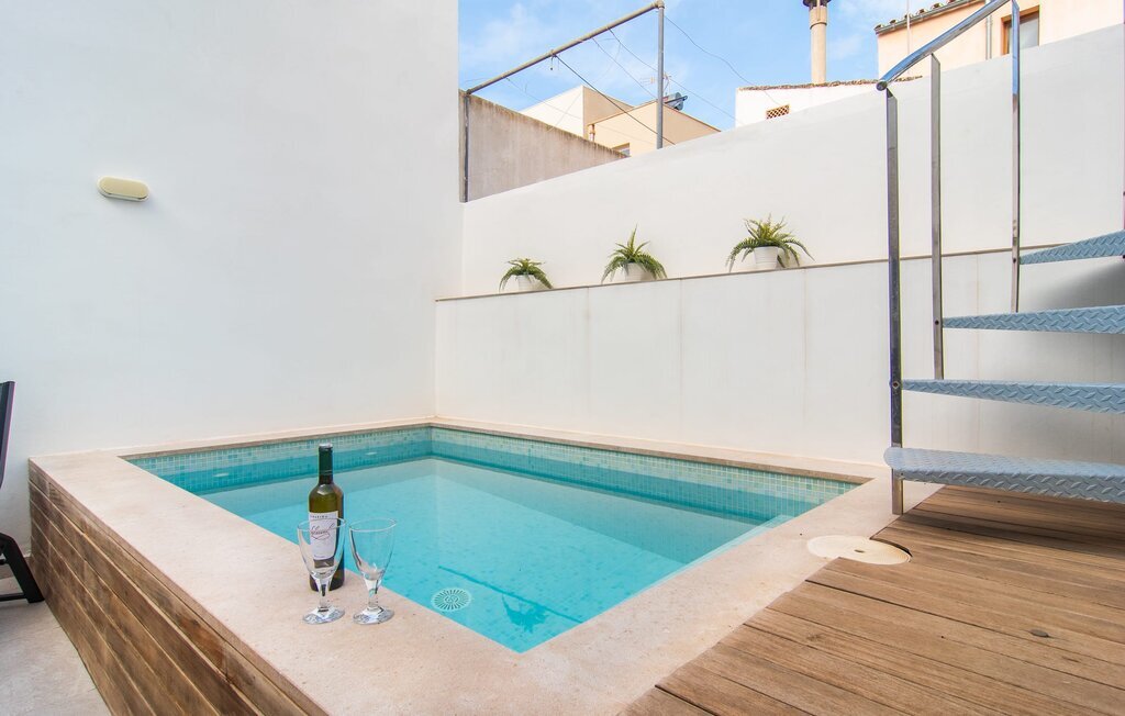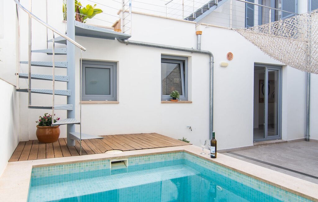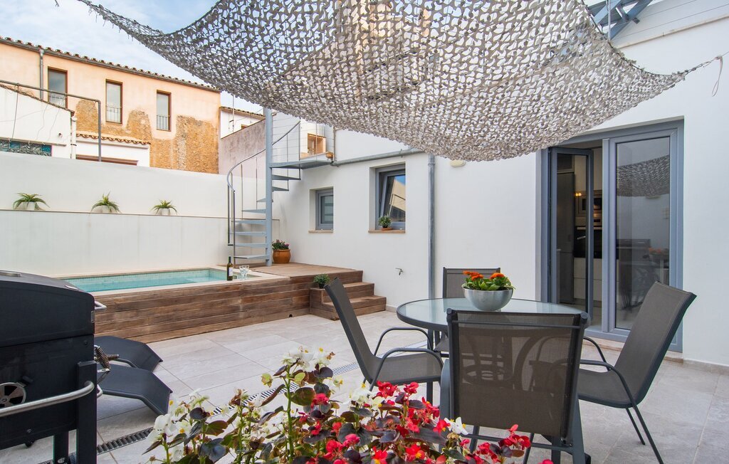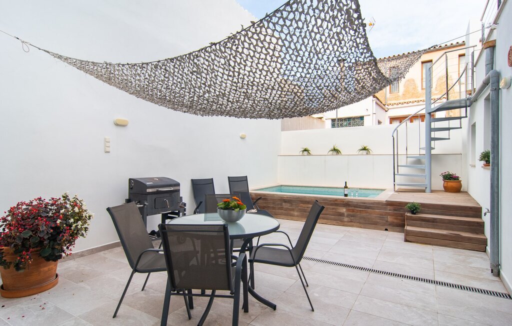 Le patio se prête parfaitement à la vie en plein air, avec une table à manger pour des repas conviviaux, des chaises longues confortables pour se détendre et un barbecue moderne au charbon de bois pour les grillades. La piscine et son espace à bulles offrent des moments rafraîchissants, tandis que la combinaison de jolis carreaux et de bois crée une atmosphère accueillante. Un escalier en colimaçon permet d'accéder à la terrasse sur le toit, d'où l'on a une vue imprenable sur les toits d'Artà.