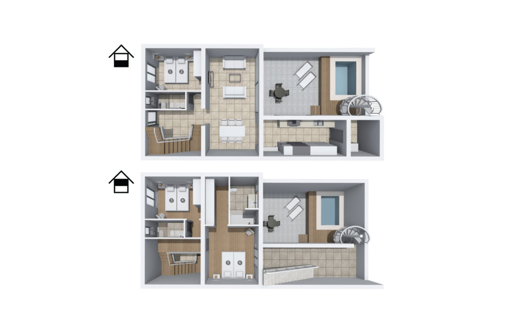 À l'intérieur, la maison de ville continue d'impressionner par son design moderne et aéré. Le grand espace ouvert du salon et de la salle à manger ainsi que la cuisine en forme de L se trouvent au rez-de-chaussée. La cuisine entièrement équipée offre tout ce dont vous avez besoin pour cuisiner vous-même pendant votre séjour. Une chambre à coucher et une salle de douche se trouvent également à ce niveau. À l'étage, deux autres chambres à coucher avec leur propre salle de douche offrent confort et harmonie de couleurs. Avec le chauffage et la climatisation chaud/froid, cette maison est idéale en toute saison pour des vacances reposantes.