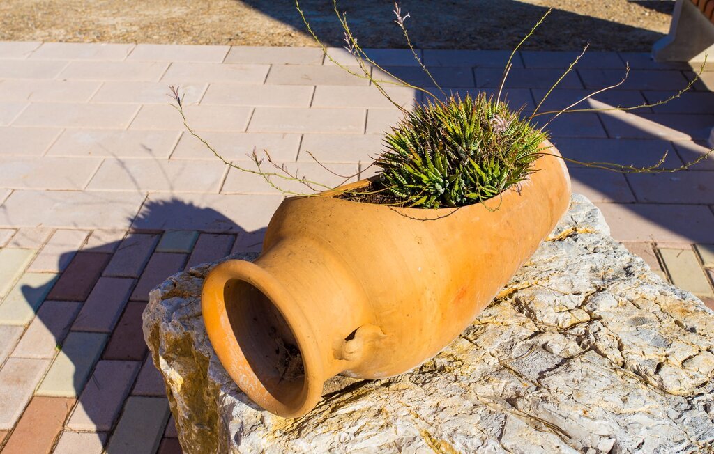La villa traditionnelle Saraix, orientée vers le sud, a été entièrement restaurée en 2014. La villa, baignée de soleil, nous accueille chaleureusement dans une douce couleur terre cuite sur un terrain entouré de pins. Entre la villa et la piscine se trouve une terrasse ensoleillée avec un total de 8 chaises longues et 1 parasol. Sur les chaises longues, vous pouvez profiter du chaud soleil du sud après la baignade ou regarder vos enfants jouer dans la piscine. Un banc en bois et une table en polyrattan avec des chaises confortables et des coussins vert pomme vous permettront de passer des moments conviviaux. Sous une terrasse couverte du côté de la maison, il y a un autre coin salon extérieur avec des meubles en bois et les mêmes coussins verts excitants, ainsi qu'un autre banc en bois à l'ombre. Si vous réunissez les deux ensembles, vous pourrez profiter d'un barbecue divertissant, car chacune des deux terrasses dispose d'un barbecue entouré de murs. Un escalier extérieur situé sur le côté de la maison permet d'accéder à l'étage supérieur. Au-dessus de la terrasse sur le toit, on passe par une sorte de pièce en forme de tour, conçue comme un salon supplémentaire pour chiller ou comme salle de lecture, et qui offre une belle vue sur la structure rurale des environs et du terrain. La villa Saraix est pour nous un point fort particulier. Le terrain qui fait partie de la villa est en fait beaucoup plus vaste, ce qui permet de faire de longues promenades sur le site. Les moutons, les cochons et les poules sont encore élevés à une certaine distance de la maison, ils ne peuvent bien sûr pas atteindre la Villa Saraix. Vous pouvez profiter du calme et de l'espace de la campagne.