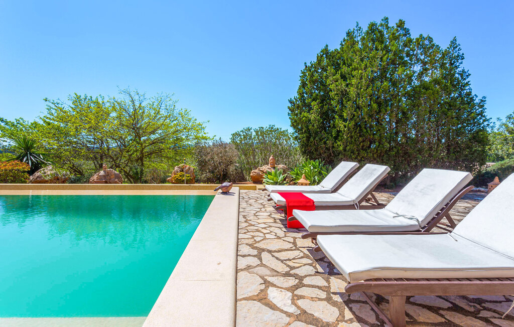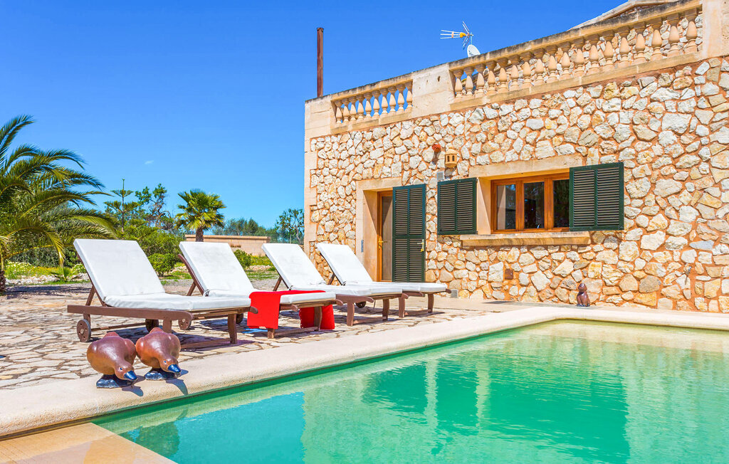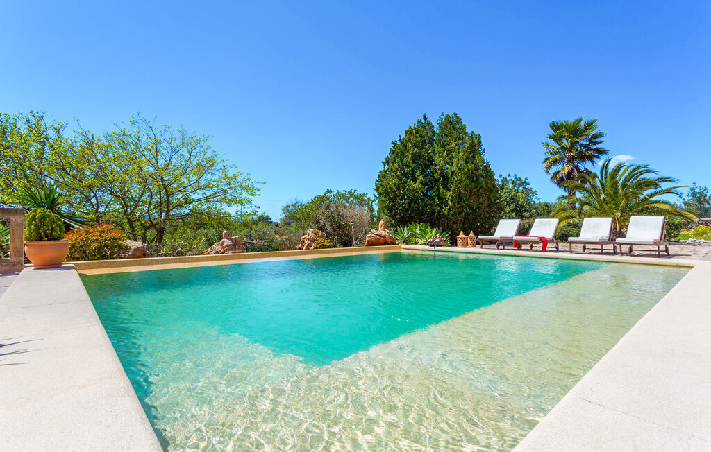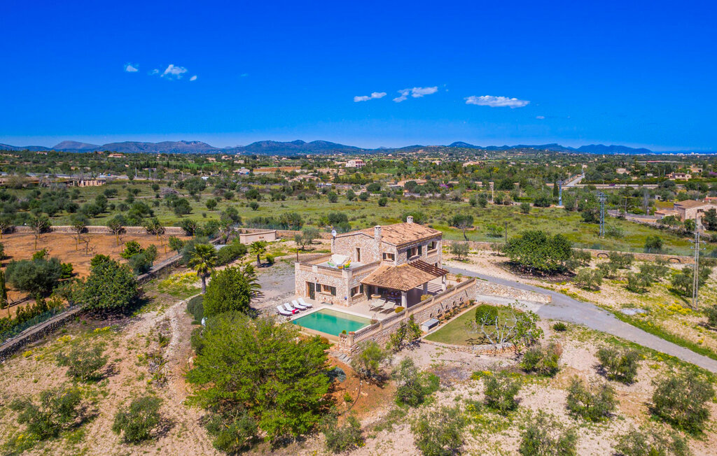 La maison de vacances moderne Son Ropit avec sa belle façade en pierre jouit d'une situation surélevée sur une légère colline dans la plaine rurale près de la côte est de Majorque. La maison, l'espace piscine et les terrasses bénéficient d'une vue magnifique sur le paysage près de Portocristo jusqu'à la mer. La spacieuse finca pour 6 personnes est entourée d'un terrain bien entretenu avec la végétation la plus typique de l'île. Son accès privé passe au milieu et se termine par un parking pour plusieurs voitures derrière la maison. Sur le côté de la maison se trouve une belle terrasse ensoleillée, surélevée et orientée au sud-est. Ici, des chaises longues confortables et une grande piscine peu profonde vous invitent à prendre des heures de soleil. Pour des siestes reposantes et des repas conviviaux à l'ombre, une grande terrasse couverte avec un barbecue mobile est à votre disposition. Vous apprécierez particulièrement cet endroit agréablement éclairé pendant les douces nuits d'été.
