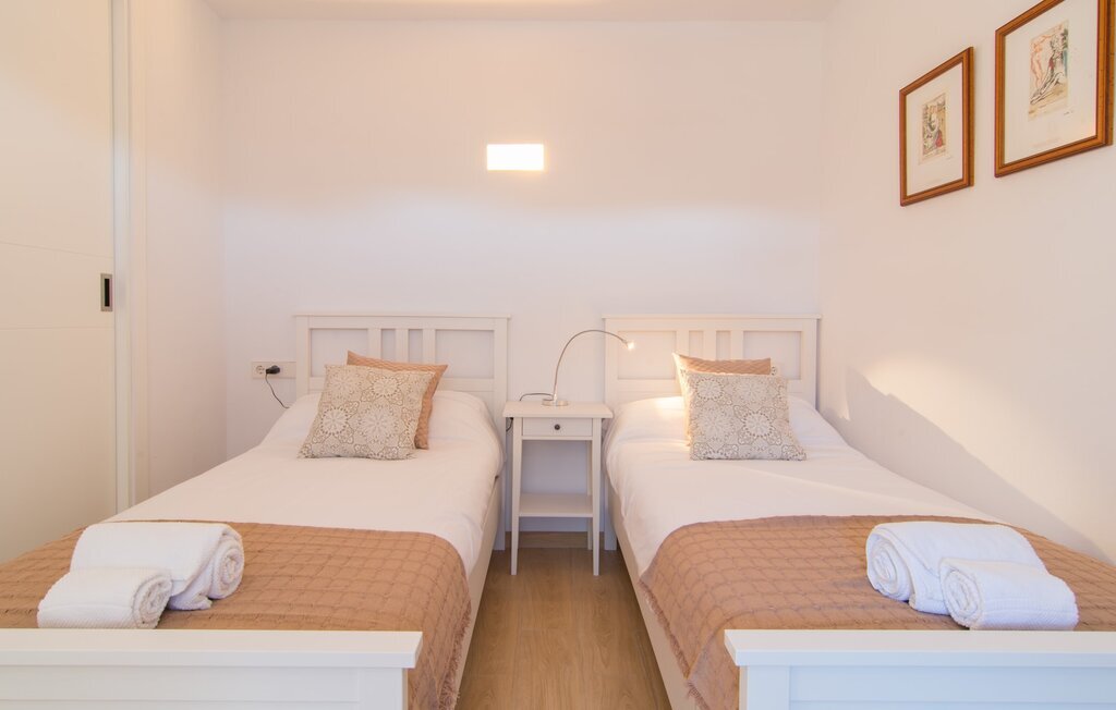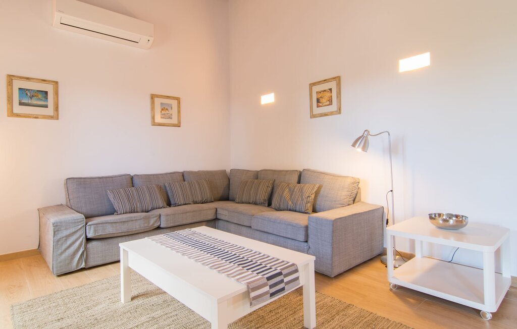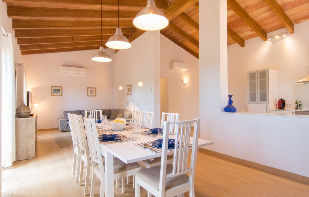 Toutes les pièces de cette propriété de 150 m² se trouvent au rez-de-chaussée. L'espace de vie, avec son design moderne et lumineux, son canapé confortable et sa grande table à manger, est directement relié à la cuisine ouverte. Les plafonds à poutres en bois, les meubles blancs, les tons de beige et de gris ainsi que les sources de lumière indirectes créent une atmosphère accueillante. Un grand téléviseur à écran plat est également disponible. Ceux qui préfèrent surfer sur Internet sans volume de données peuvent se réjouir de la connexion WLAN : vous pouvez ainsi partager immédiatement vos photos de vacances avec vos proches restés à la maison. La cuisine avec coin bar dispose d'un grand réfrigérateur, d'un four et d'un four à micro-ondes. Les trois chambres à coucher de la villa sont décorées dans des couleurs claires. Deux chambres disposent de lits doubles, de salles de bains privées et de petites terrasses. L'autre chambre dispose de deux lits simples et d'une salle de bain avec douche de plain-pied. Grâce à la climatisation, vous pouvez régler la température dans toutes les chambres à coucher, ce qui vous permet de ne pas transpirer même en cas de forte chaleur.