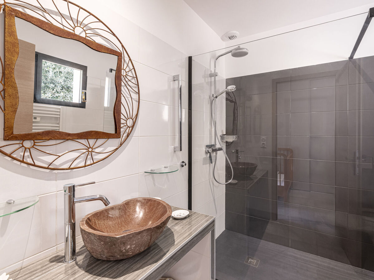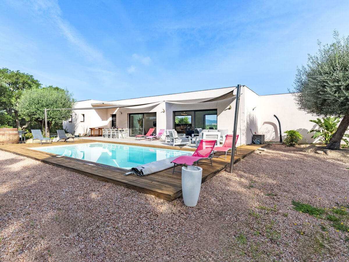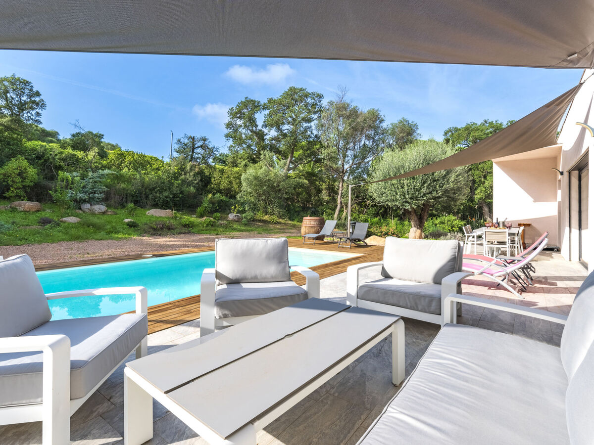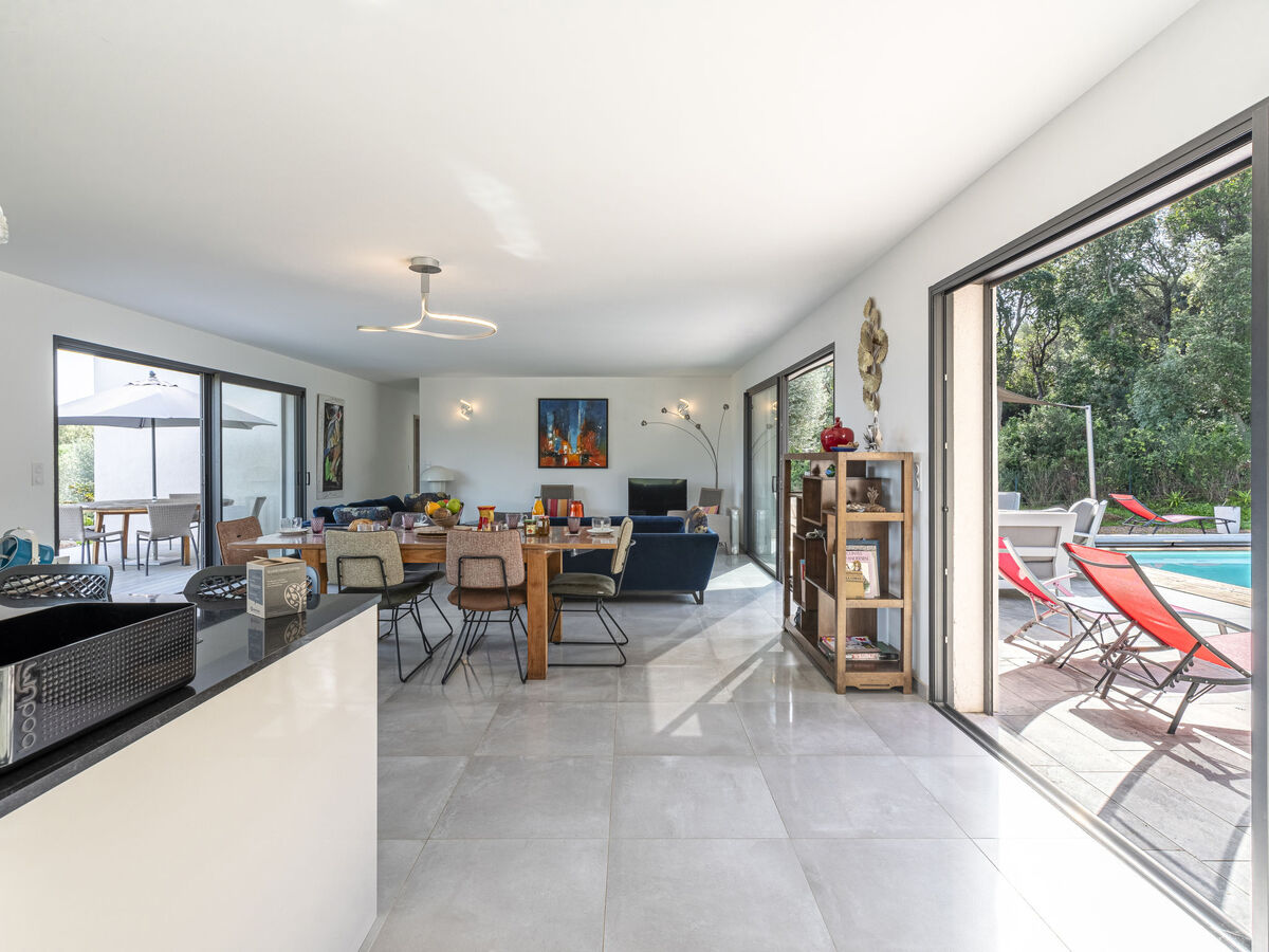 Sortie sur la terrasse, sur la piscine, orientée nord et orientée sud.