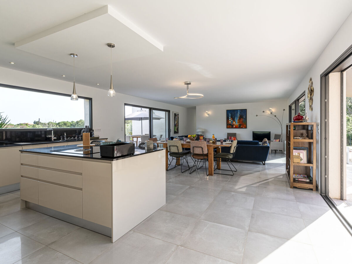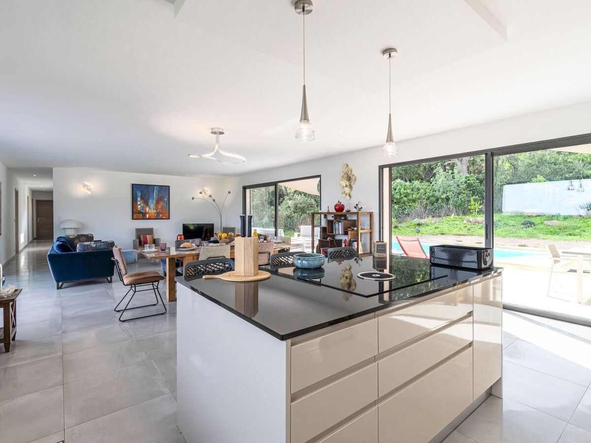 Cuisine ouverte (four, lave-vaisselle, 4 plaques à induction, grille-pain, bouilloire électrique, micro-ondes, congélateur, cafetière électrique, ilot de cuisine).