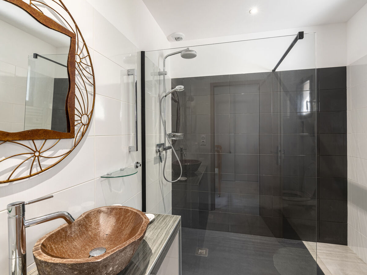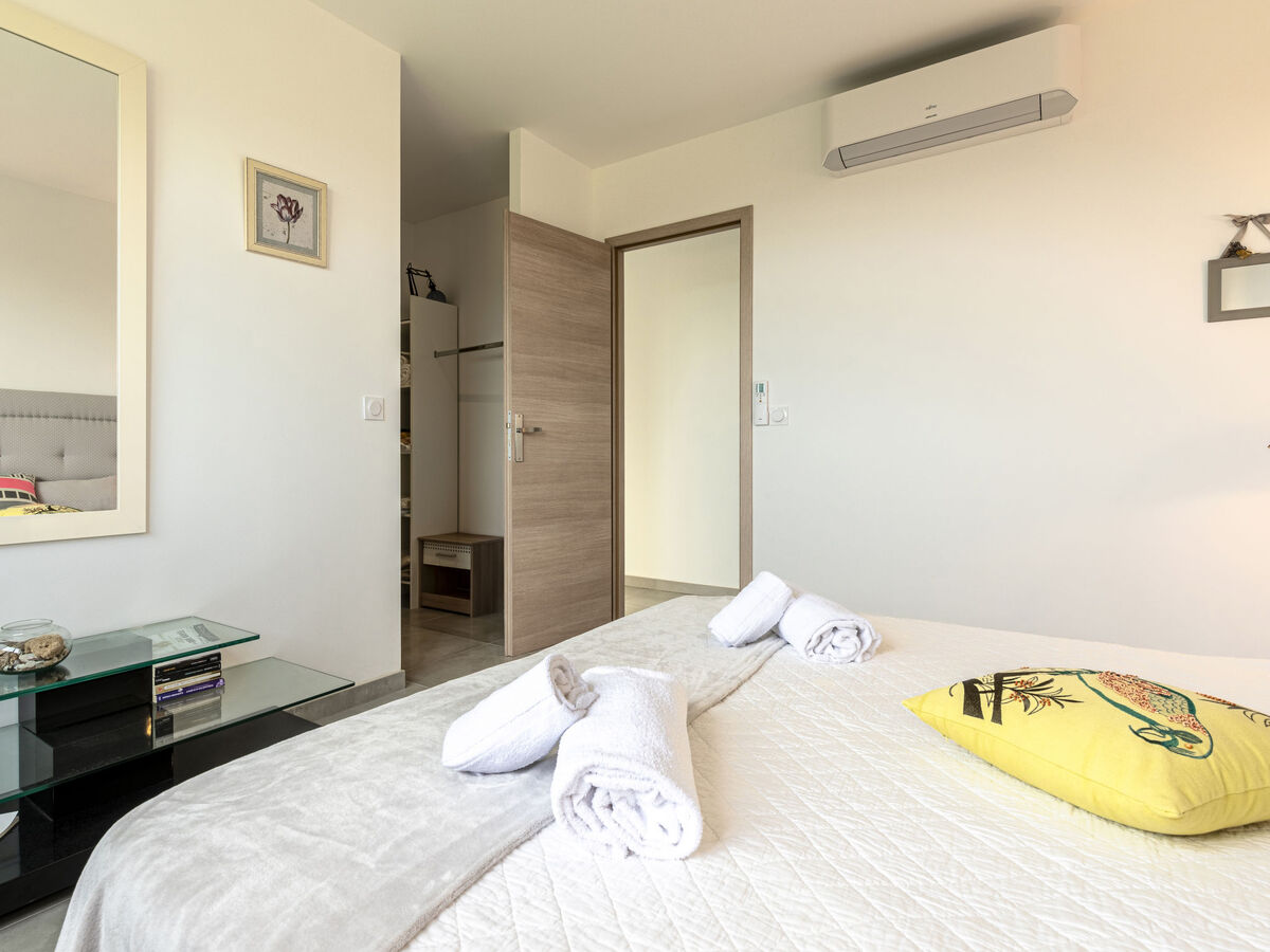 1 grande chambre avec Dressing avec 1 grand-lit (160 cm, longueur 200 cm), douche/WC et air-conditionné.