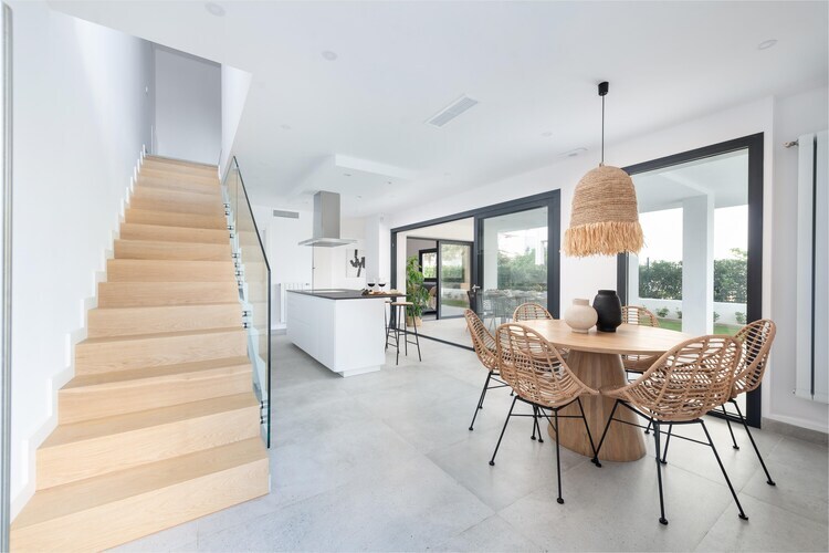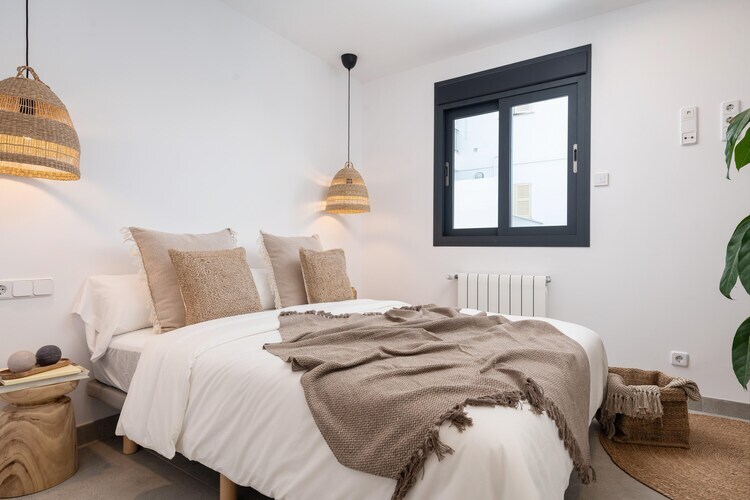 La maison à deux étages est soigneusement décorée pour une atmosphère chaleureuse. Depuis le porche, vous entrez dans la cuisine-salle à manger, équipée d'une cuisinière à induction, qui mène au salon spacieux avec climatisation et Smart TV. Le rez-de-chaussée dispose également d'une buanderie avec lave-linge, sèche-linge, fer et planche à repasser, ainsi que de toilettes pratiques. A l'étage, vous trouverez trois chambres avec salle de bains privative, toutes climatisées. Deux chambres ont des lits doubles et la troisième des lits jumeaux. Le chauffage central au gaz assure le confort pendant les mois les plus frais. La maison est également équipée d'un lit bébé et d'une chaise haute pour les familles.