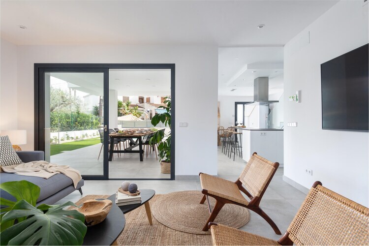 Salle de séjour, cuisine(plaque de cuisson, cafetière/percolateur), chambre(2x lit simple), chambre(lit double), chambre(lit double), salle de bains, salle de bains, salle de bains, salle de bains, four, micro ondes, lave-vaisselle , combinaison réfrigérateur/congélateur, douche, douche, douche, lavabo, lavabo, lavabo, lavabo, WC, WC, WC, WC, balcon ou terrasse, climatisation, climatisation, climatisation, jardin, mobilier de jardin, 6x transats, barbecue, piscine, lit d'enfant, chaise haute