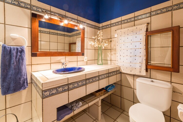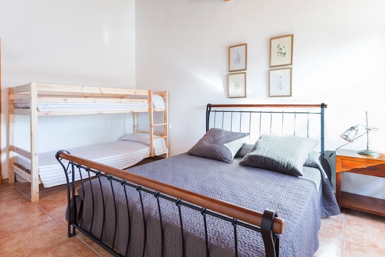 La casa rústica de 340 m2 distribuidos en dos plantas, dispone de cinco habitaciones, cuatro de ellas en la 1ª planta. Tres habitaciones con dos camas dobles y una habitación con una cama doble y litera; la quinta habitación se encuentra en la PB y cuenta con una cama individual. Hay disponibilidad para una cuna y una trona. Uno de los dormitorios dispone de baño en suite con ducha y bañera, a parte hay dos baños que dan servicio a toda la casa, uno del a PB con ducha y una en la 1ª planta con bañera.