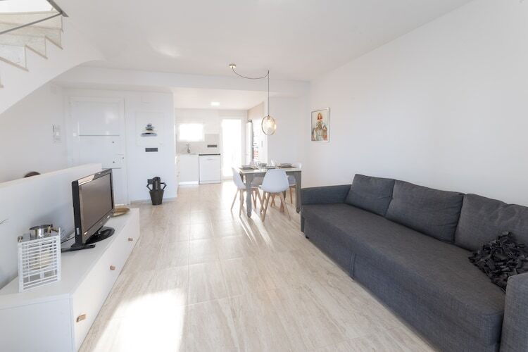 Le logement dispose d'une pièce spacieuse et confortable où se trouvent le salon, -avec climatisation et télévision-, la salle à manger et la cuisine. La cuisine dispose d'une plaque à induction et de tout le nécessaire pour cuisiner. A l'étage, vous trouverez la salle de bain de la maison -avec douche- et deux chambres avec placard et ventilateur chacune. L'une d'elles dispose d'un lit double, d'un accès à un balcon avec vue sur la mer et d'un espace pour un lit bébé (une chaise haute est également disponible). L'autre chambre dispose d'un lit gigogne. Vous trouverez également une machine à laver, un fer et une planche à repasser.