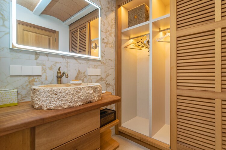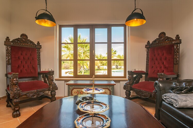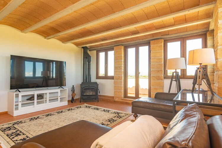 El interior de la casa se divide en dos plantas y tiene calefacción central de gasoil. Con un estilo señorial, en la planta baja encontrarán una bonita sala abierta al comedor y a la cocina, que es de gas, y dispone de todos los utensilios necesarios para que cocinen con comodidad. A la hora de dormir, en esta planta disponen de 3 dormitorios con ventilador. El primero tiene cama doble, acceso directo a una pequeña terraza independiente en el jardÃn y baño en suite con ducha. El segundo, una cama nido con capacidad para dos personas y el tercero una cama doble, vestidor y baño en suite con ducha. Mediante las escaleras accederán a la planta superior, donde encontrarán el cuarto dormitorio, que tiene cama doble, dos terrazas y baño en suite con ducha. Pueden utilizar esta estancia como un dormitorio o usarla como una segunda sala de estar, ya que dispone de Smart TV y de cómodas butacas. Podrán utilizar la lavadora, secadora, plancha y tabla para planchar que encontrarán en el alojamiento. Si viajan con su bebé, podemos proporcionarles una cuna y una trona.