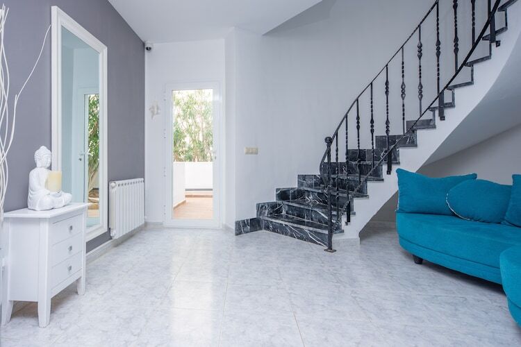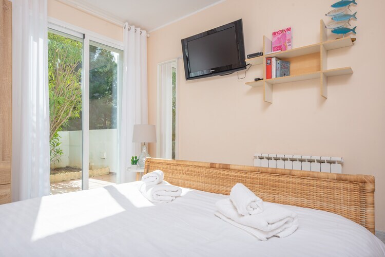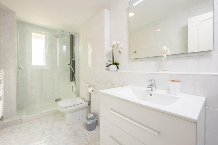 À l'intérieur, la villa allie confort et élégance. Le rez-de-chaussée comprend un salon-salle à manger confortable avec Smart TV, poêle à granulés et climatisation, ainsi qu'une cuisine ouverte avec plaques vitrocéramiques. L'étage supérieur abrite une chambre double avec salle de bain attenante et toilettes invités. Les deux niveaux inférieurs offrent trois autres chambres doubles avec Smart TV, placards et terrasses privées, ainsi qu'une quatrième chambre avec accès à la véranda. Trois salles de bain supplémentaires et une buanderie complète garantissent votre confort.