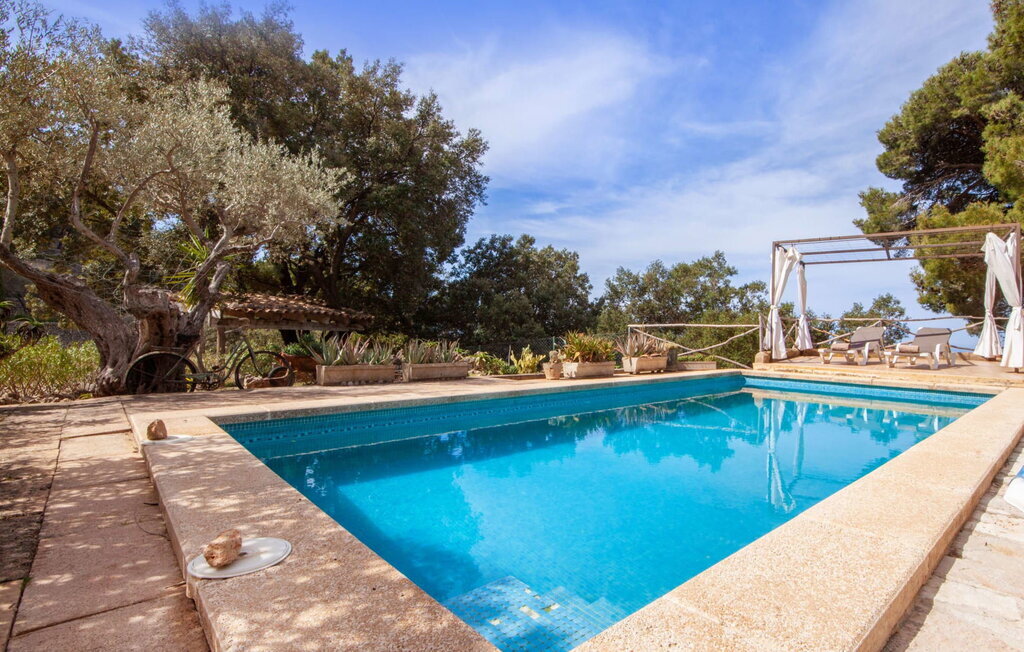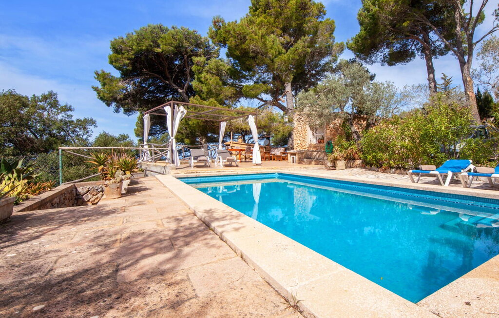 Des terrasses à plusieurs étages mènent à un grand espace piscine sur le côté sud de la maison. Le long de la façade, un balcon spacieux permet de profiter de la vue sur la mer et de se détendre en lisant un livre ou en dégustant un verre de vin de Majorque de qualité. La piscine, accessible par des marches, est carrelée de mosaïques bleues. À l'approche du soir, on ne manquera pas d'allumer le barbecue pour un dîner copieux. Un parking se trouve juste à côté de la maison.