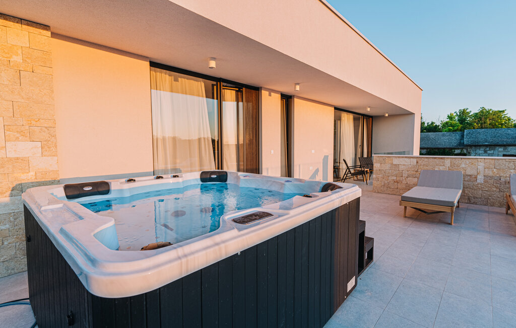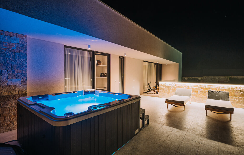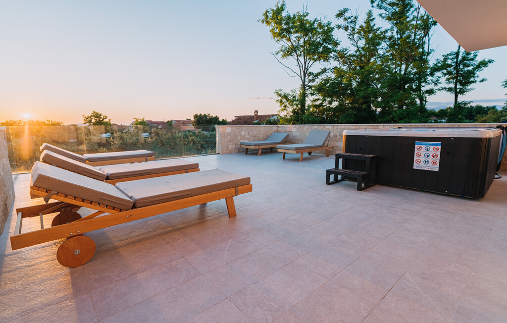 Bien-être à l'extérieur : Location de vacances disposant de chaises-longues et d'un ou plusieurs équipements tels que piscine extérieure, jacuzzi extérieur, lit à baldaquin de jardin etc...