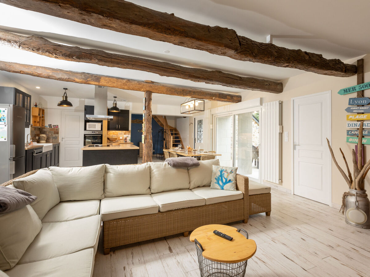 Aménagement confortable et de bon goût: grand séjour/salle à manger avec TV (écran plat).