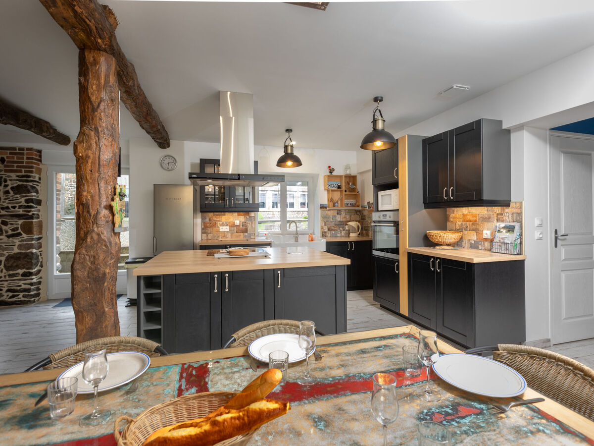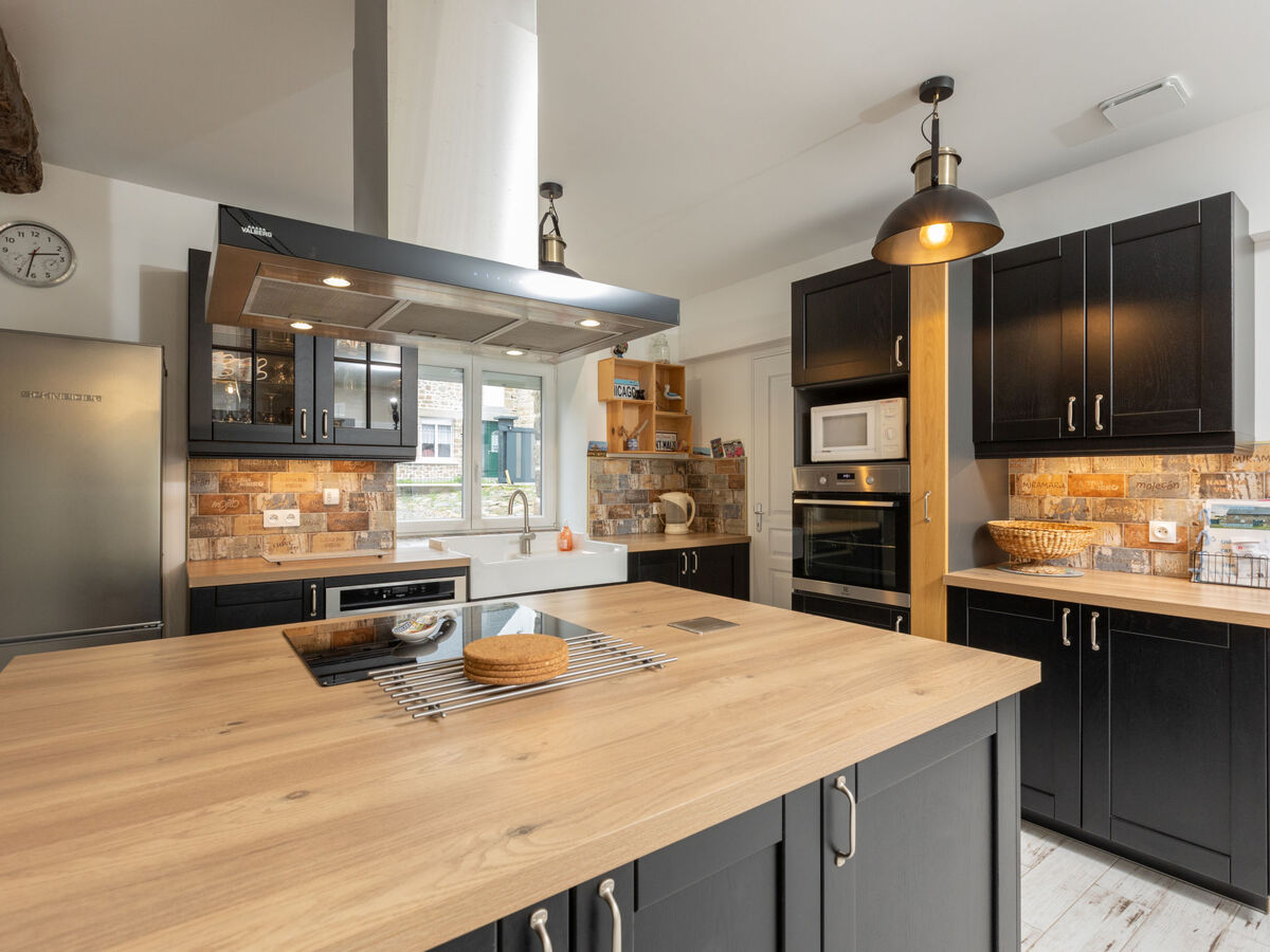 Cuisine ouverte (four, lave-vaisselle, 4 plaques à induction, grille-pain, bouilloire électrique, micro-ondes, congélateur, cafetière électrique, Capsules pour machine à café (Senseo) (NON INCLUSES), ilot de cuisine).