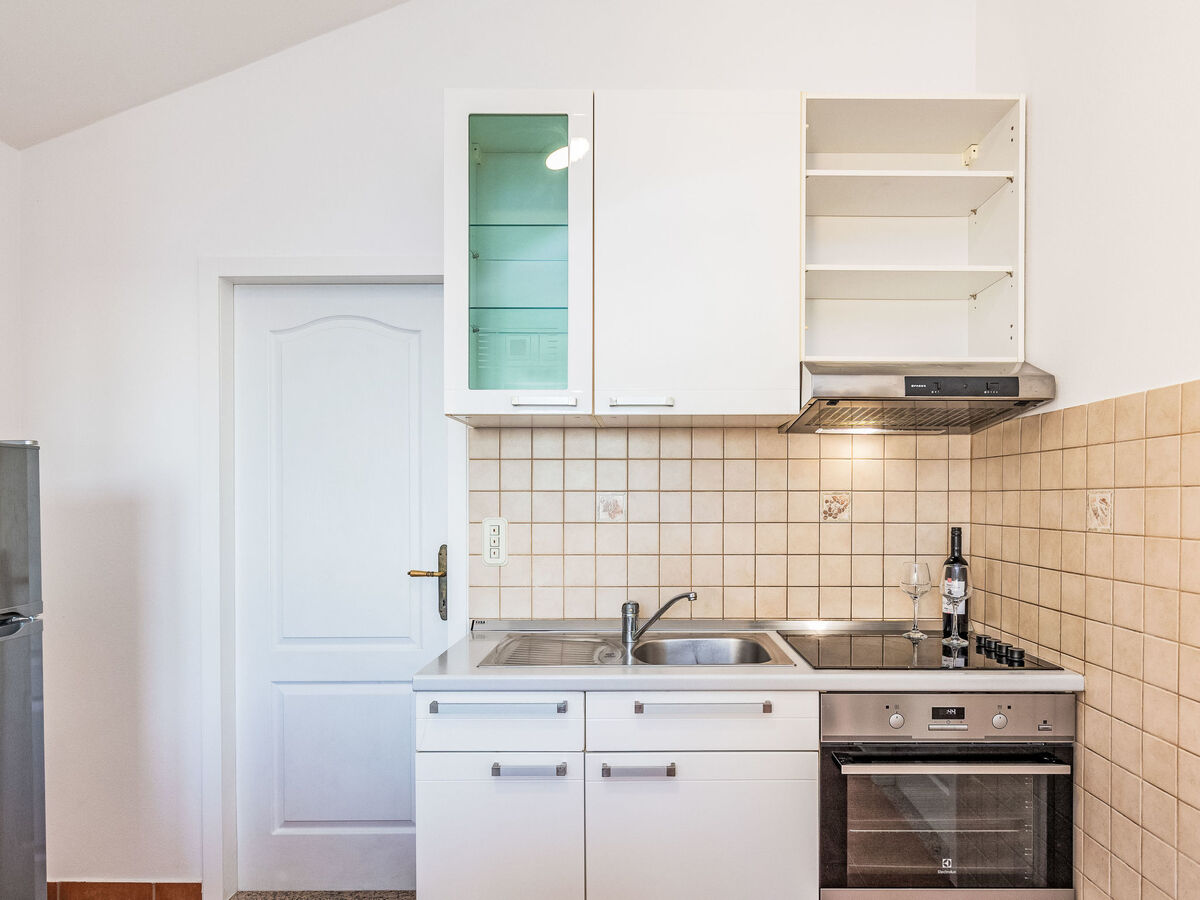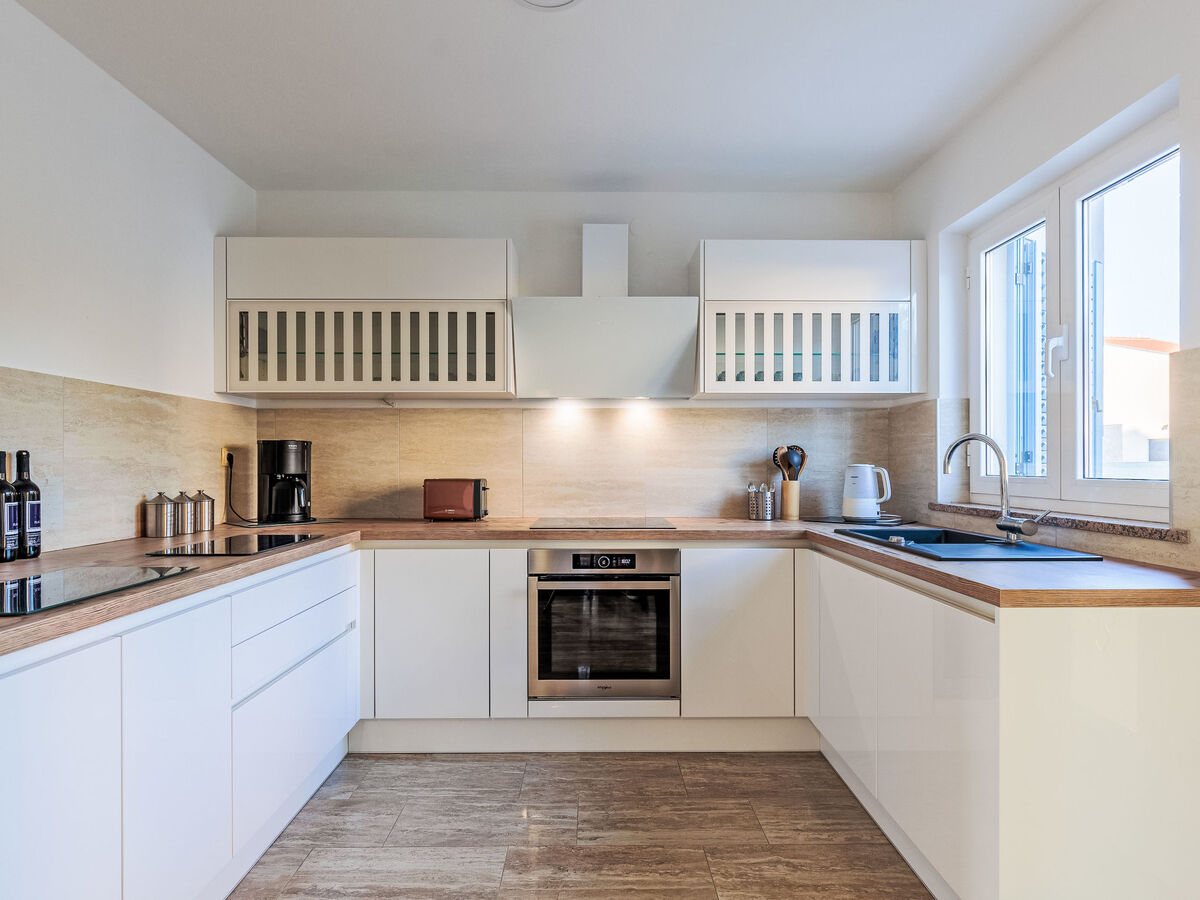 Petite cuisine (4 plaques de cuisson, four, congélateur) avec TV (satellite) et air-conditionné.