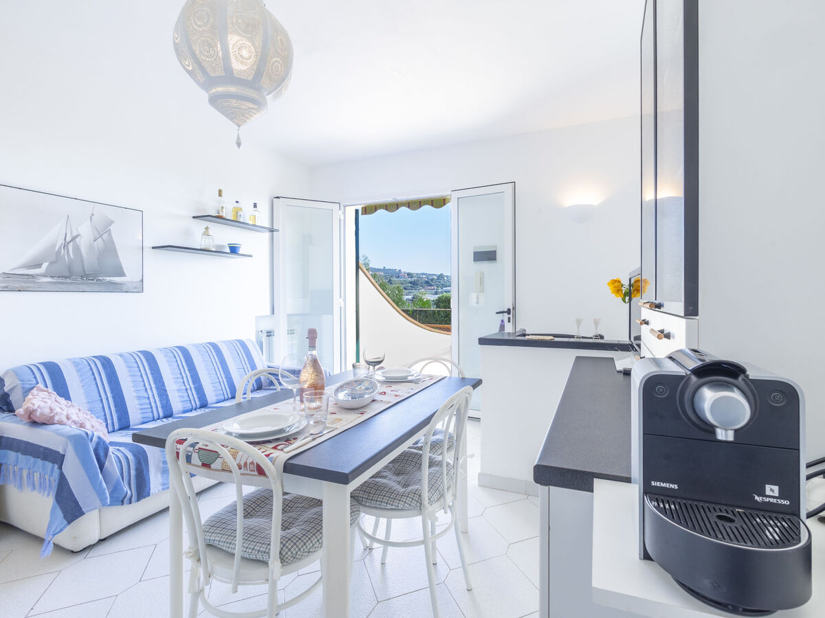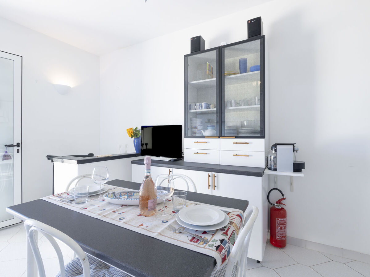 Coin cuisine (four, lave-vaisselle, 4 feux, grille-pain, bouilloire électrique, congélateur, cafetière électrique, Capsules pour machine à café (Lavazza)) avec table pour les repas, TV (satellite).