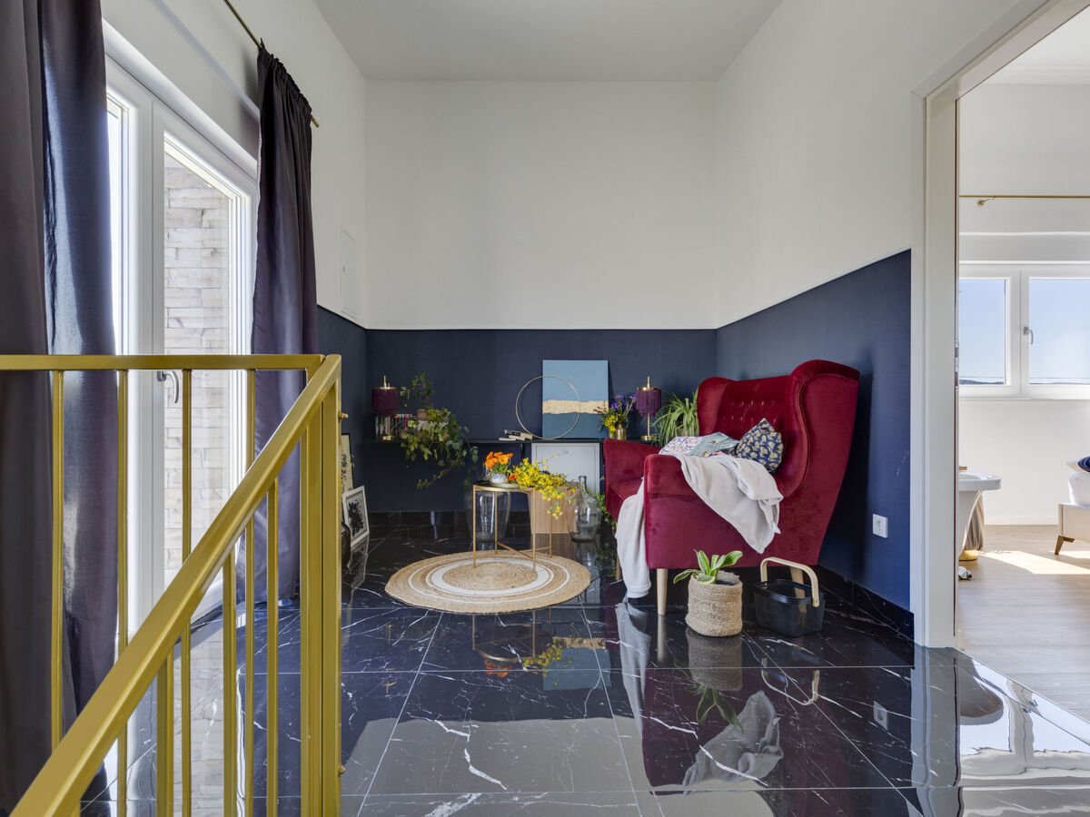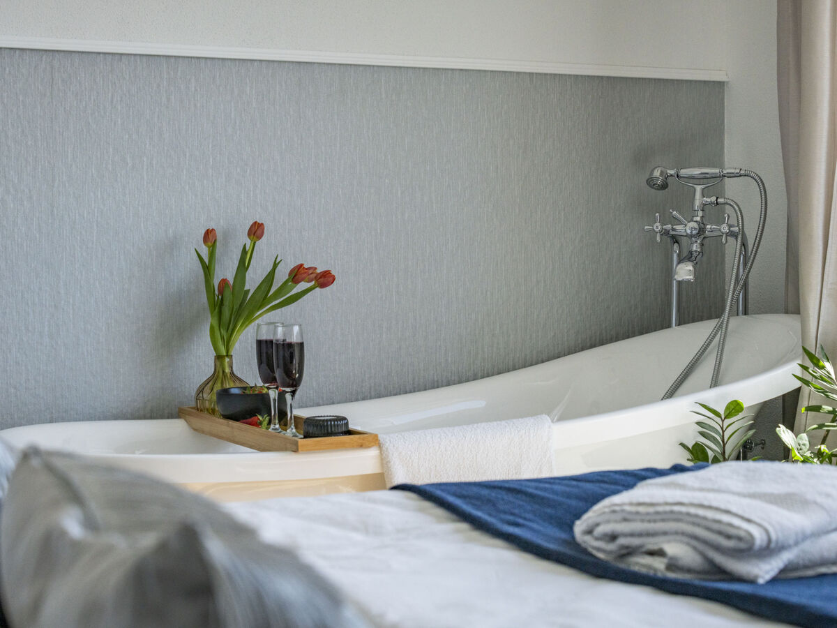 À l'étage supérieur: 1 chambre avec 1 grand-lit (160 cm, longueur 200 cm), baignoire sabot et air-conditionné.