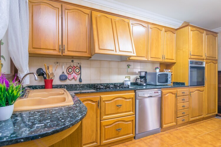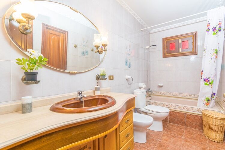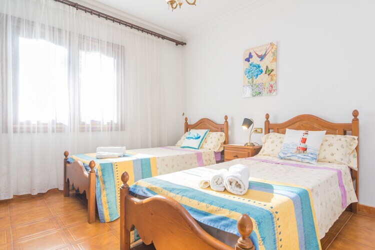 À l'intérieur, vous trouverez un grand salon-salle à manger, de style traditionnel mais très confortable, avec deux canapés confortables pour regarder la télévision par satellite ou discuter ensemble. Veuillez noter que la cheminée est décorative. Ensuite, il y a une grande cuisine, équipée d'une plaque de cuisson au gaz, d'un four, d'un micro-ondes, d'un lave-vaisselle, de longs plans de travail et d'une table et de chaises si vous trouvez plus pratique de manger ici. Derrière la porte de la cuisine se trouve la buanderie avec lave-linge, fer et planche à repasser et l'escalier menant à l'étage supérieur. Pour se reposer, il y a cinq chambres, dont quatre avec placards. Au rez-de-chaussée, il y en a deux avec deux lits simples et un ventilateur, ainsi qu'une salle de bain avec baignoire qui dessert l'étage. A l'étage se trouvent les autres chambres, deux avec un lit double et une avec un lit simple, ainsi que deux salles de bains, une avec baignoire et une avec douche, et un deuxième salon avec climatisation.