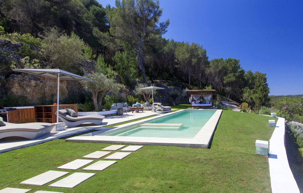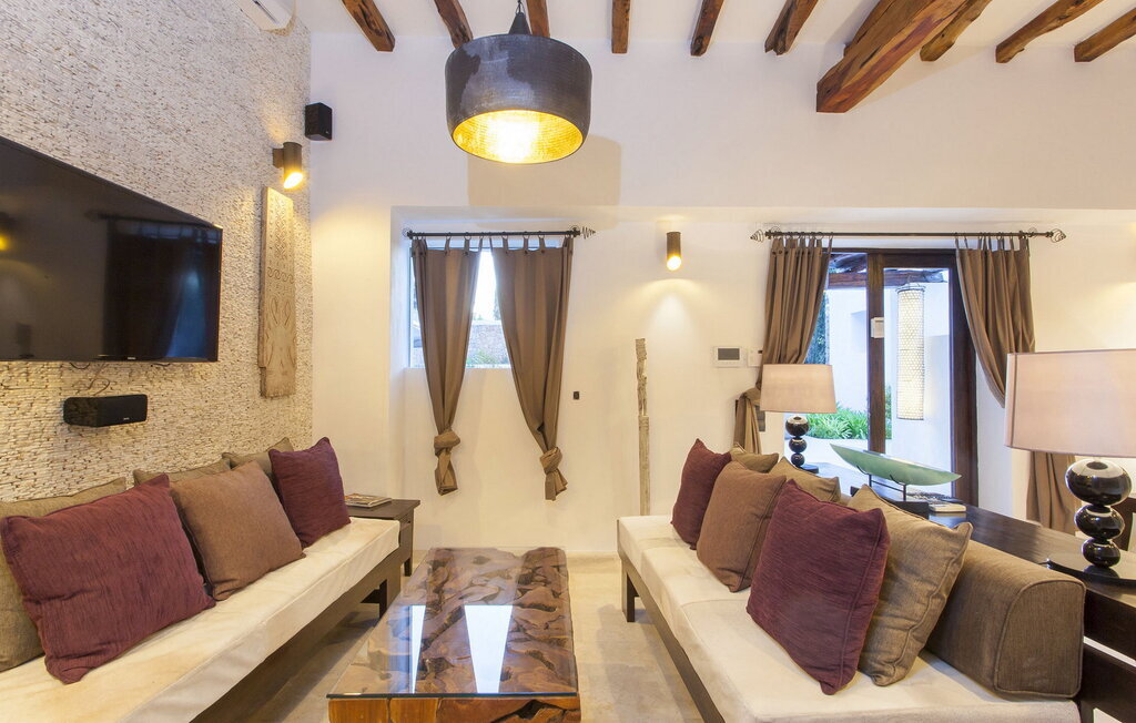 Belle maison de luxe de style Ibiza de 300 m2 sur un terrain d'environ 17.500m2 au nord de l'île, tout près de l'Agroturismo Atzaró. Dans une zone très calme et unique d'Ibiza. Superbe vue panoramique sur la vallée de la Morna depuis l'espace piscine. Santa Eulalia se trouve à 10 minutes en voiture.