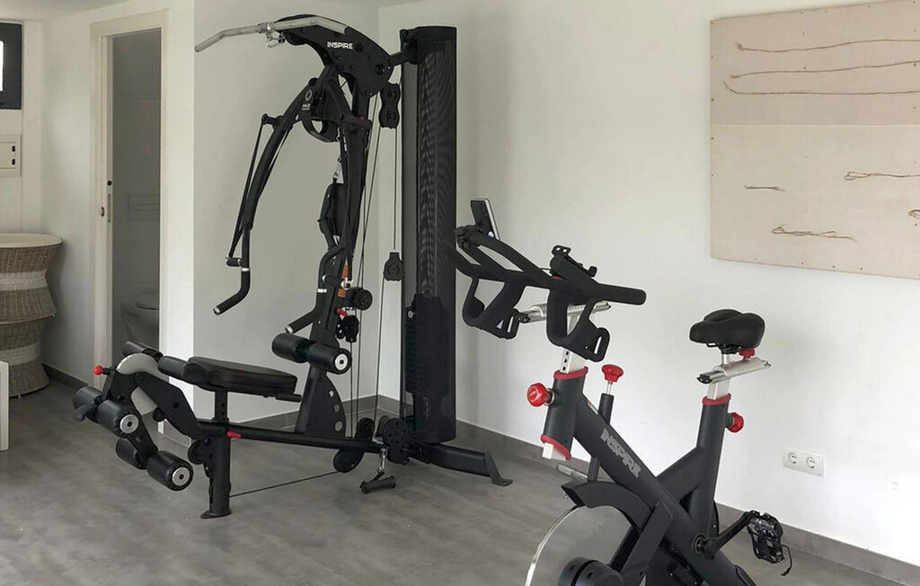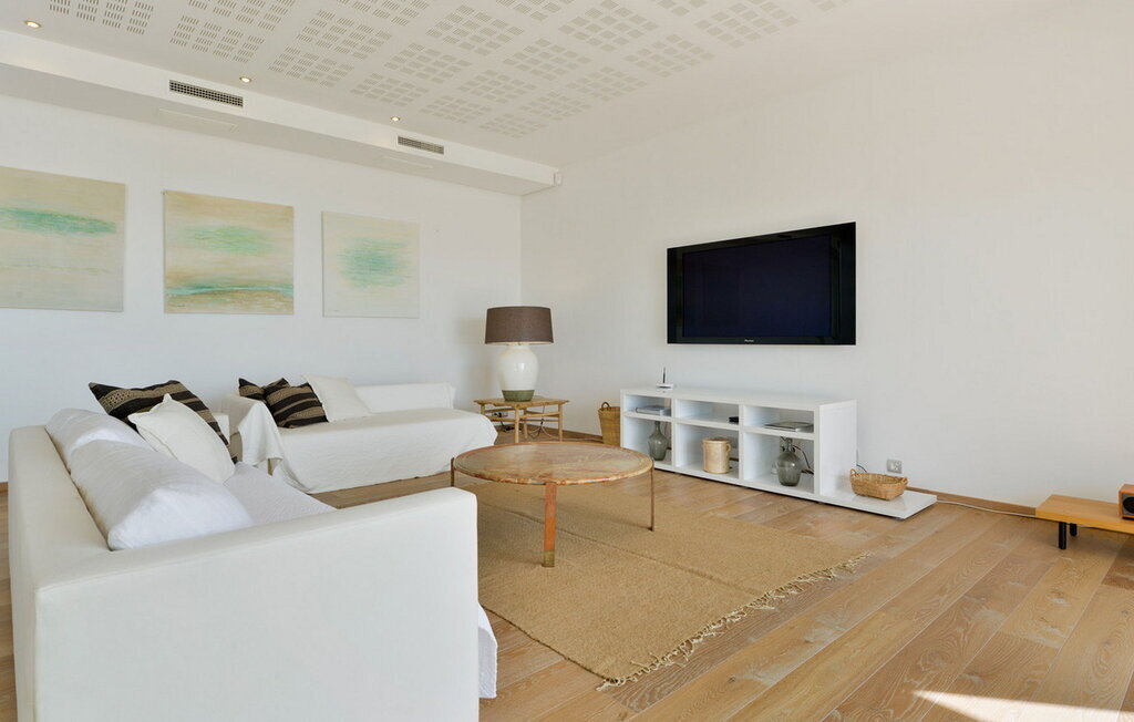 Le niveau inférieur dispose d'un coin salon avec de grandes fenêtres donnant sur la piscine et d'un canapé-lit double pour les invités supplémentaires. Une petite salle de fitness avec toilettes se trouve également à cet étage.